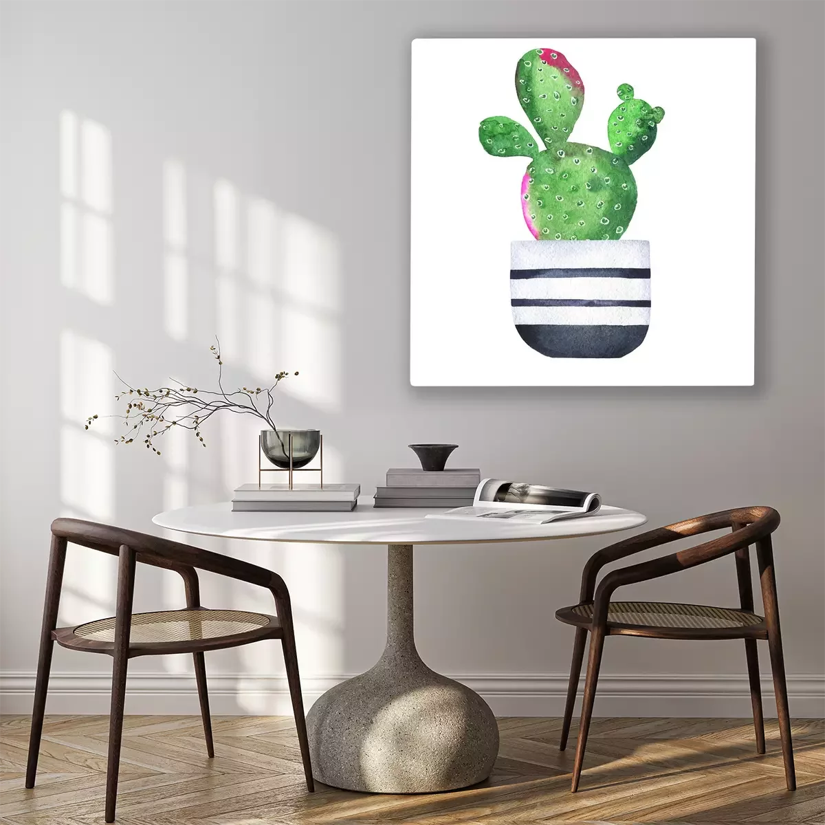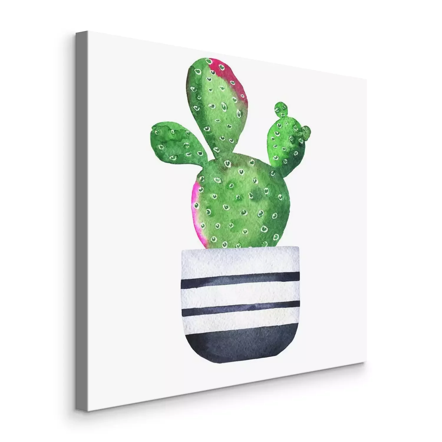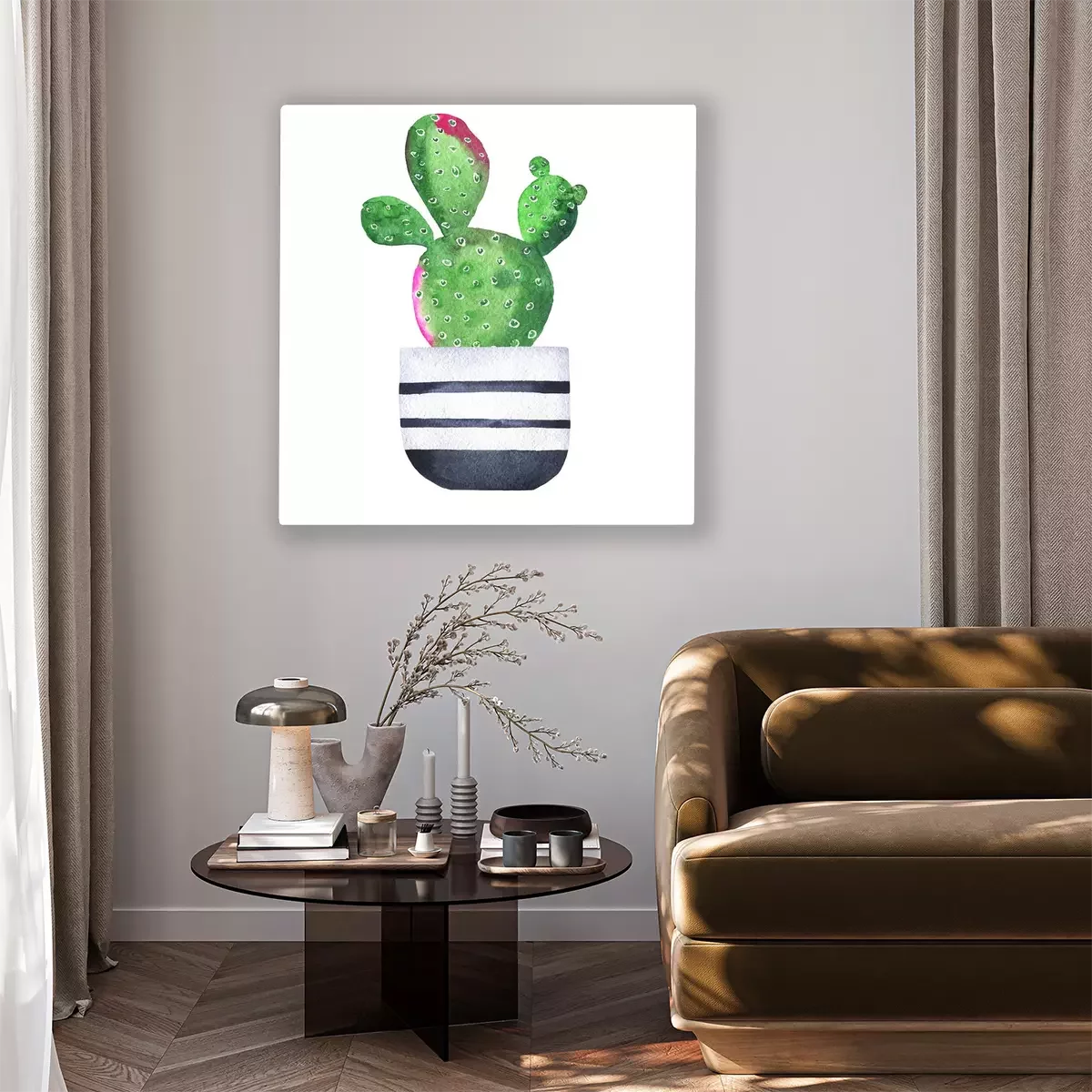 Canvas: Green and pink cactus in a flowerpot isolated on white background. Hand drawn watercolor illustration.