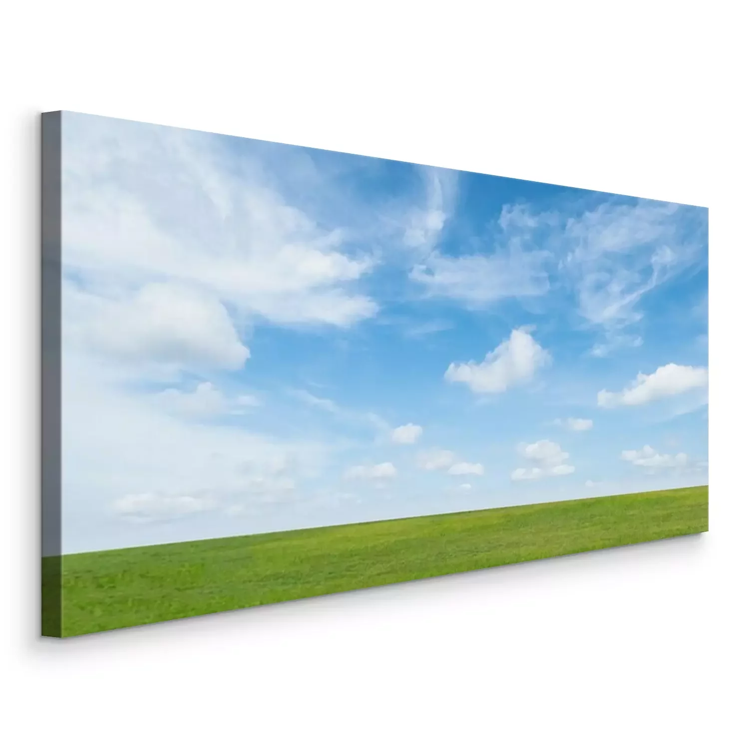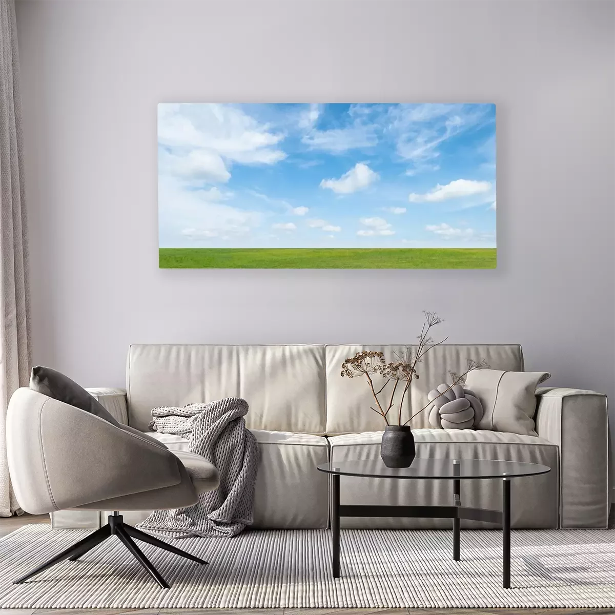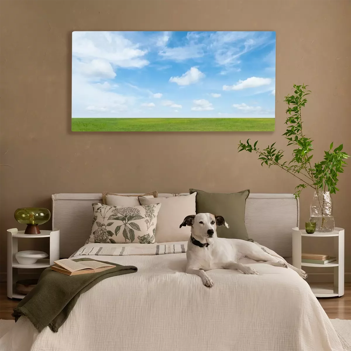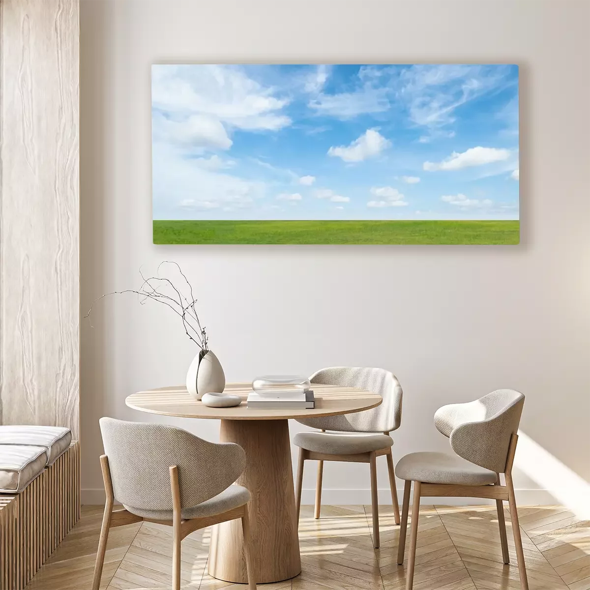 Canvas Green grass field and blue sky with white clouds. Beautiful landscape background.