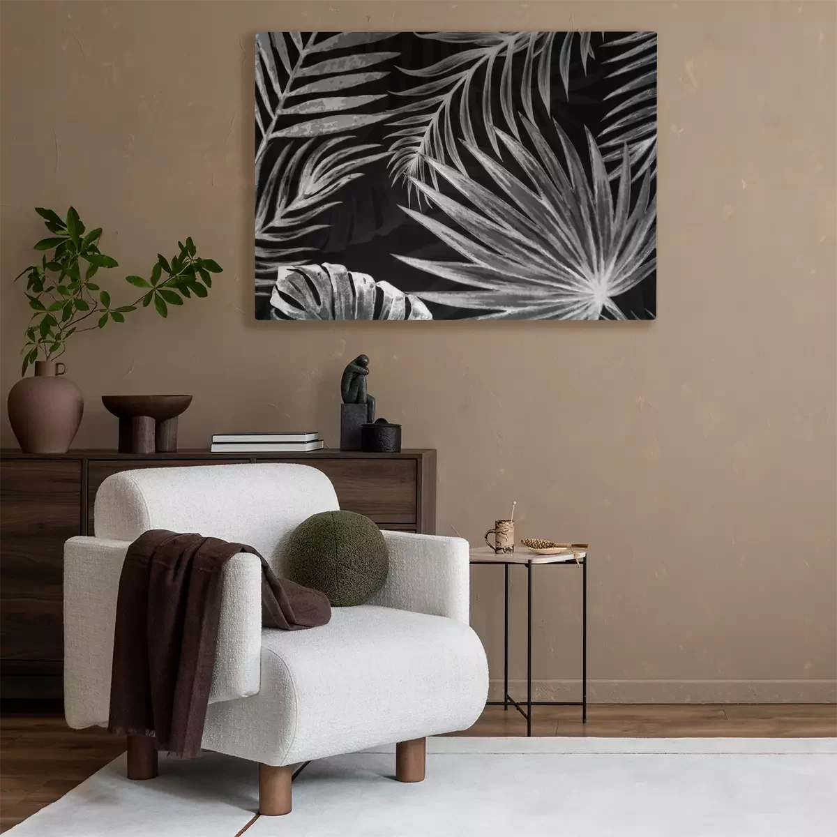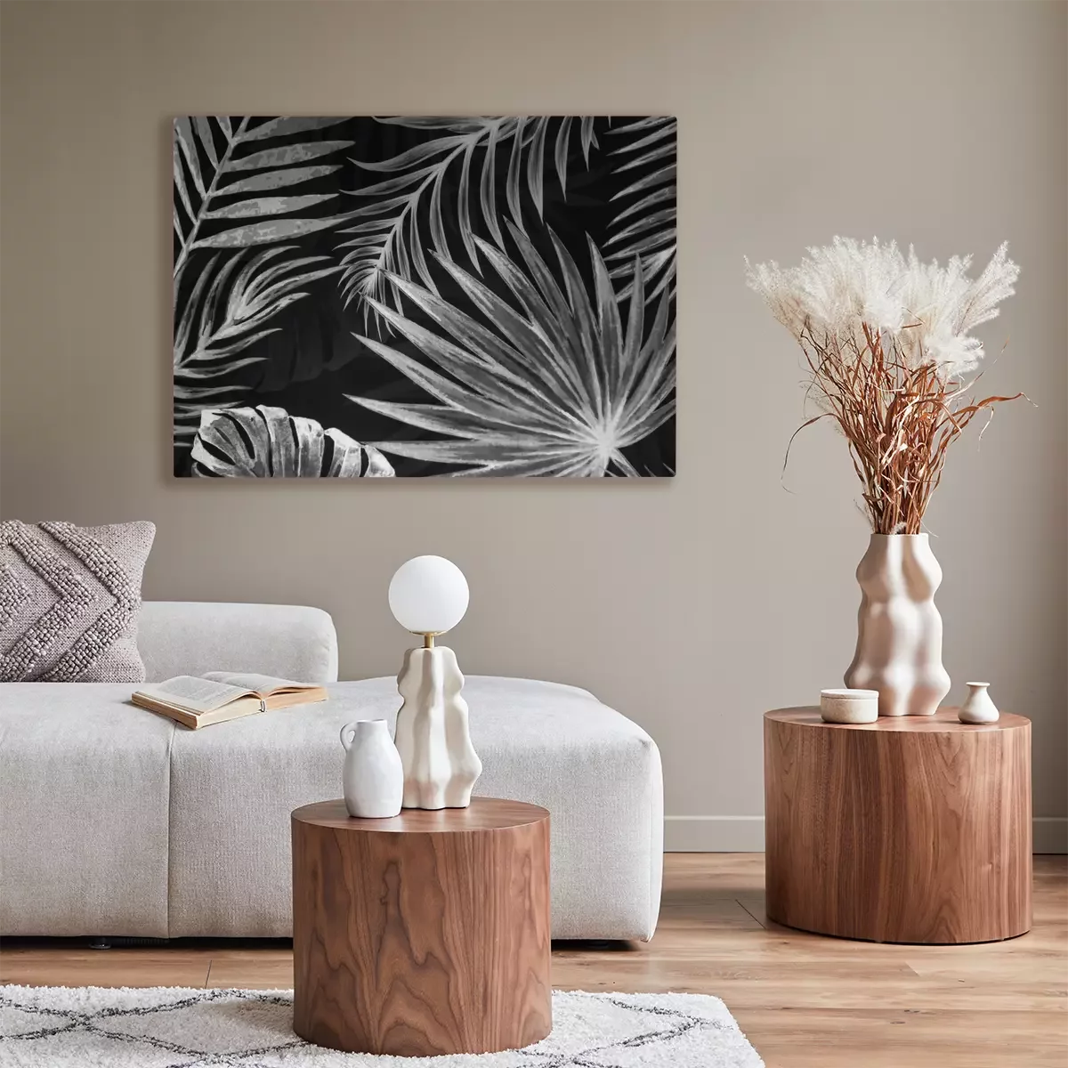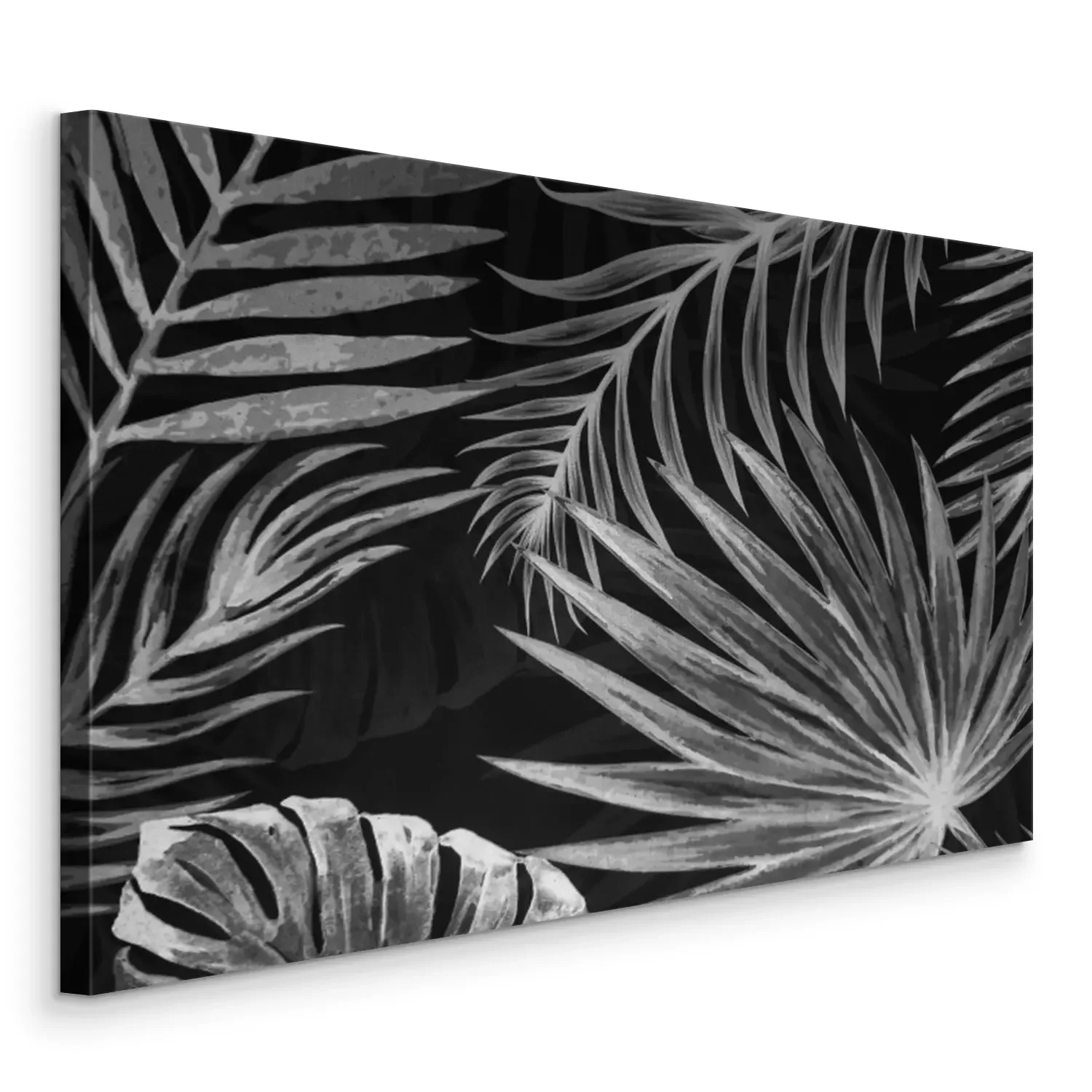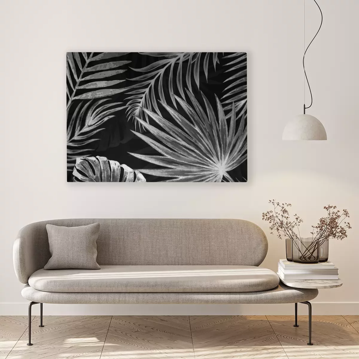Canvas: Grijze palmbladeren op een zwarte achtergrond