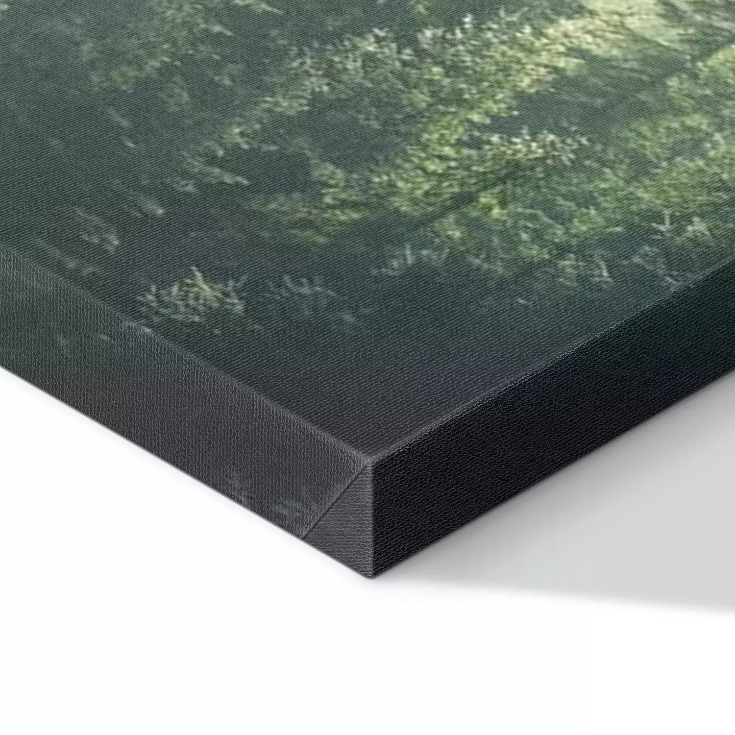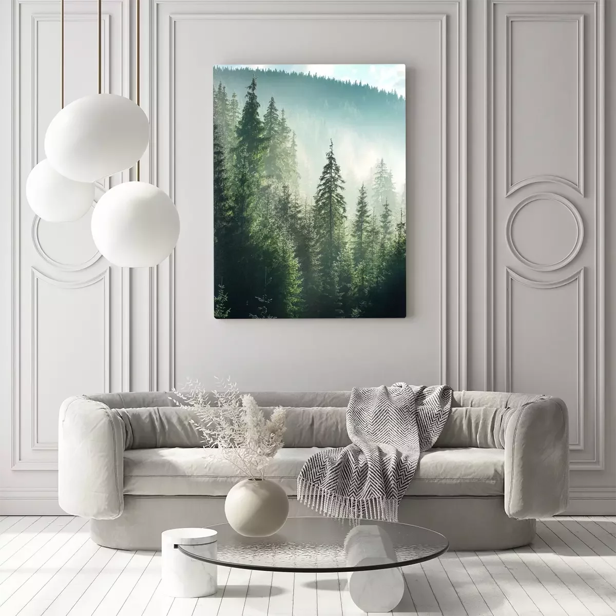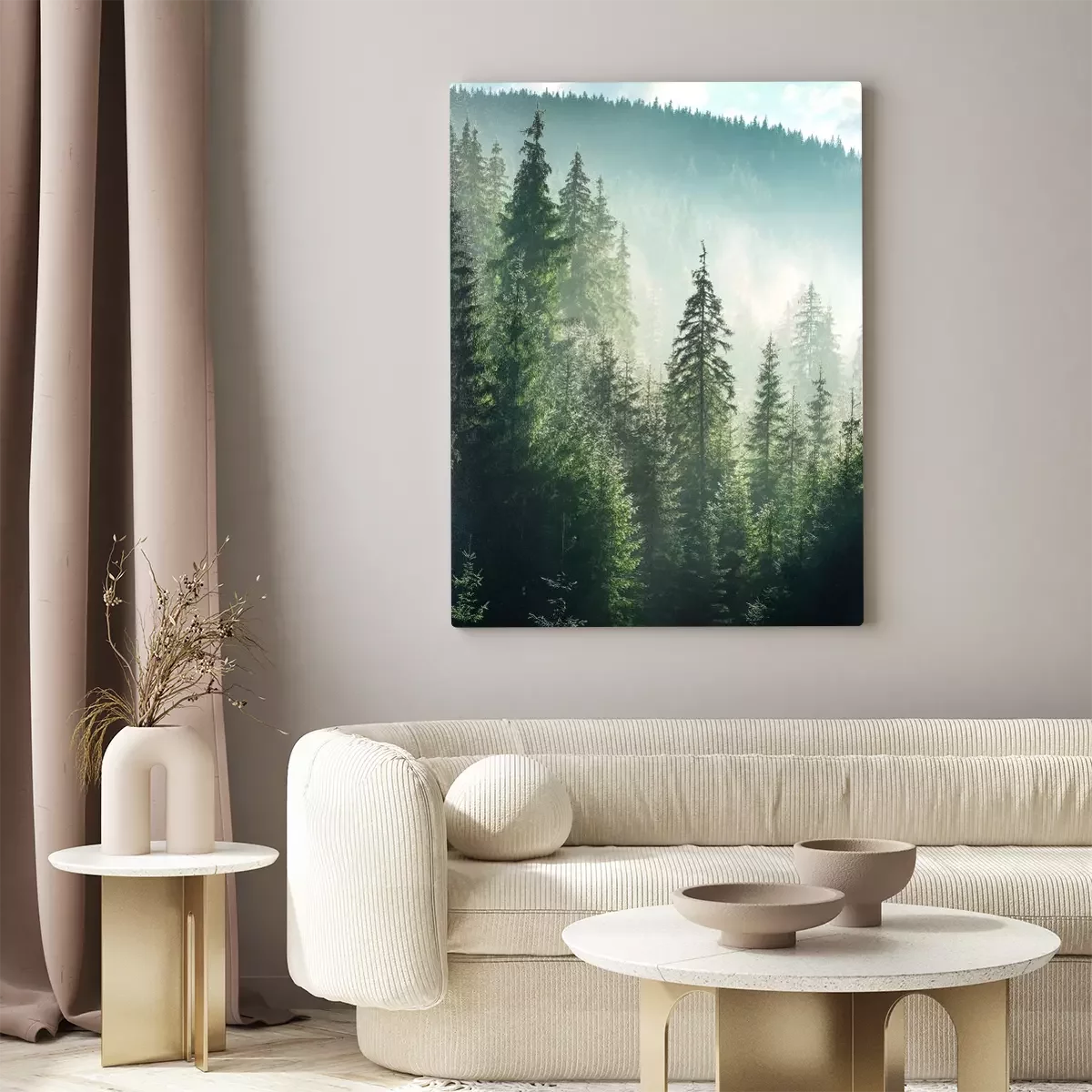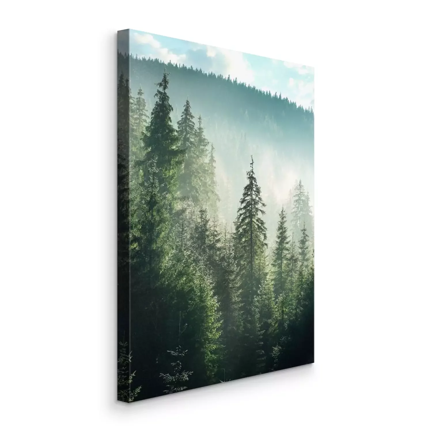 Groen bergbos met coniferen en mist