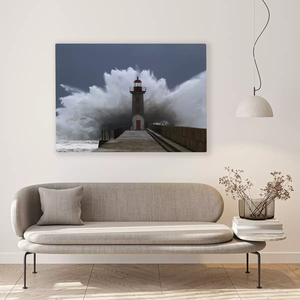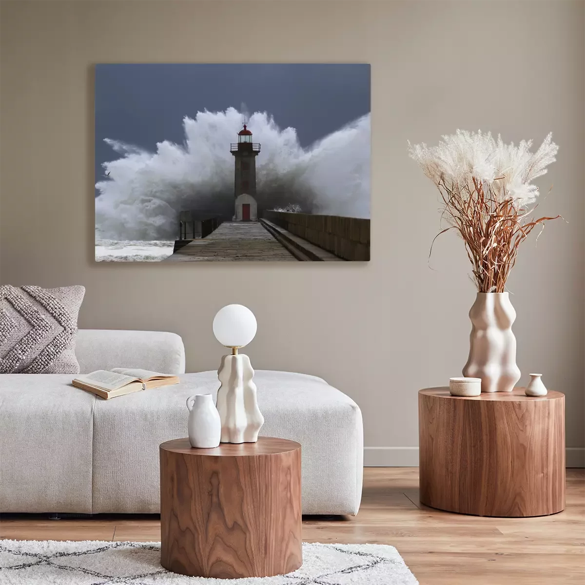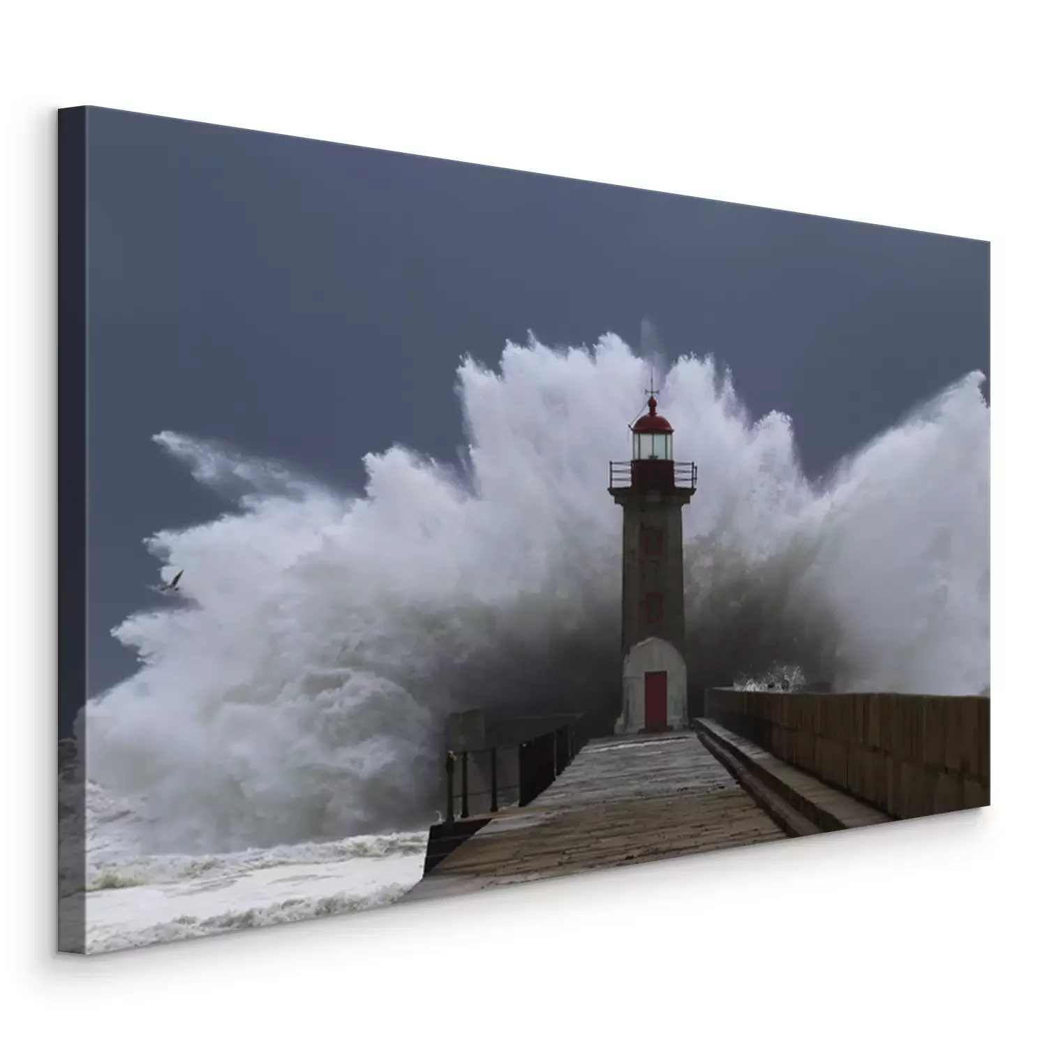 Canvas: Grote storm met grote golven in de buurt van een vuurtoren