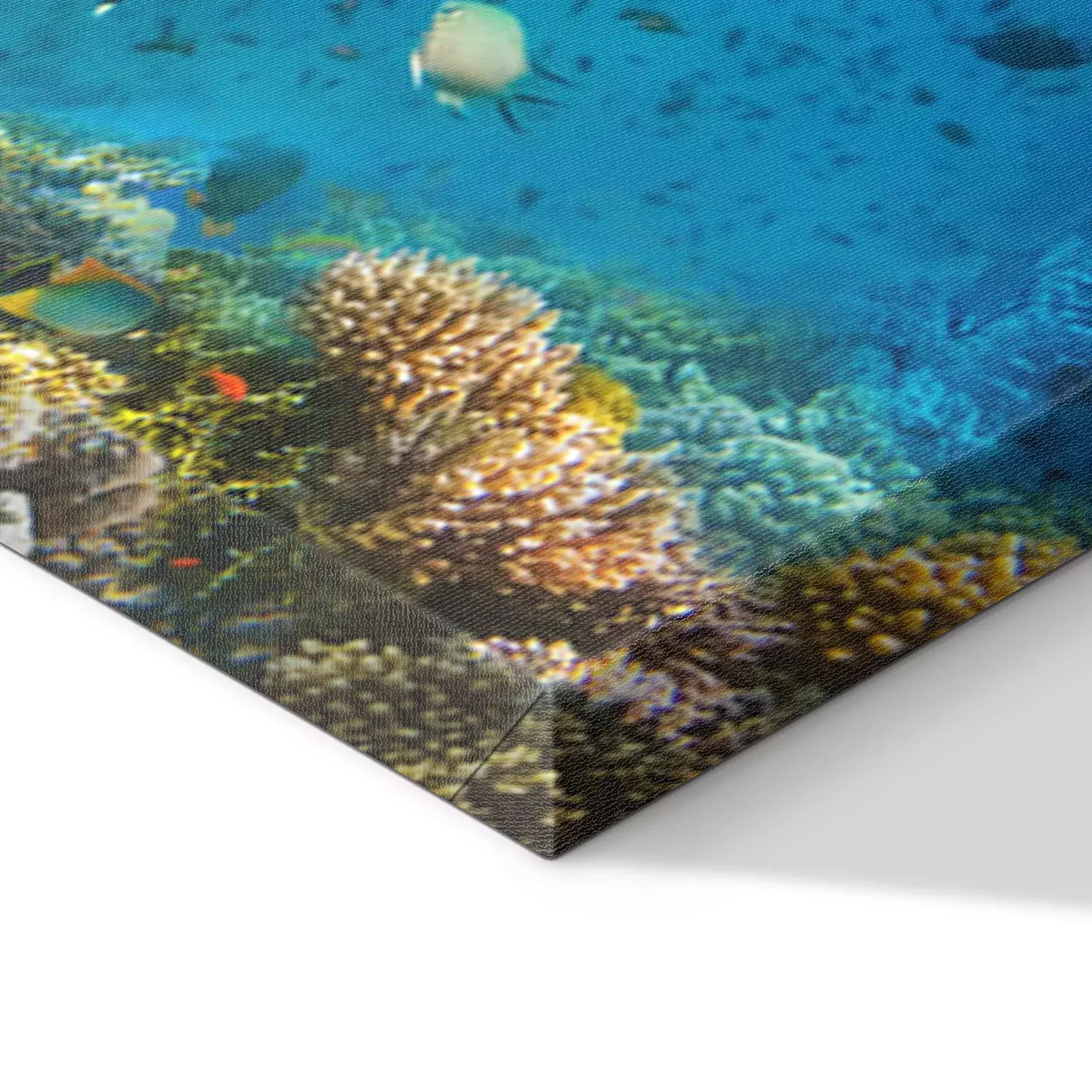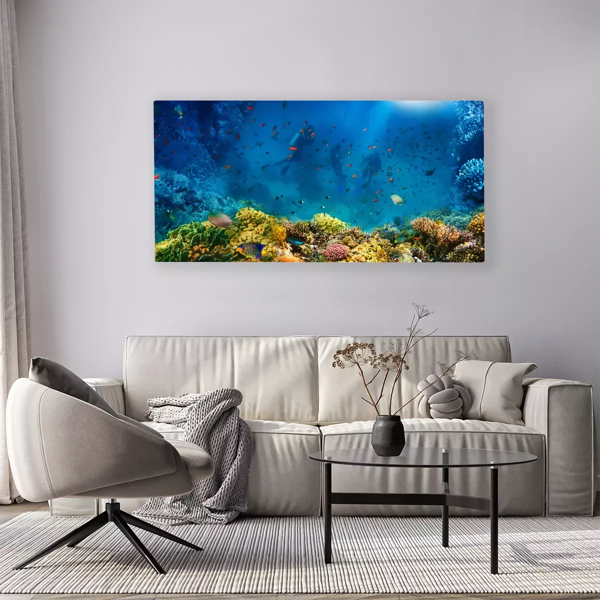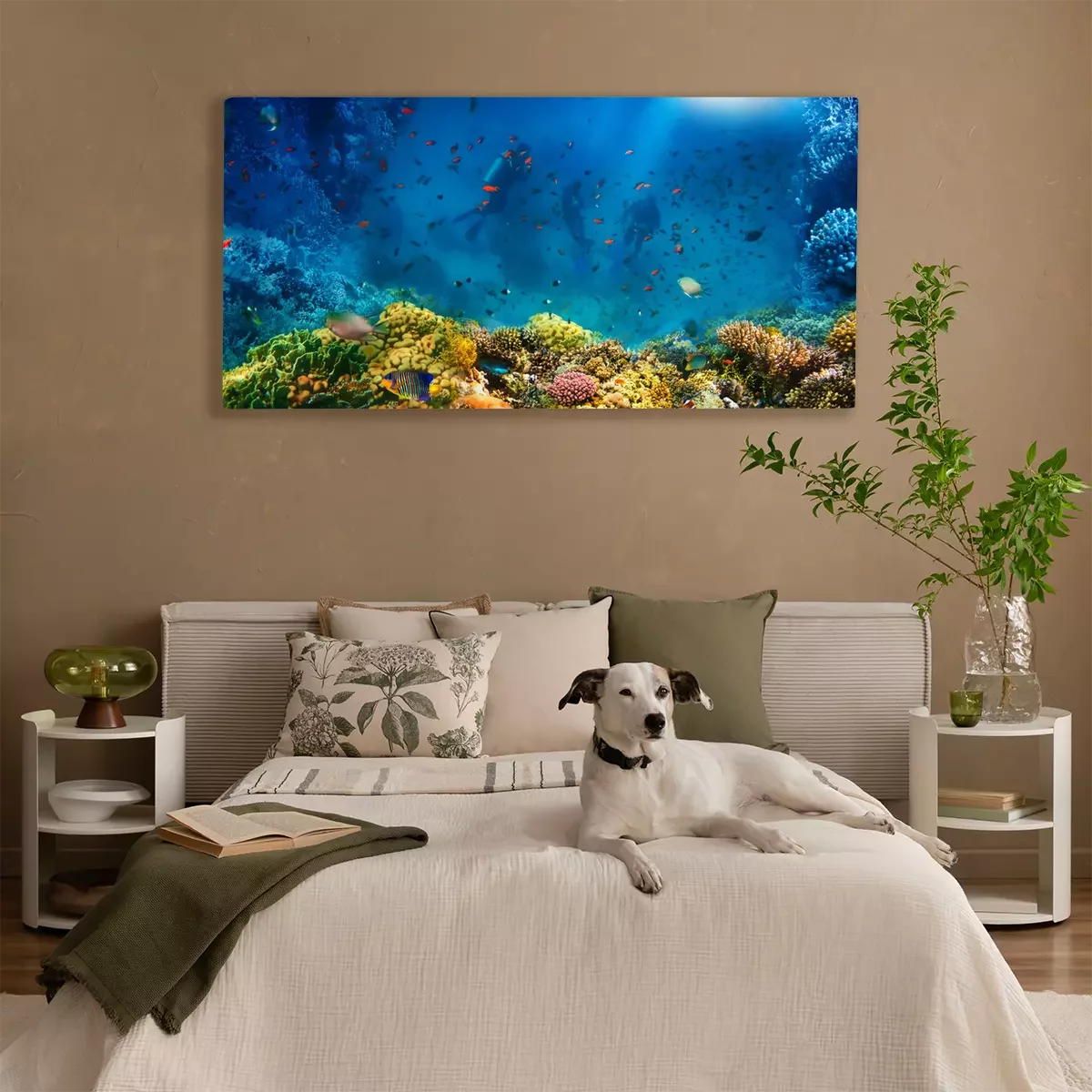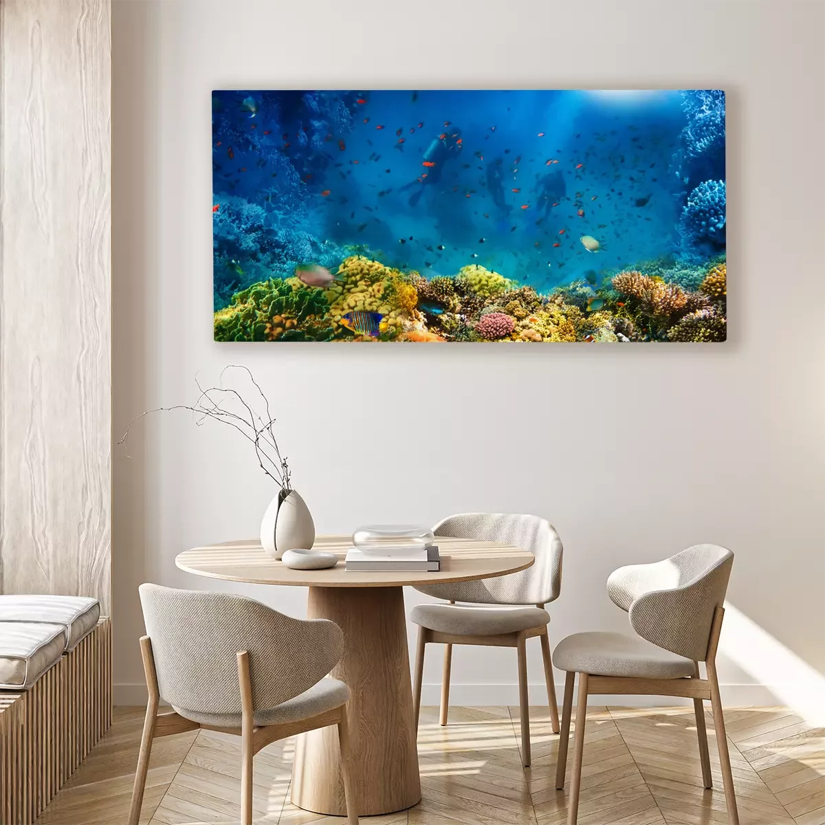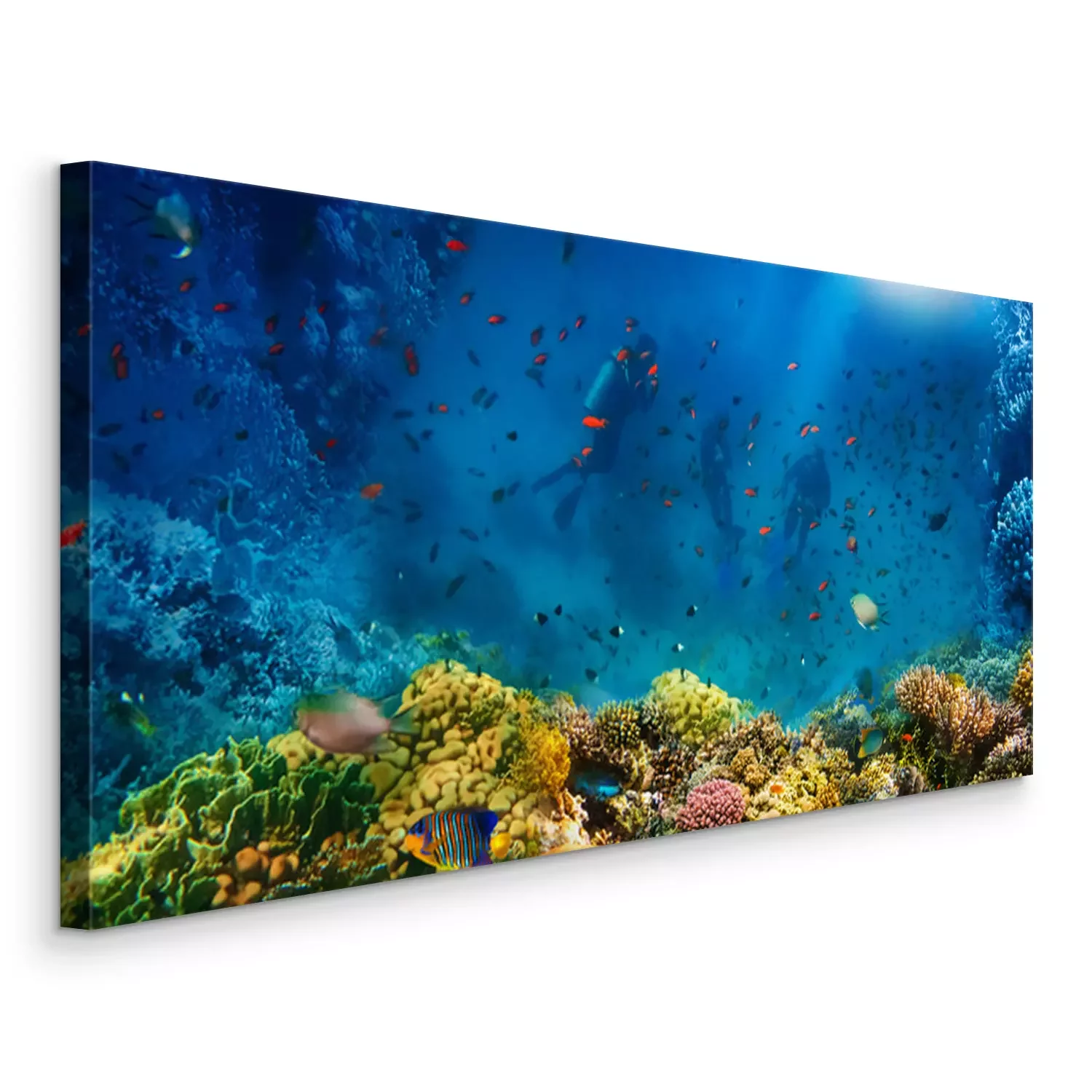Canvas Group of scuba divers exploring coral reef. Underwater sports and tropical vacation concept