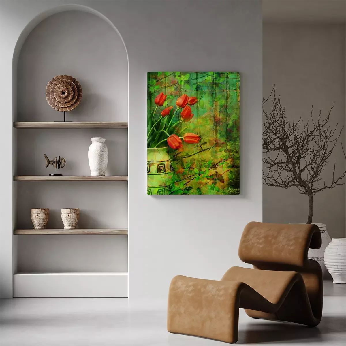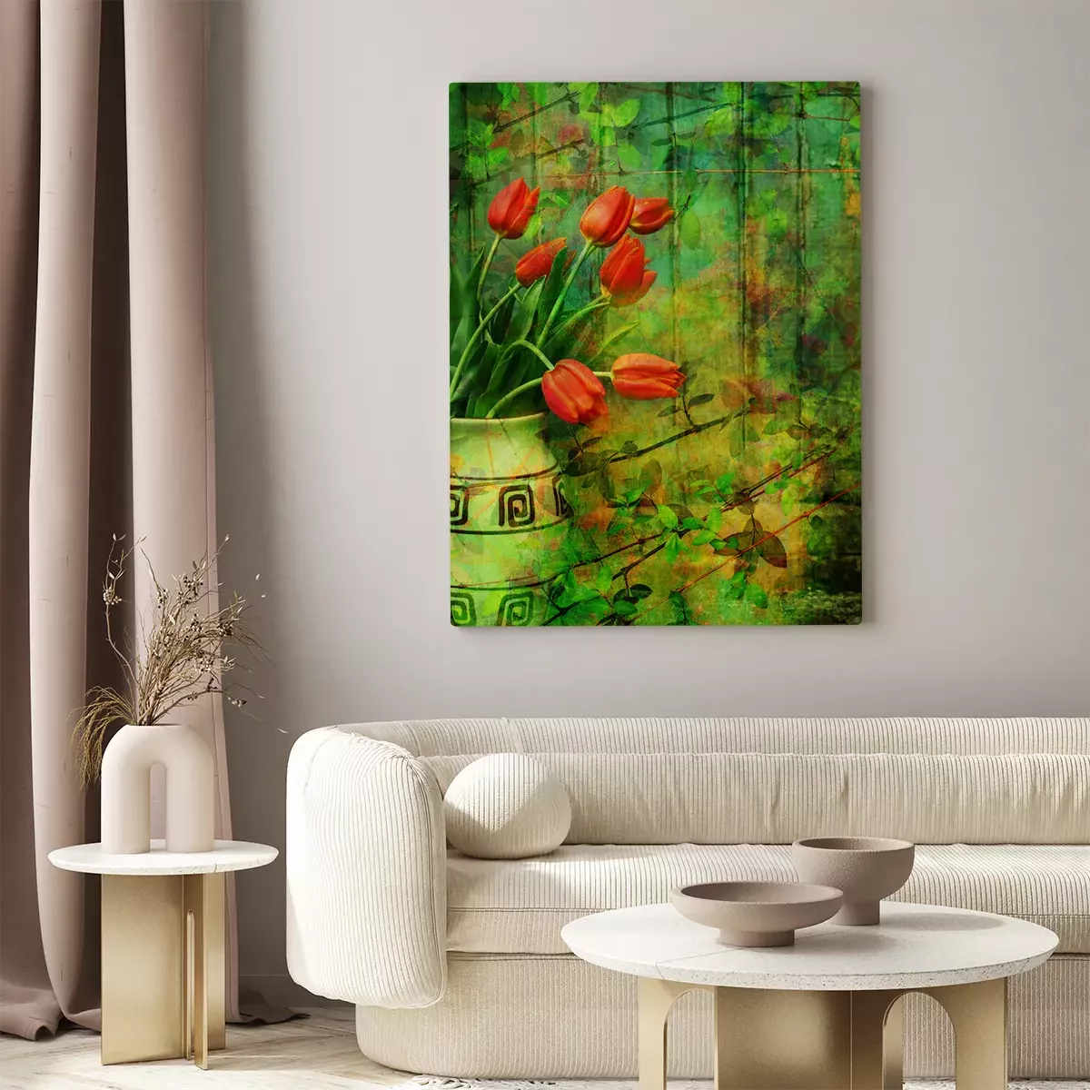Canvas: Grunge, achtergrond van de lente met rode tulpen