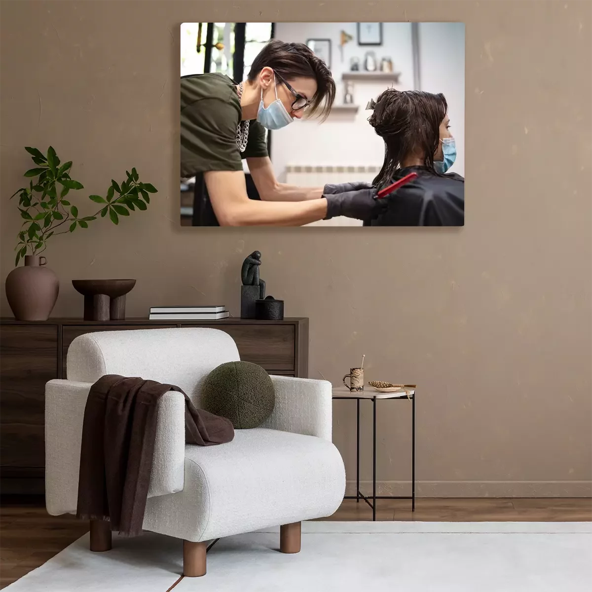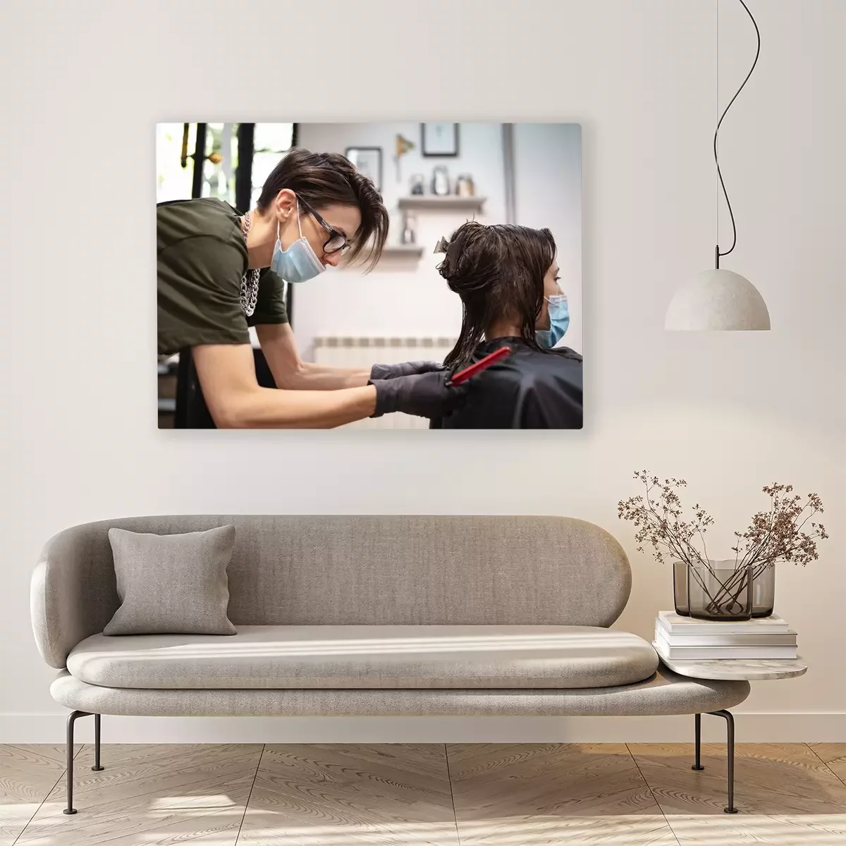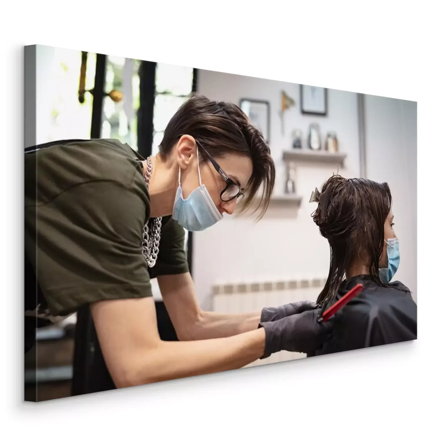 Canvas: Hairdresser and girl child customer in a salon with medical masks during virus pandemic. Working with safety mask.