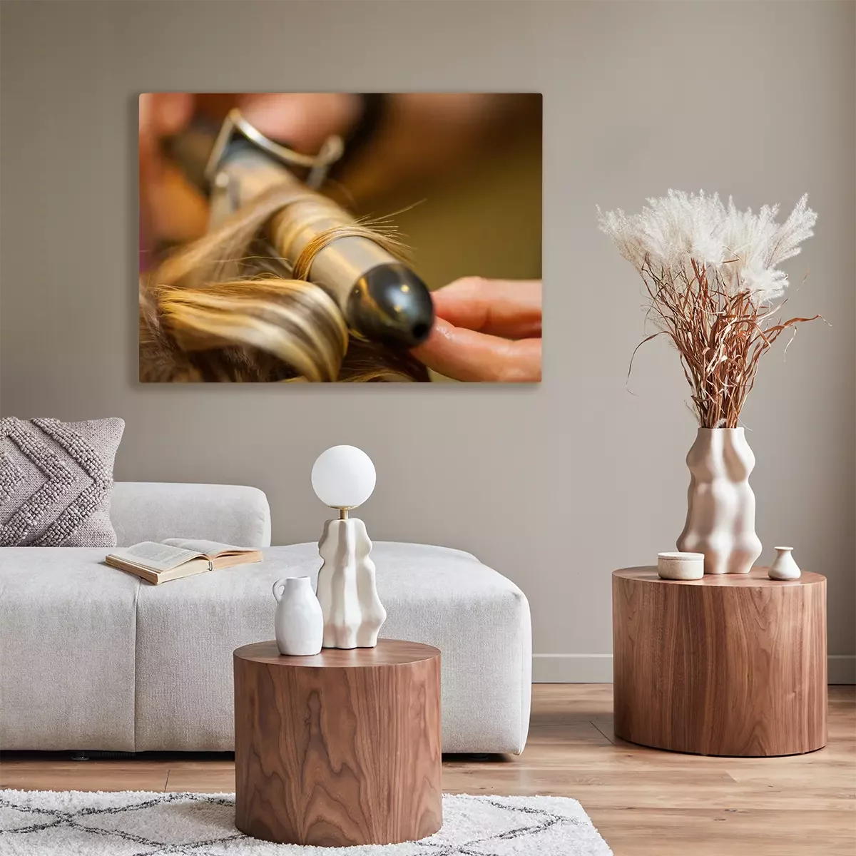 Canvas Hairdresser curling a blond woman's hair in professional hairdressing salon or barbershop , seen from behind the customer, unrecognizable.