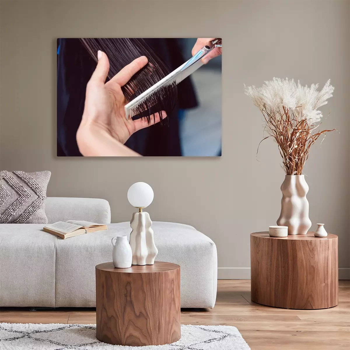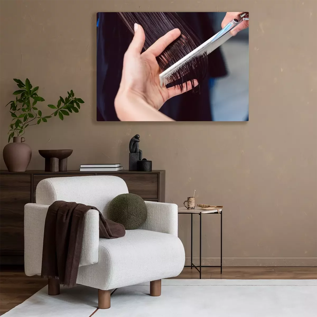 Canvas Hairdresser cutting and styling hair of woman in her shop