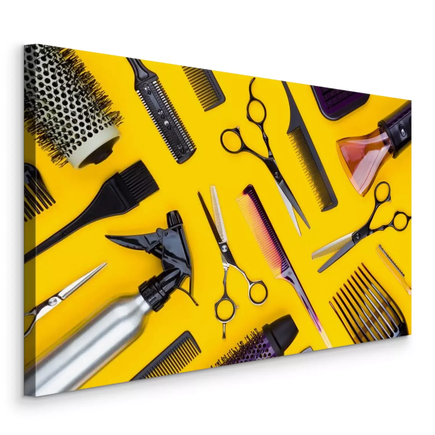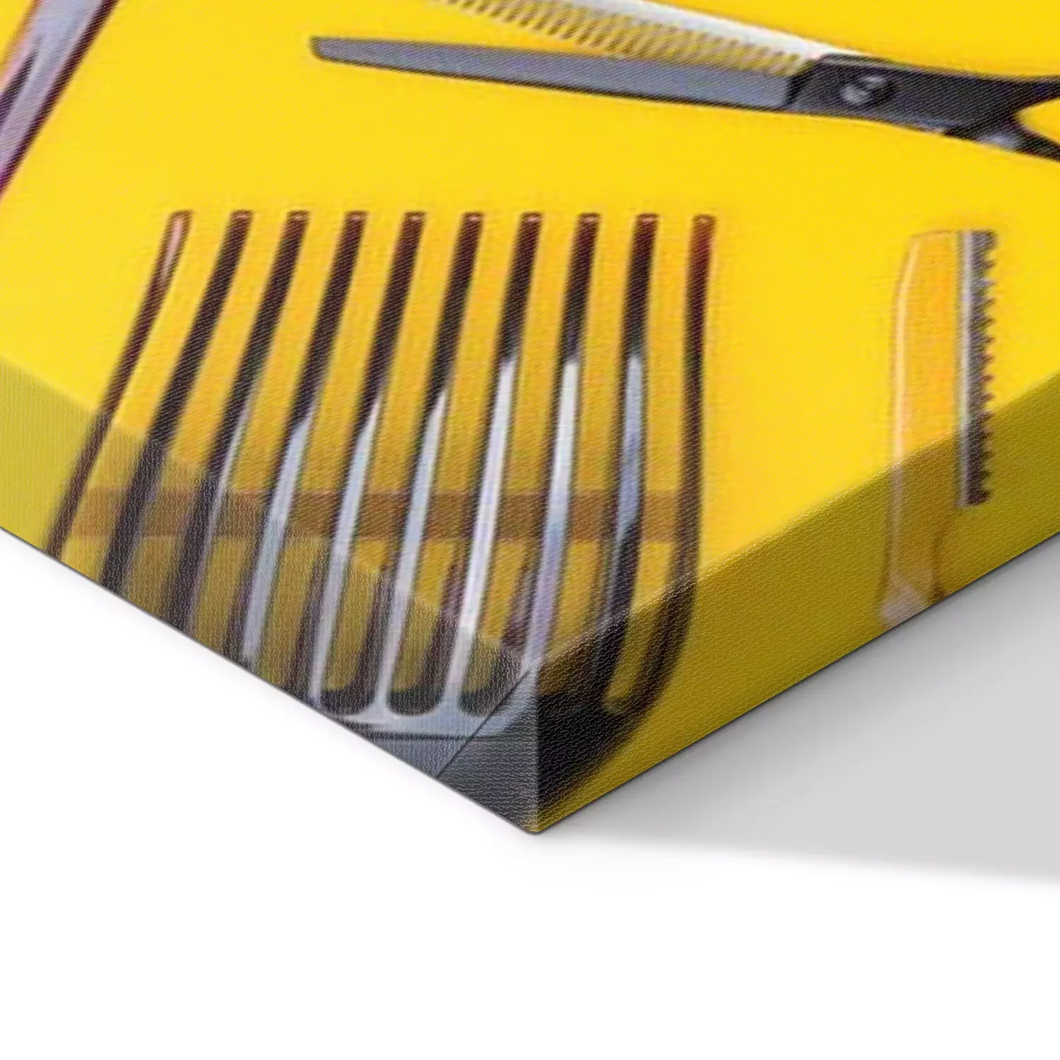 Canvas Hairdresser tools and combs tools on yellow background, top view
