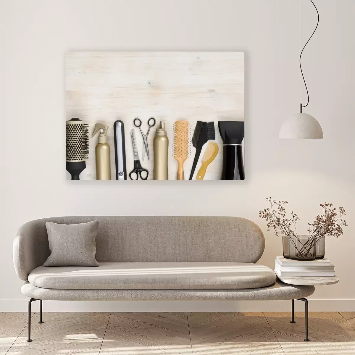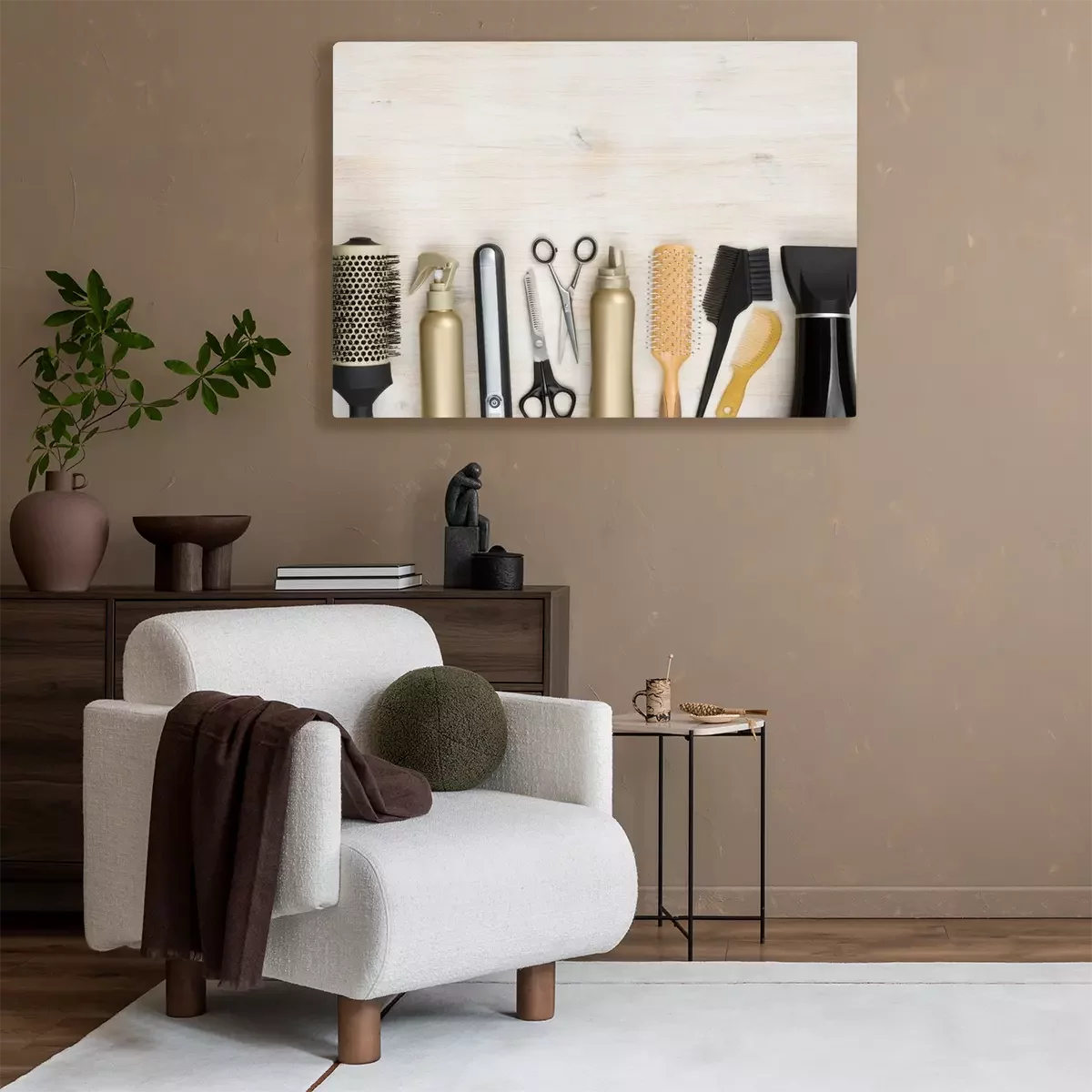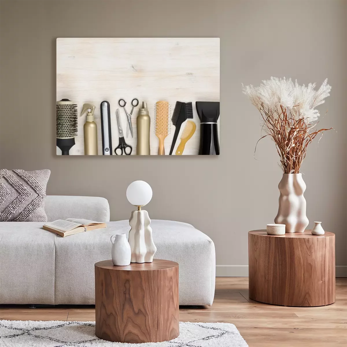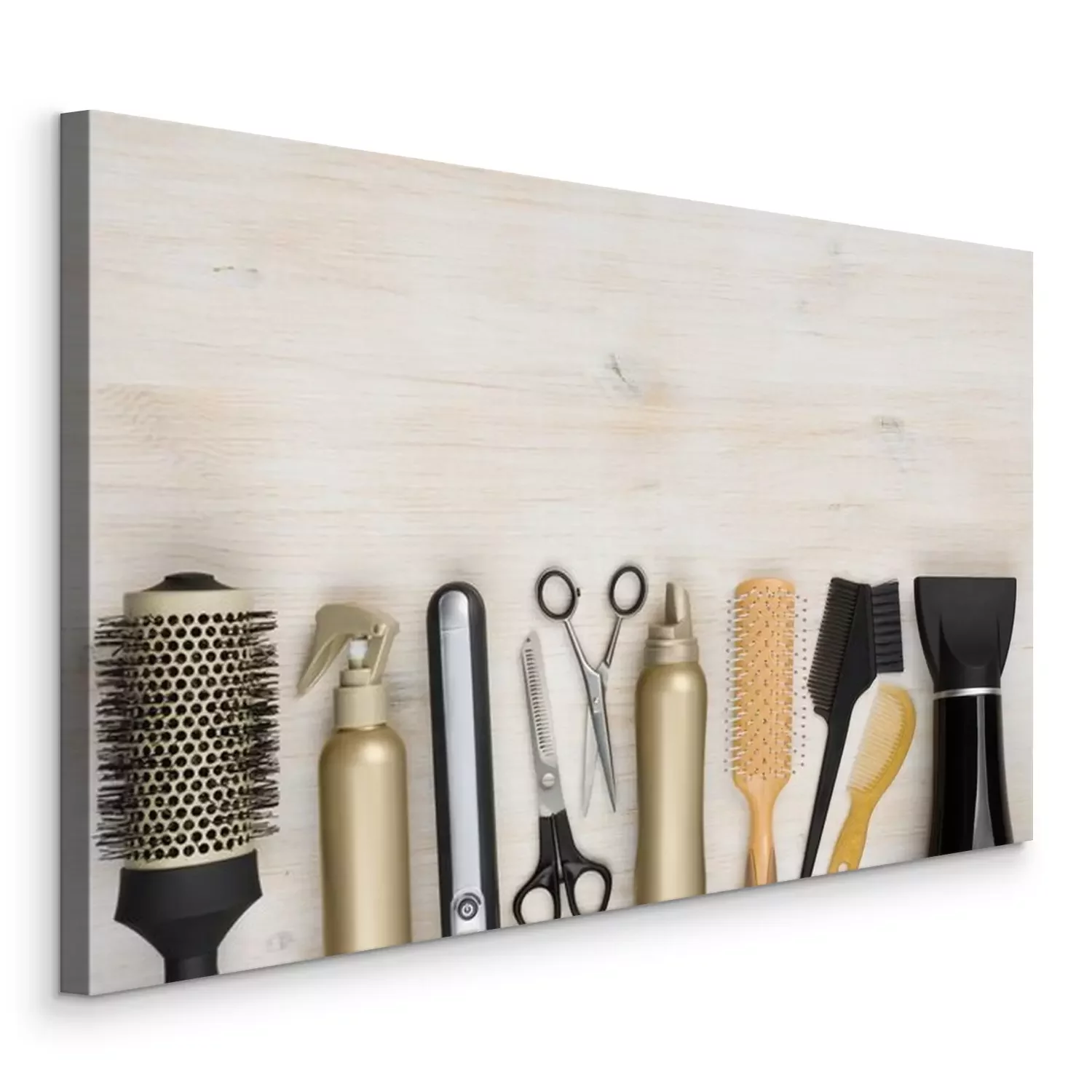 Canvas Hairdressing tools on wooden background with copy space at top