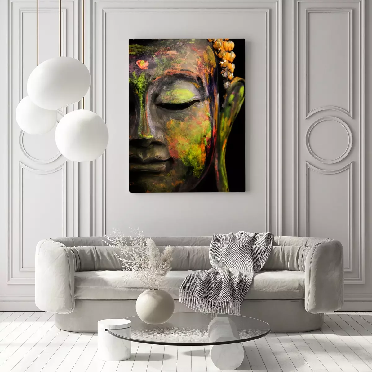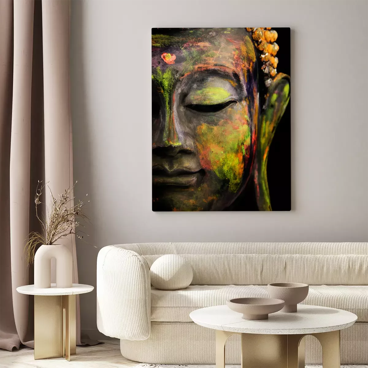 Halfprofiel van boeddha in groene en gele kleuren