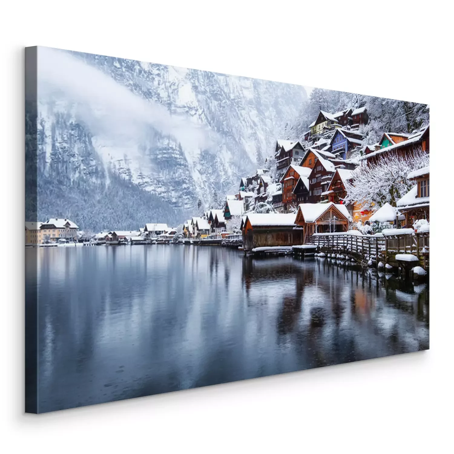 Canvas: Hallstat village in the Austria. Beautiful village in the mountain valley near lake. Mountains landscape and old town. Travel - Austria