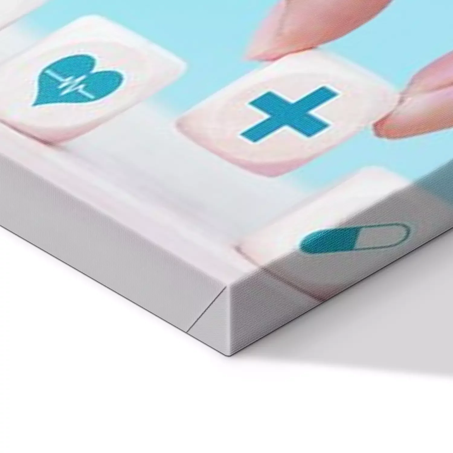 Canvas Hand chooses a emoticon icons healthcare medical symbol on wooden block , Healthcare and medical Insurance concept