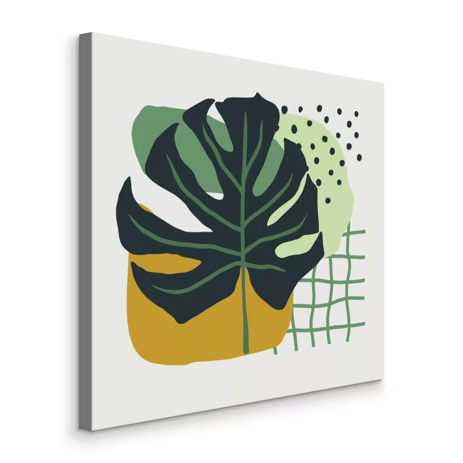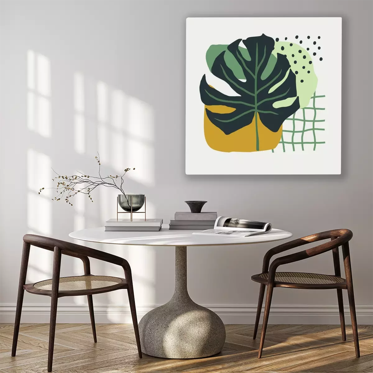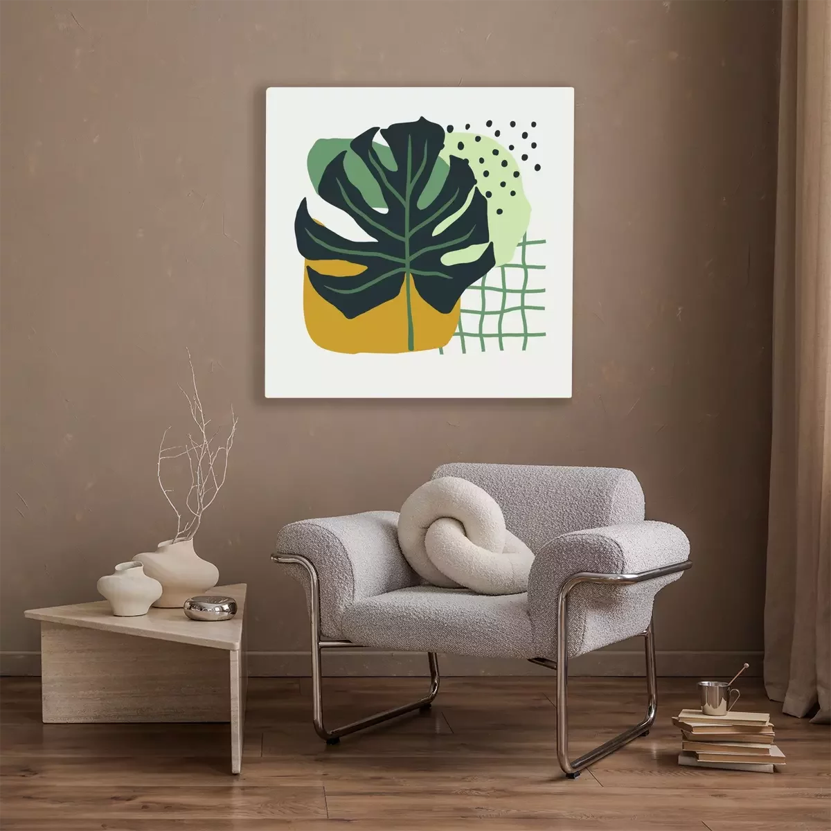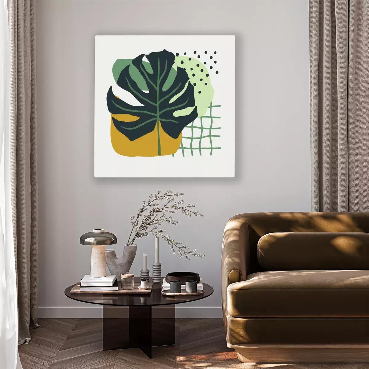 Canvas: Hand Drawn collage of simple shapes and leaves monstera in Scandinavian style in green colors. vector illustration