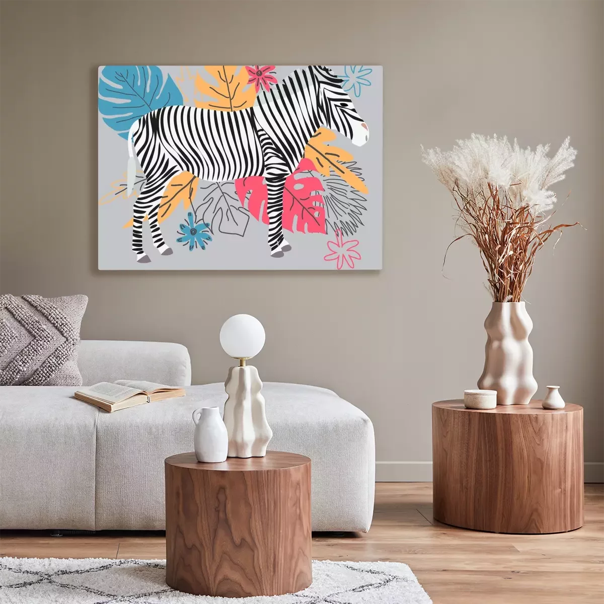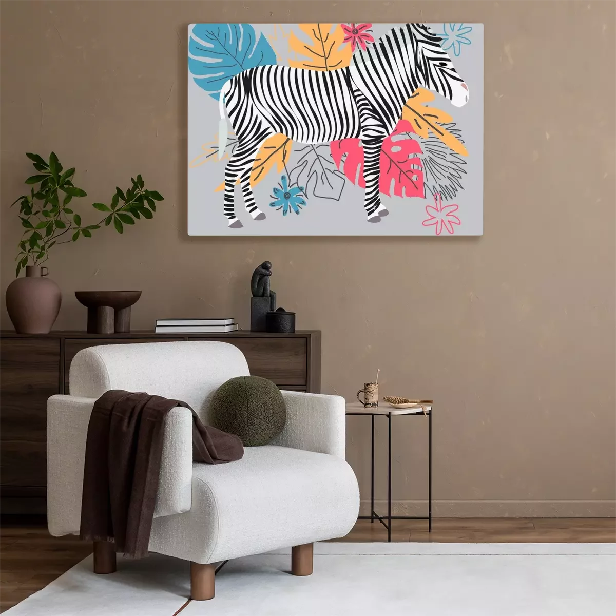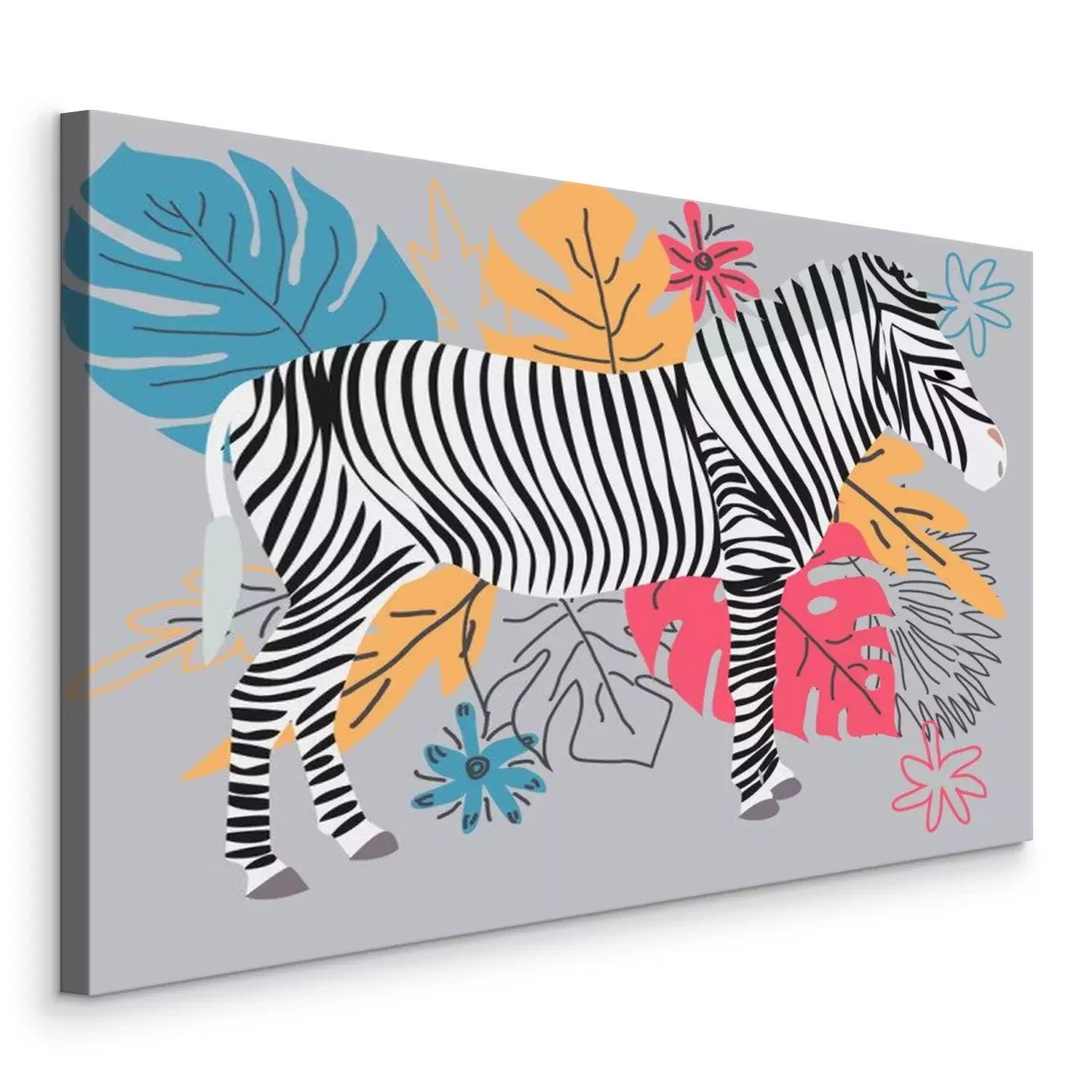 Canvas Hand drawn colorful zebra with flowers, Monstera, a bouquet. Zebra - word with cute design. Scandinavian style design.