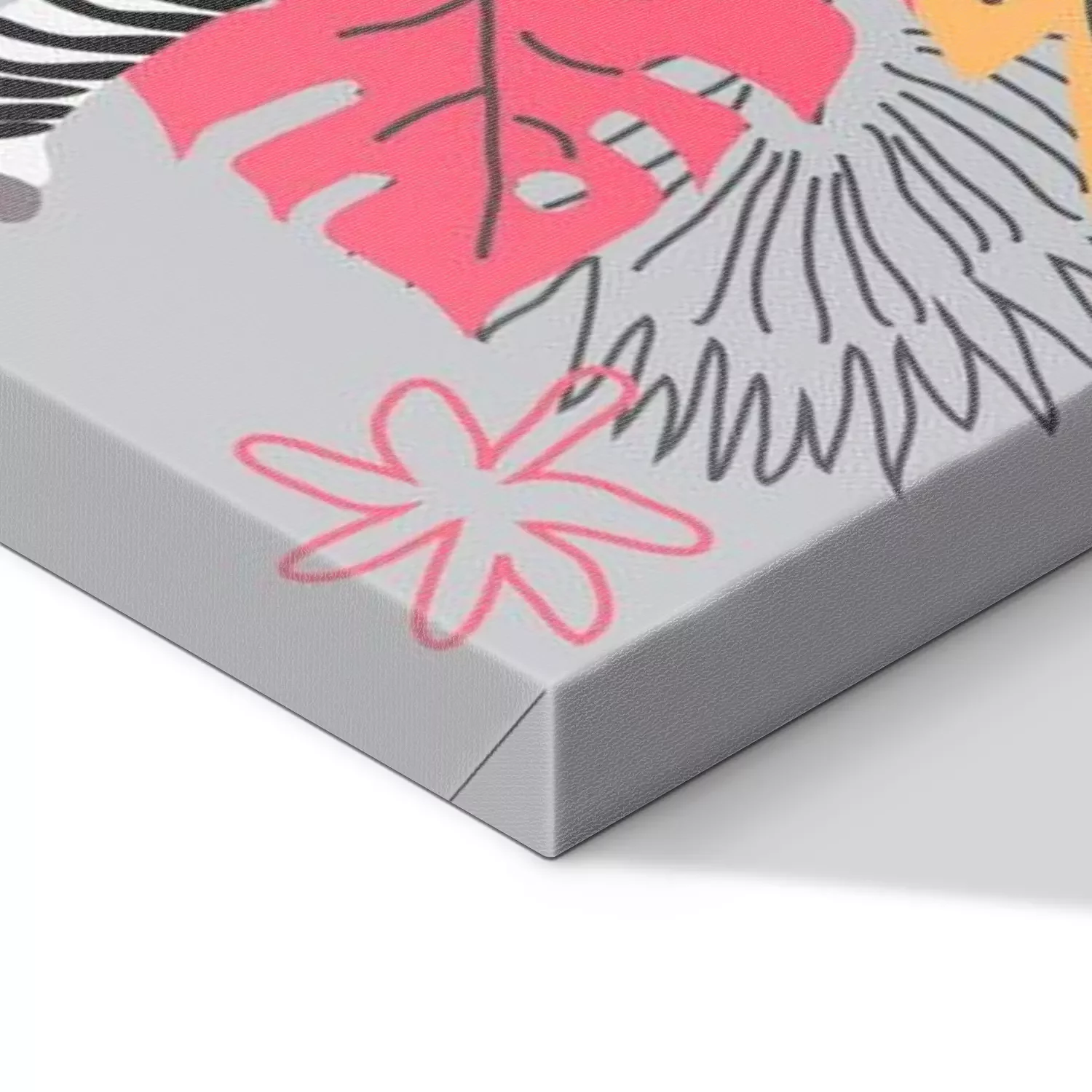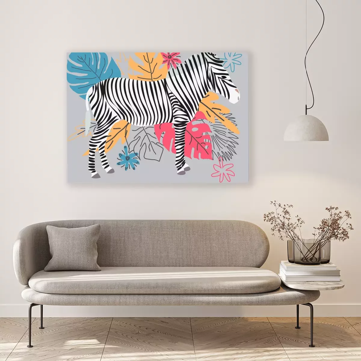 Canvas: Hand drawn colorful zebra with flowers, Monstera, a bouquet. Zebra - word with cute design. Scandinavian style design.