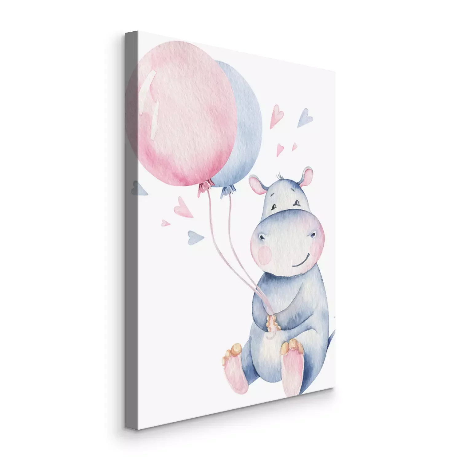 Canvas Hand drawn cute isolated tropical summer watercolor hippo animals. hippopotamus baby and mother cartoon animal illustrations, jungle tree, brazil trendy design. Aloha collection.