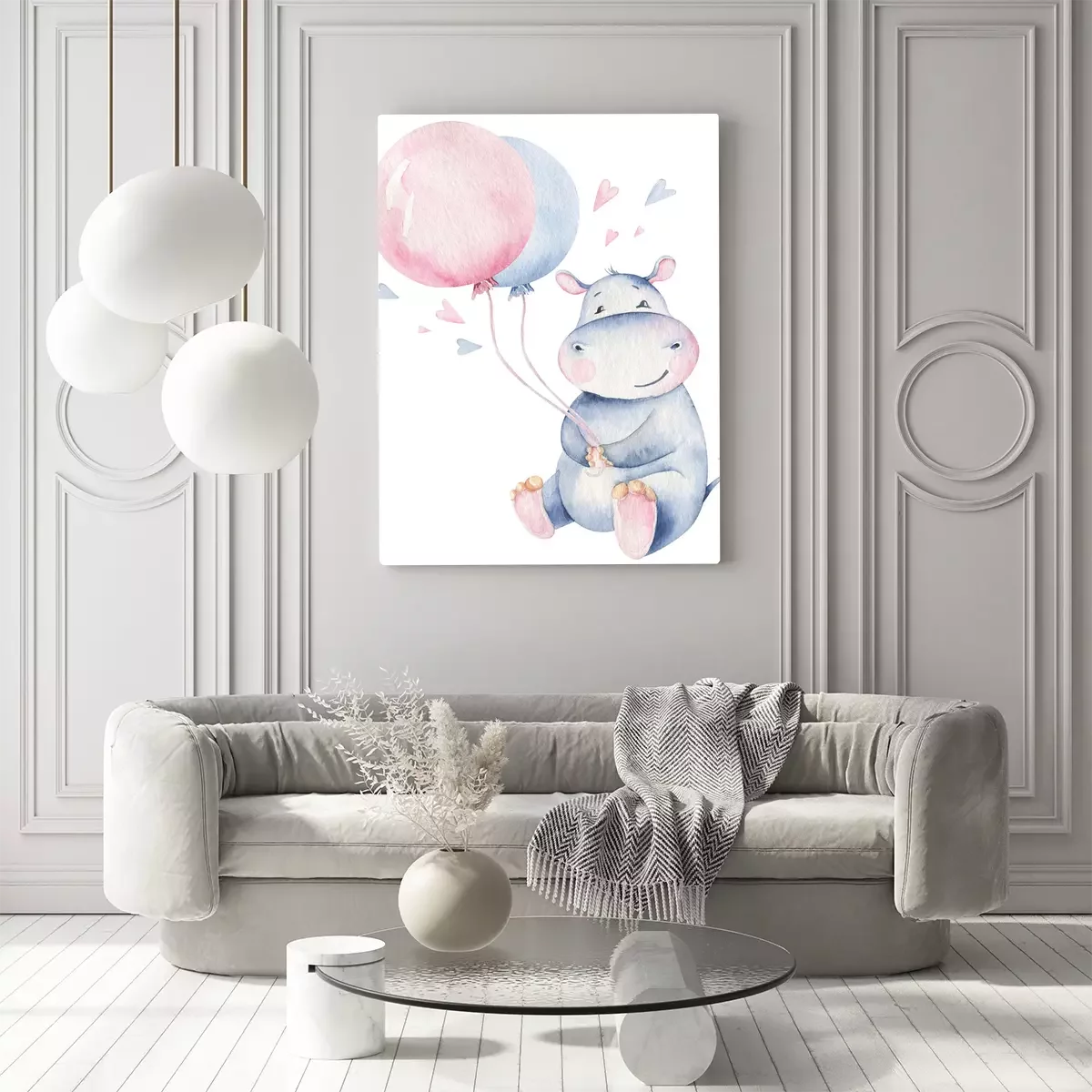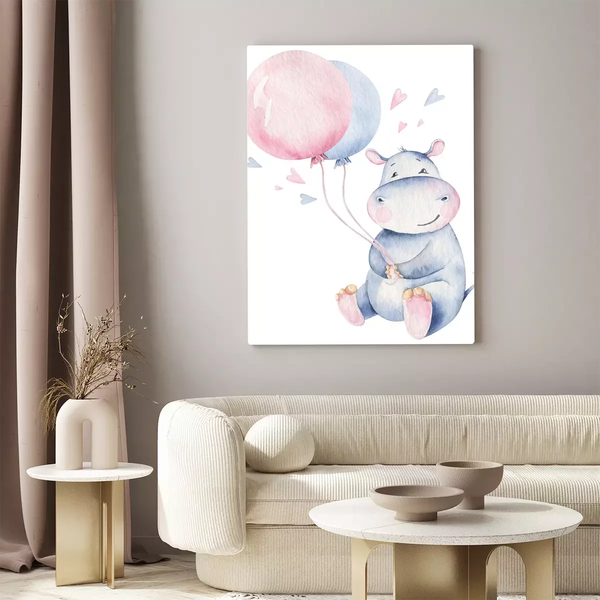Canvas: Hand drawn cute isolated tropical summer watercolor hippo animals. hippopotamus baby and mother cartoon animal illustrations, jungle tree, brazil trendy design. Aloha collection.