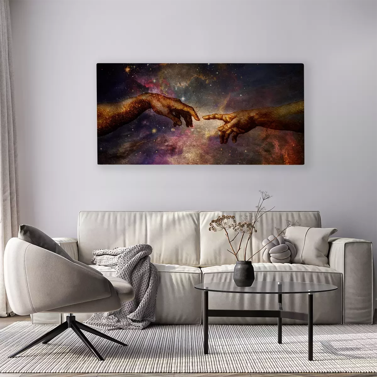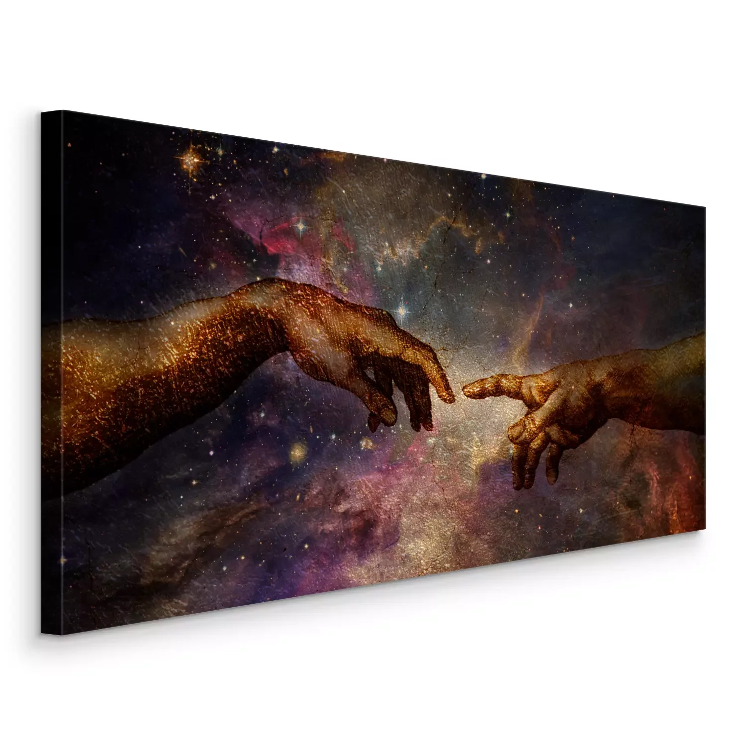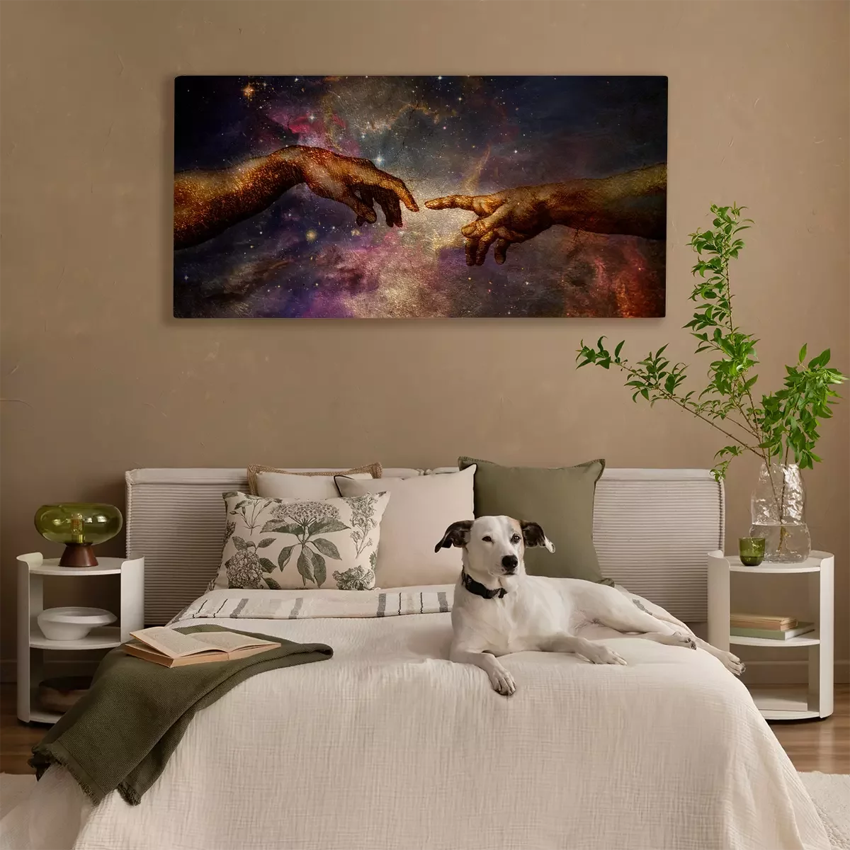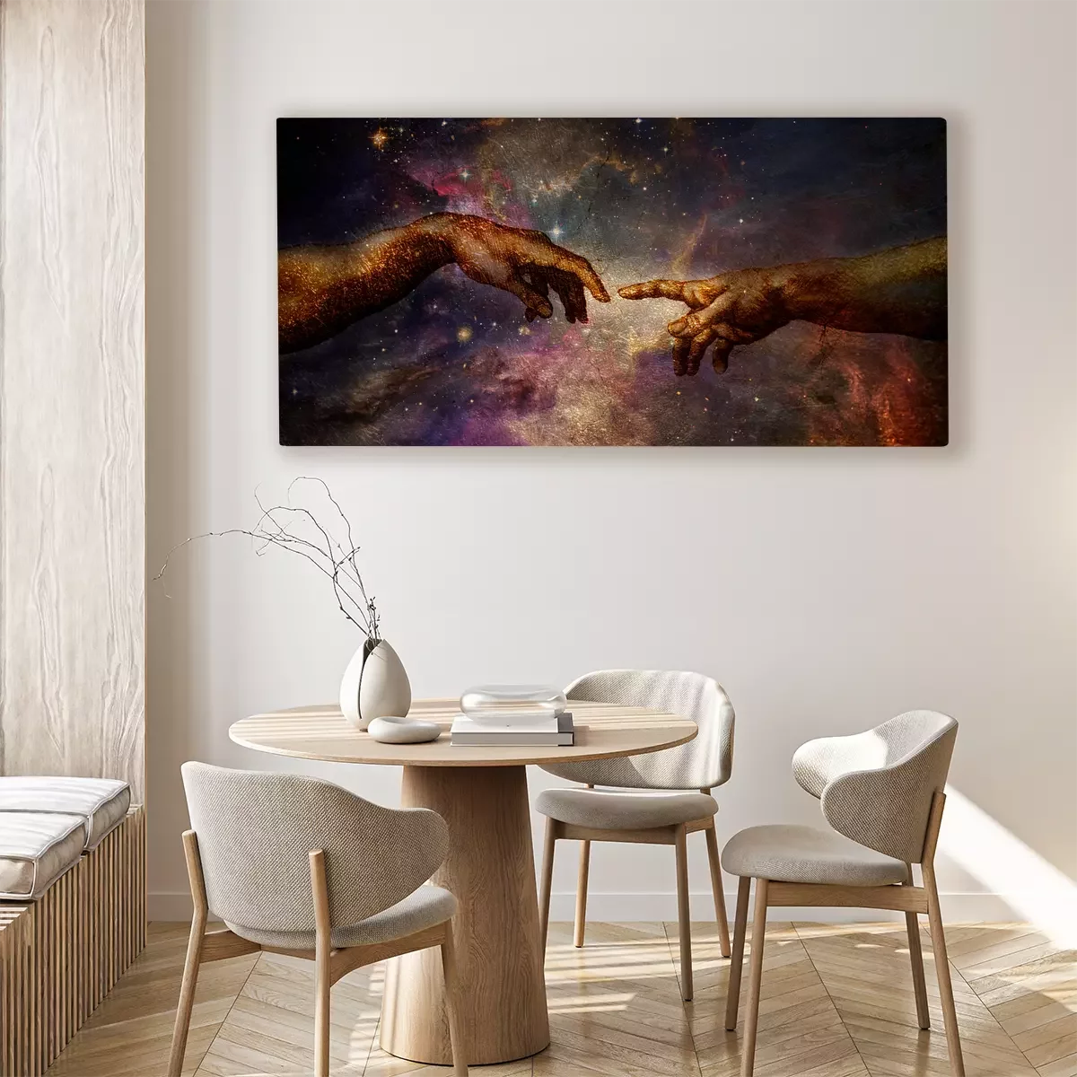 Handen uit de schepping van adam tegen een kosmische achtergrond