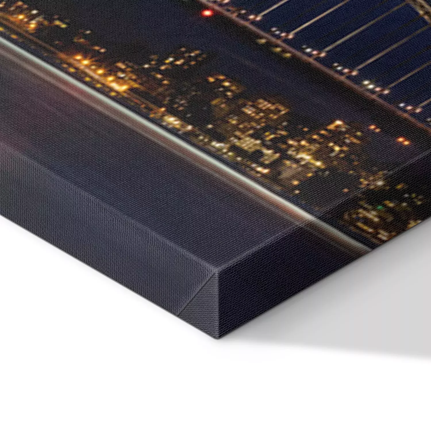 De print wordt aangebracht op hoogwaardig canvas dat op een schildersweefgetouw (spieraam) wordt gespannen. Omdat de print de zijranden bedekt, hoeft het ontwerp niet met een extra kader te worden omlijst. Wij raden ook composities aan die uit meerdere foto's bestaan en zo een coherente compositie vormen.