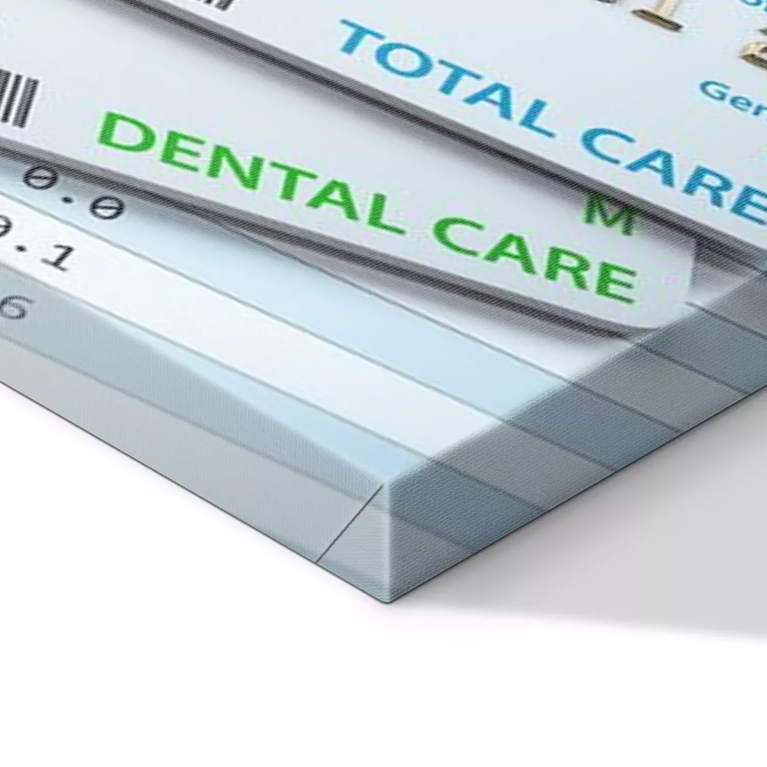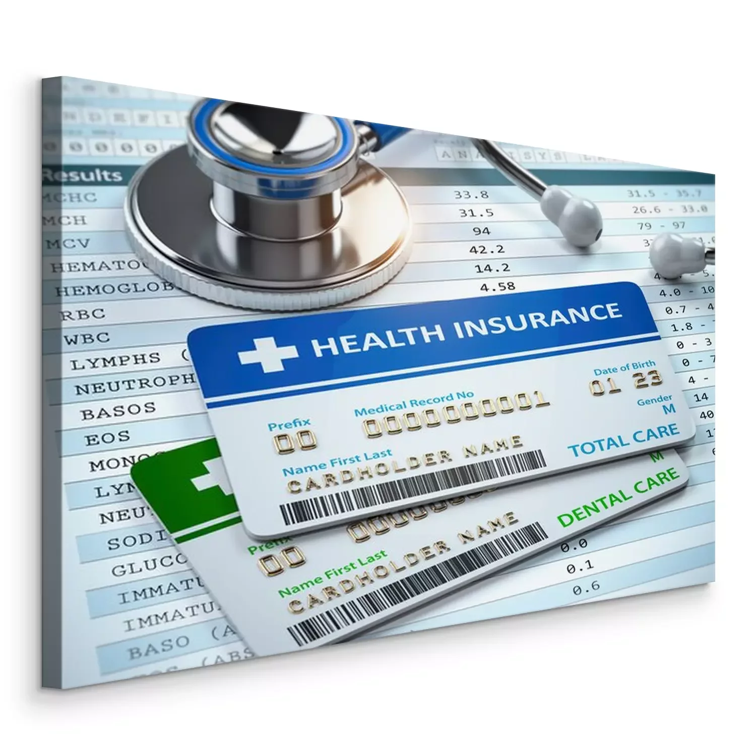Canvas Health Insurance cards total and dental care with stethscope.