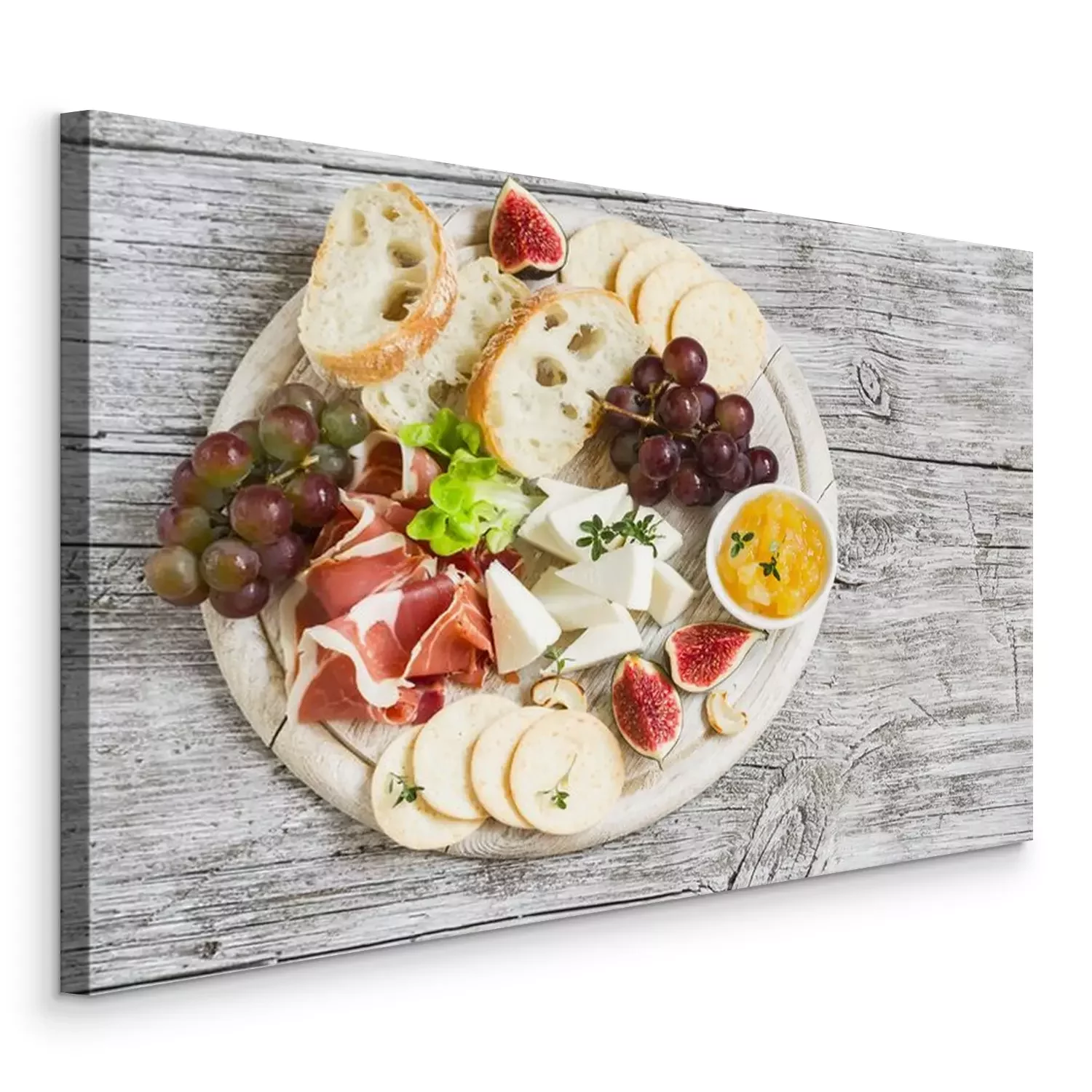 Canvas: heerlijk aperitief wijn - ham, kaas, druiven, crackers, vijgen, noten, jam, geserveerd op een lichte houten plank