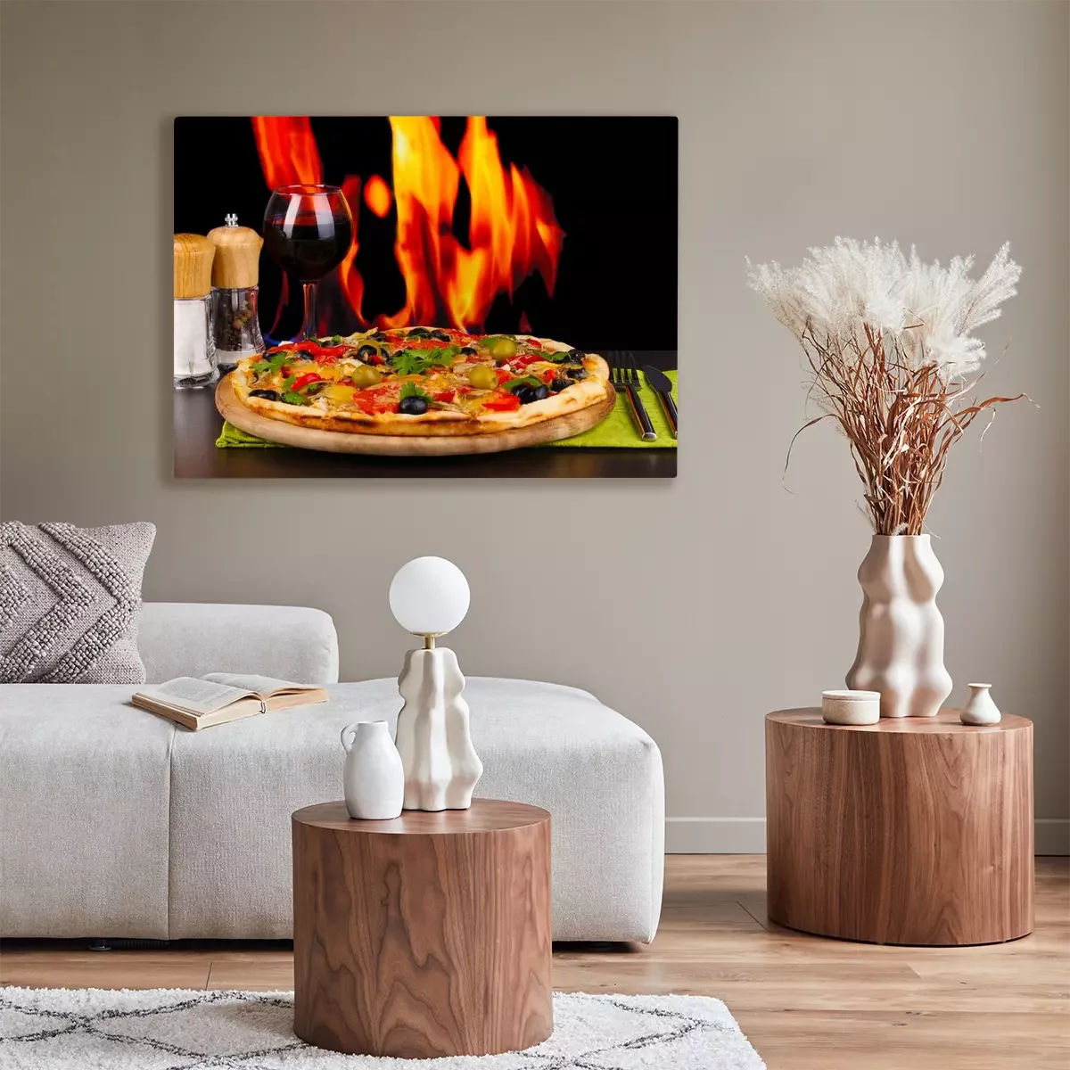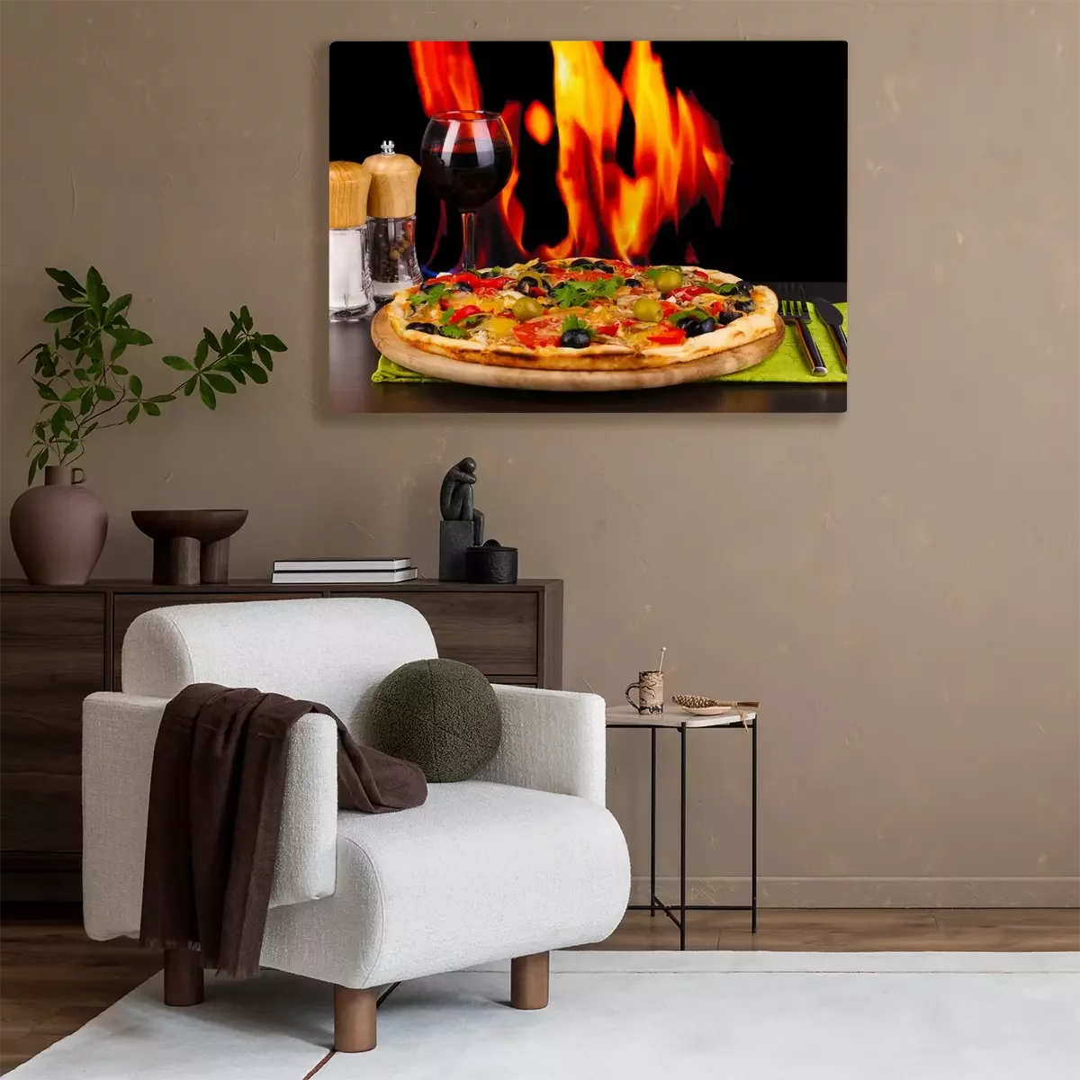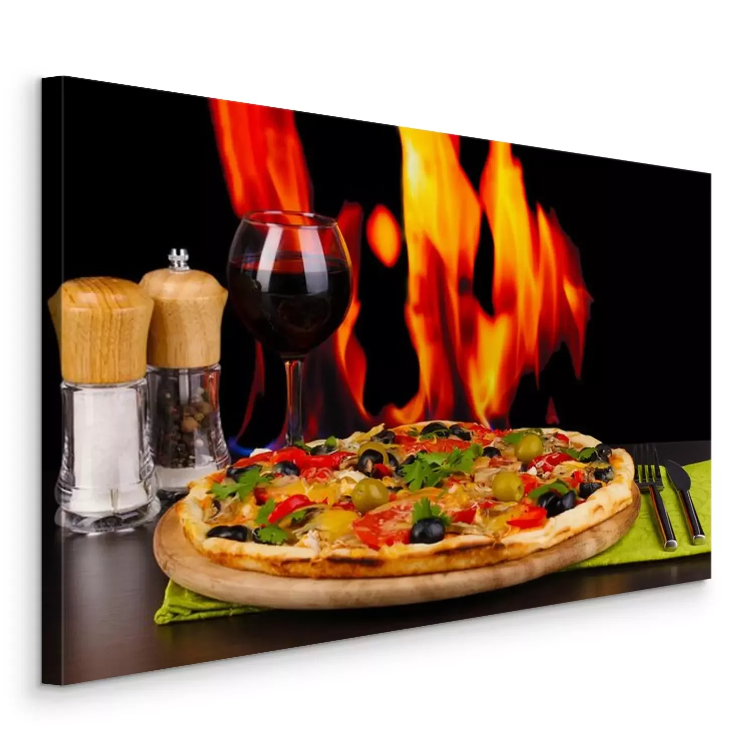 Canvas: Heerlijke pizza met een glas rode wijn en kruiden