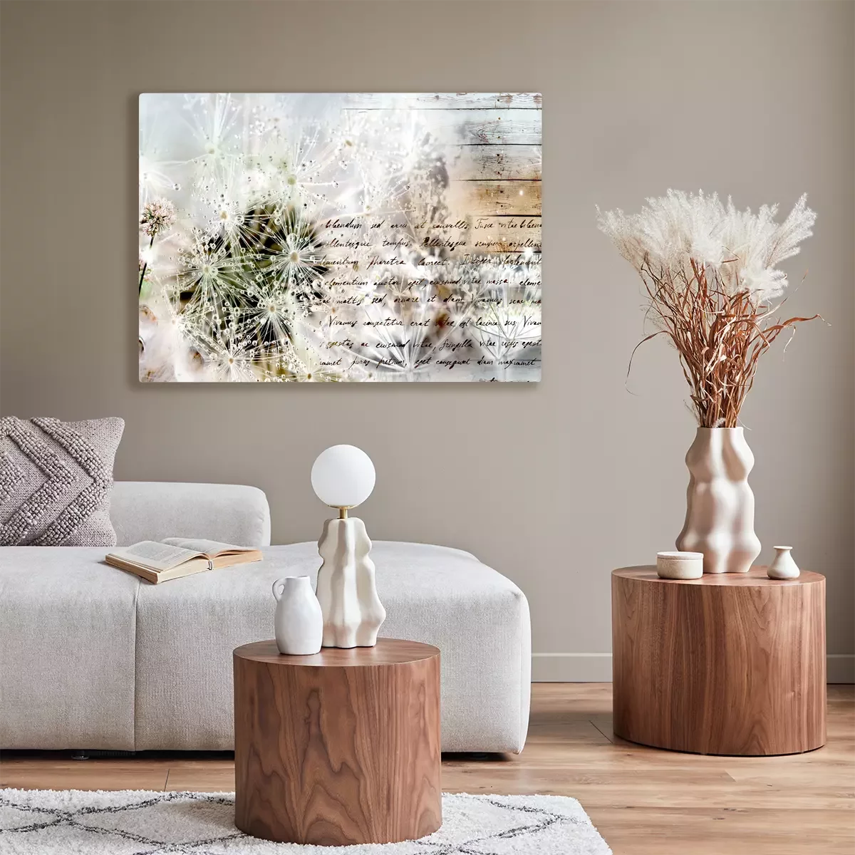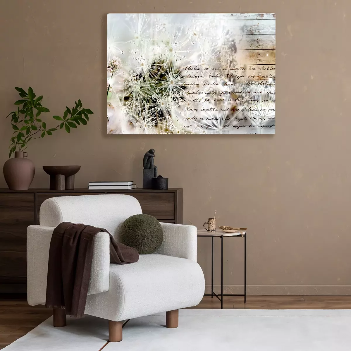 Heldere paardenbloemen met dauw en tekst op een houten achtergrond
