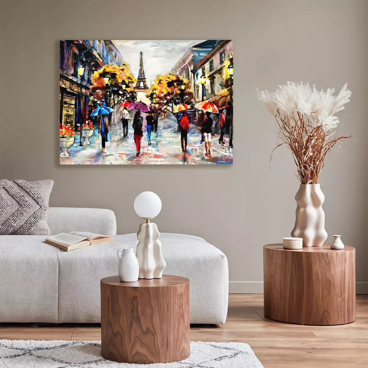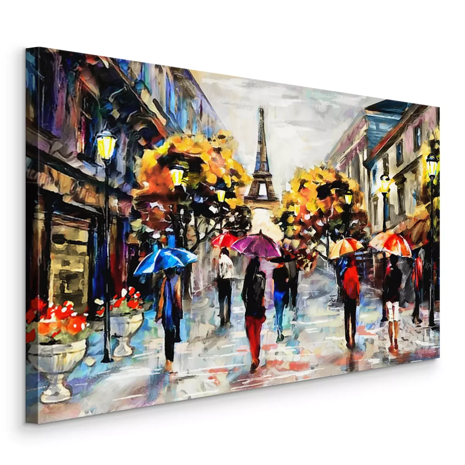 Olieverfschilderij op canvas, uitzicht op de straat van Parijs. Artwork. Eiffeltoren . Mensen onder een rode paraplu. Boom. Frankrijk
