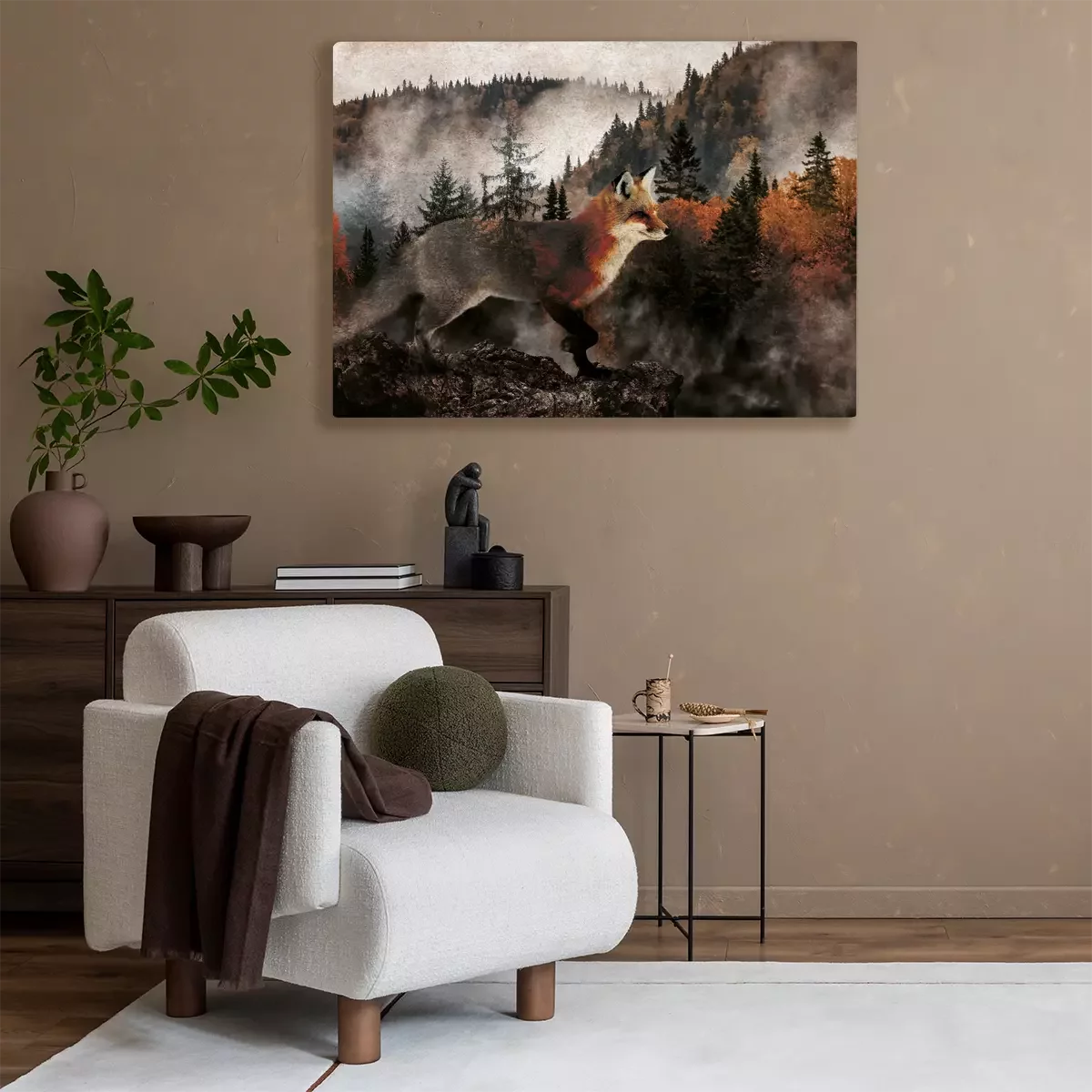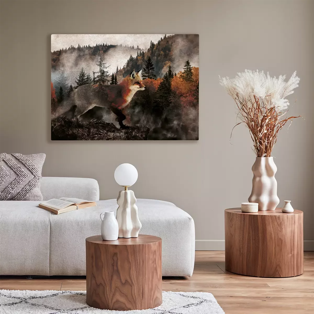 Herfstbos gehuld in mist met een vos