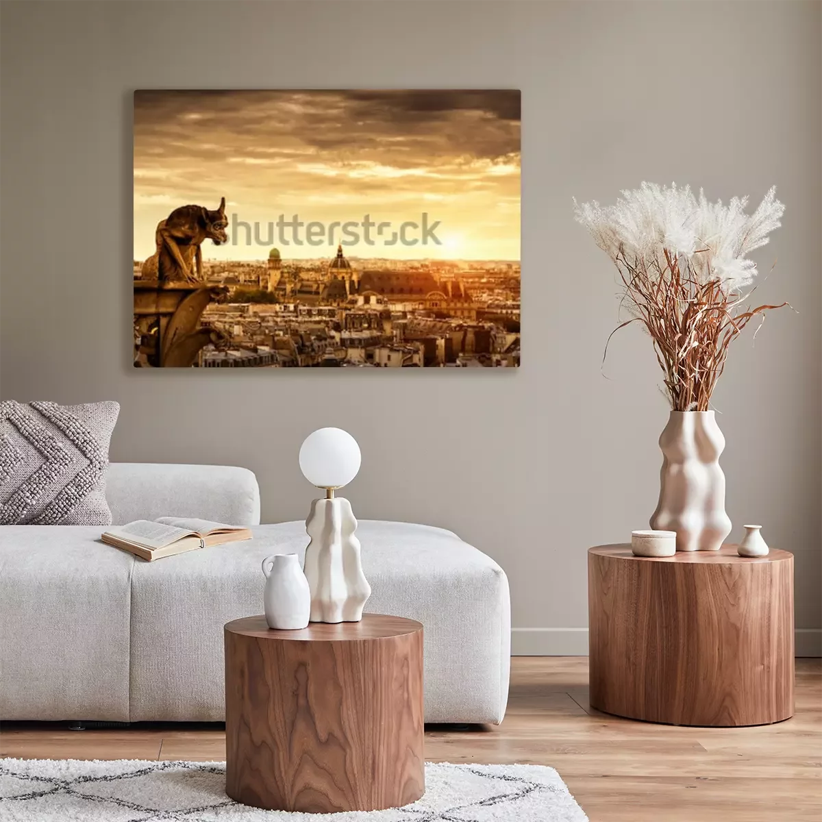 Canvas: Hersenschim of gargouille op de Kathedraal van Notre Dame de Paris die Parijs overzien bij zonsondergang, Frankrijk. Panorama van Parijs met het kwade standbeeld in zonlicht. Mooie zonnige mening van