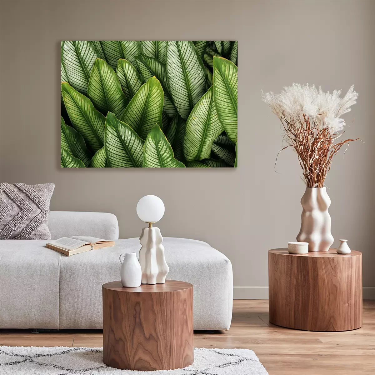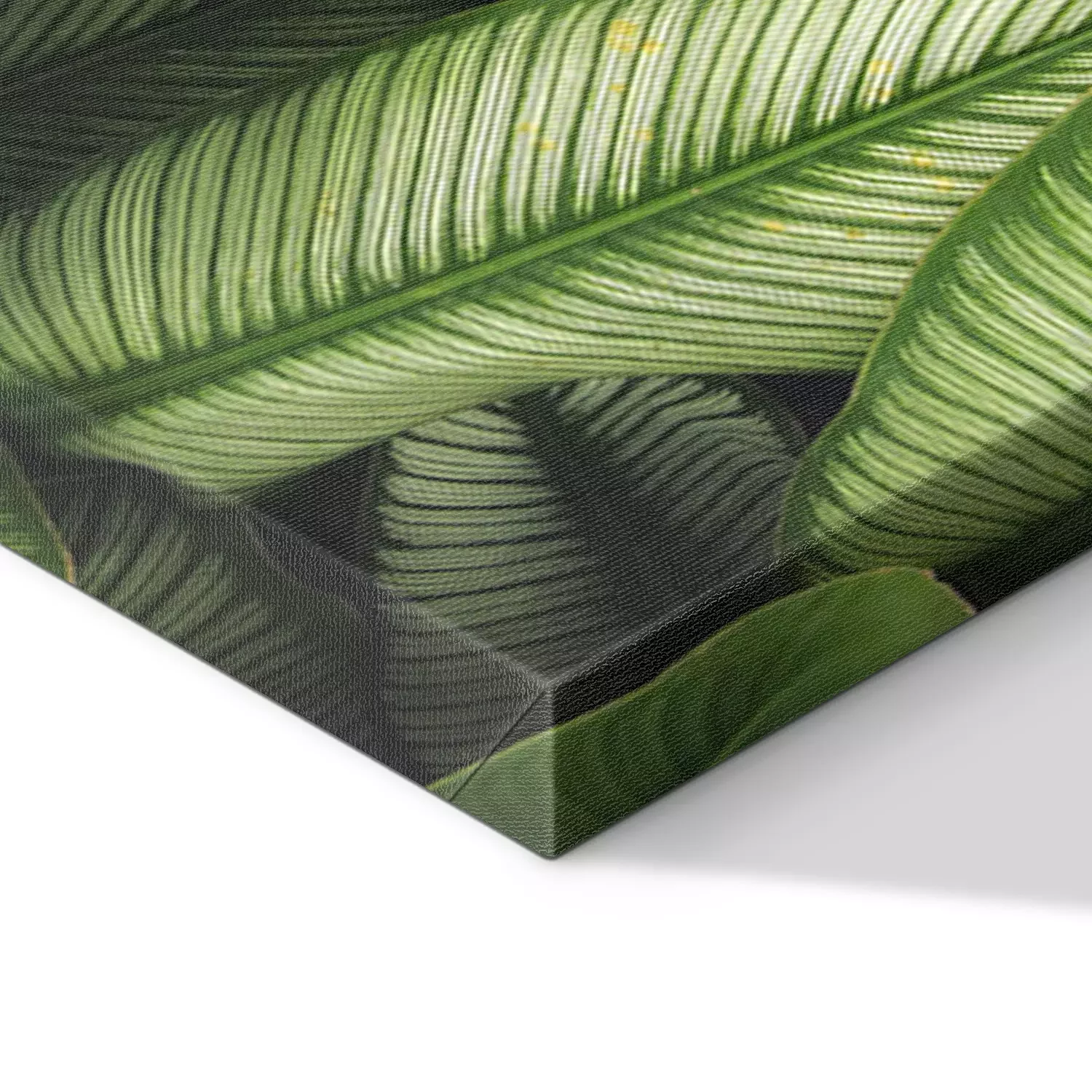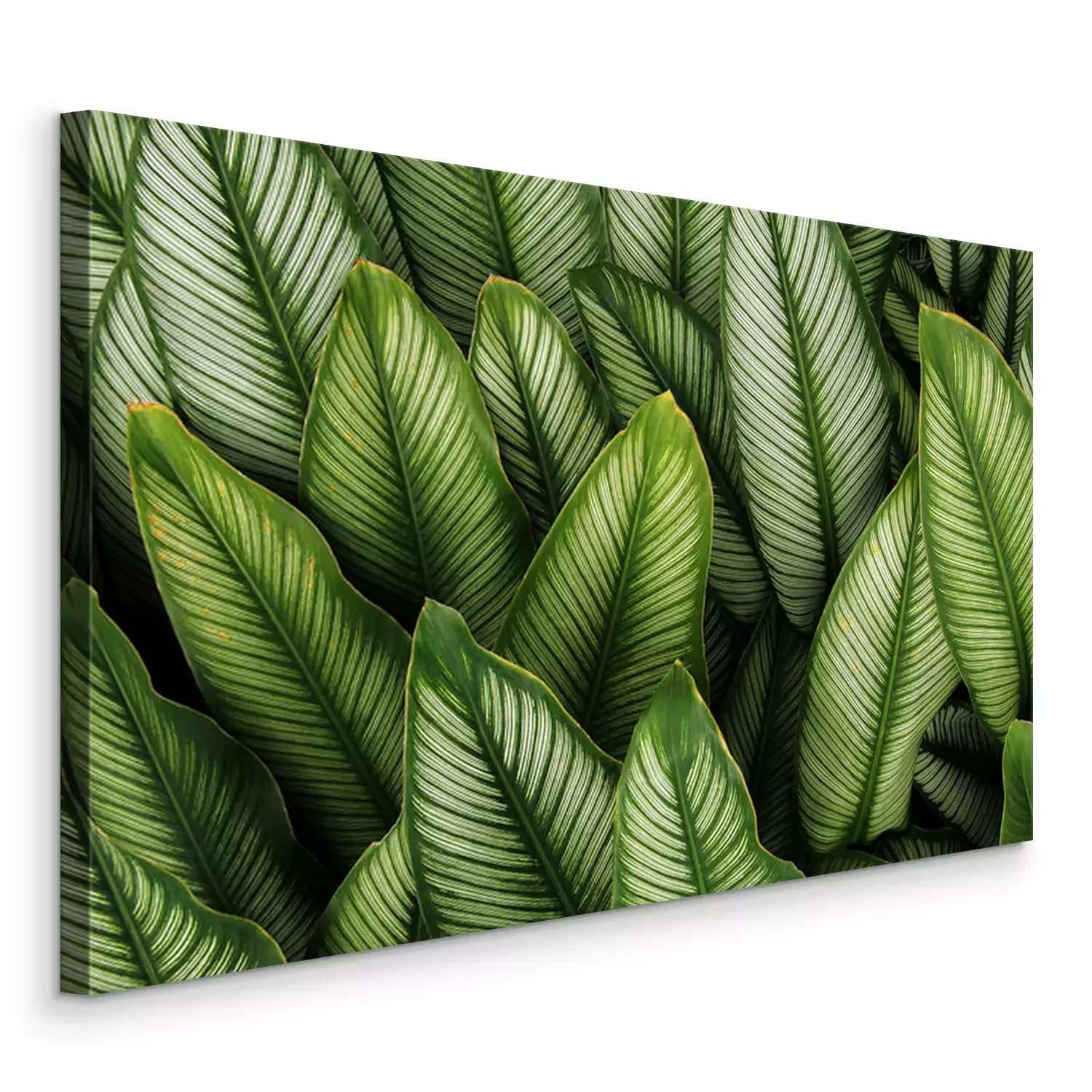 Canvas Het groene blad met witte strepen van majity Calathea, tropische de aard van de gebladerteinstallatie verlaat patroon op donkere achtergrond.