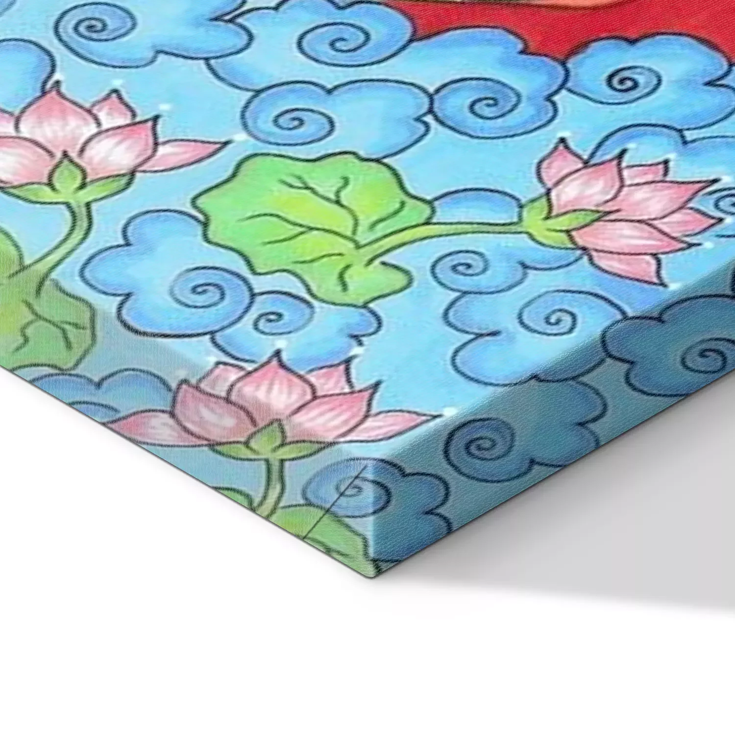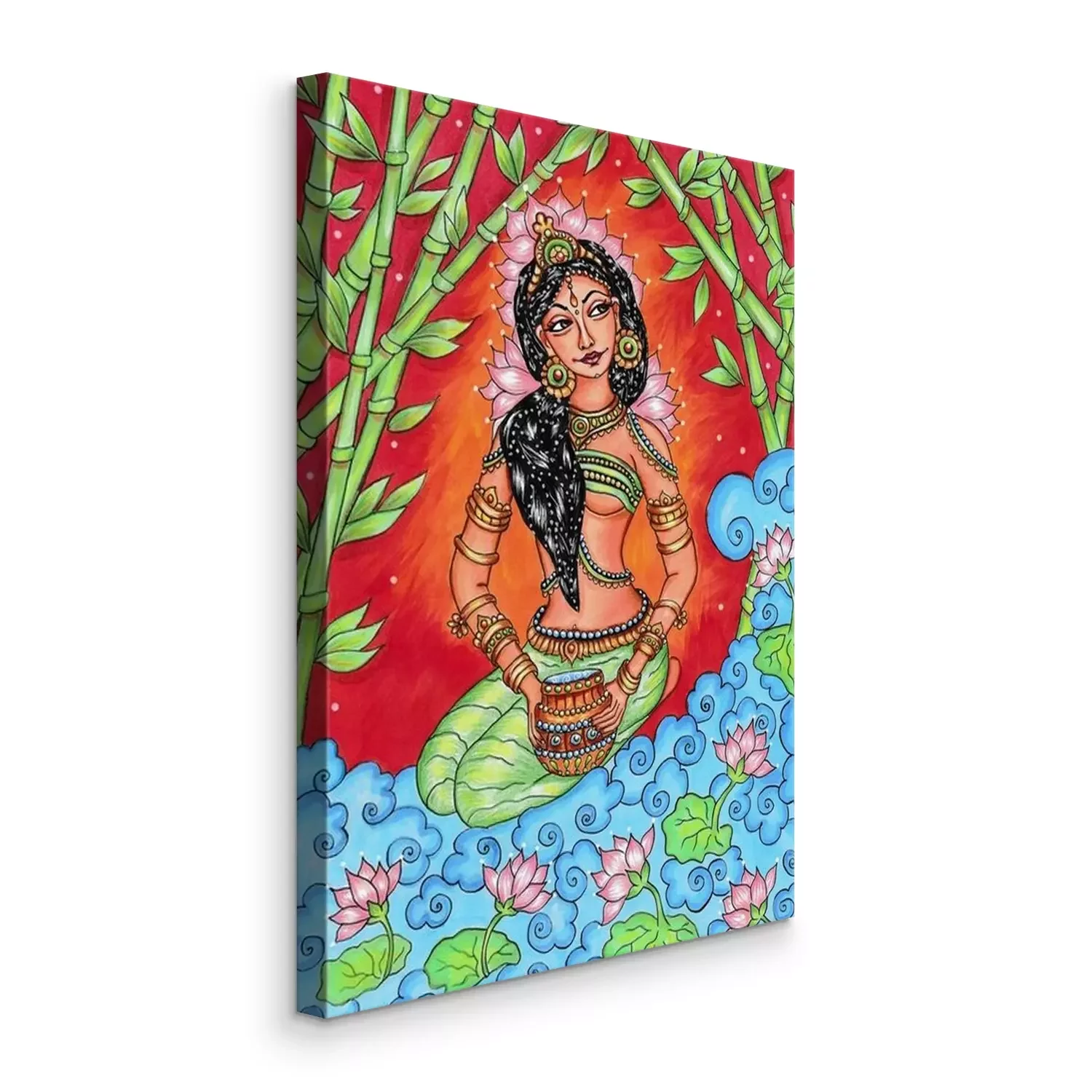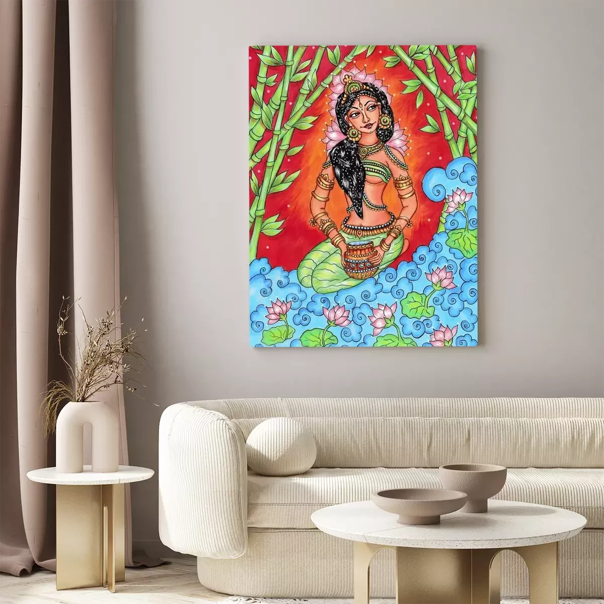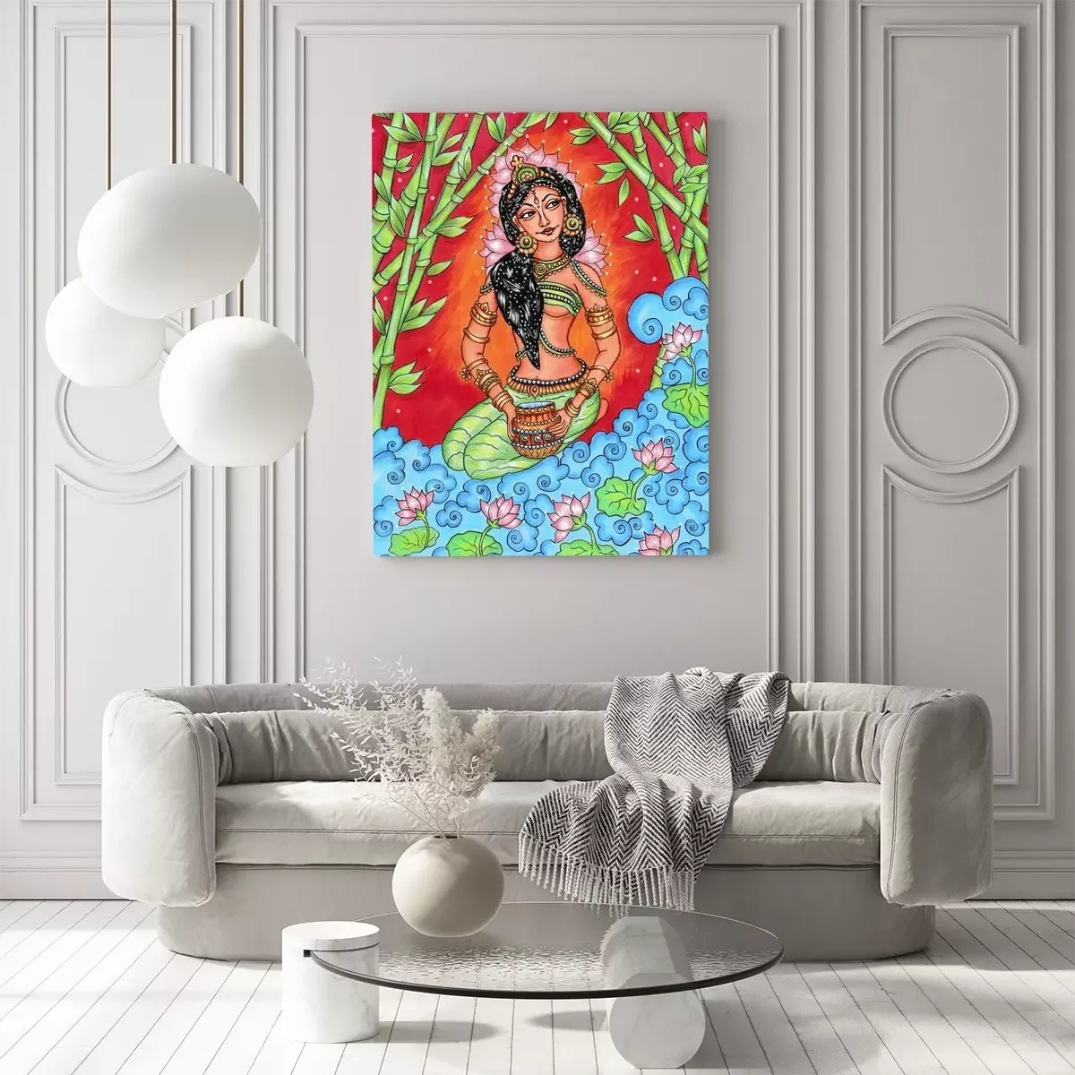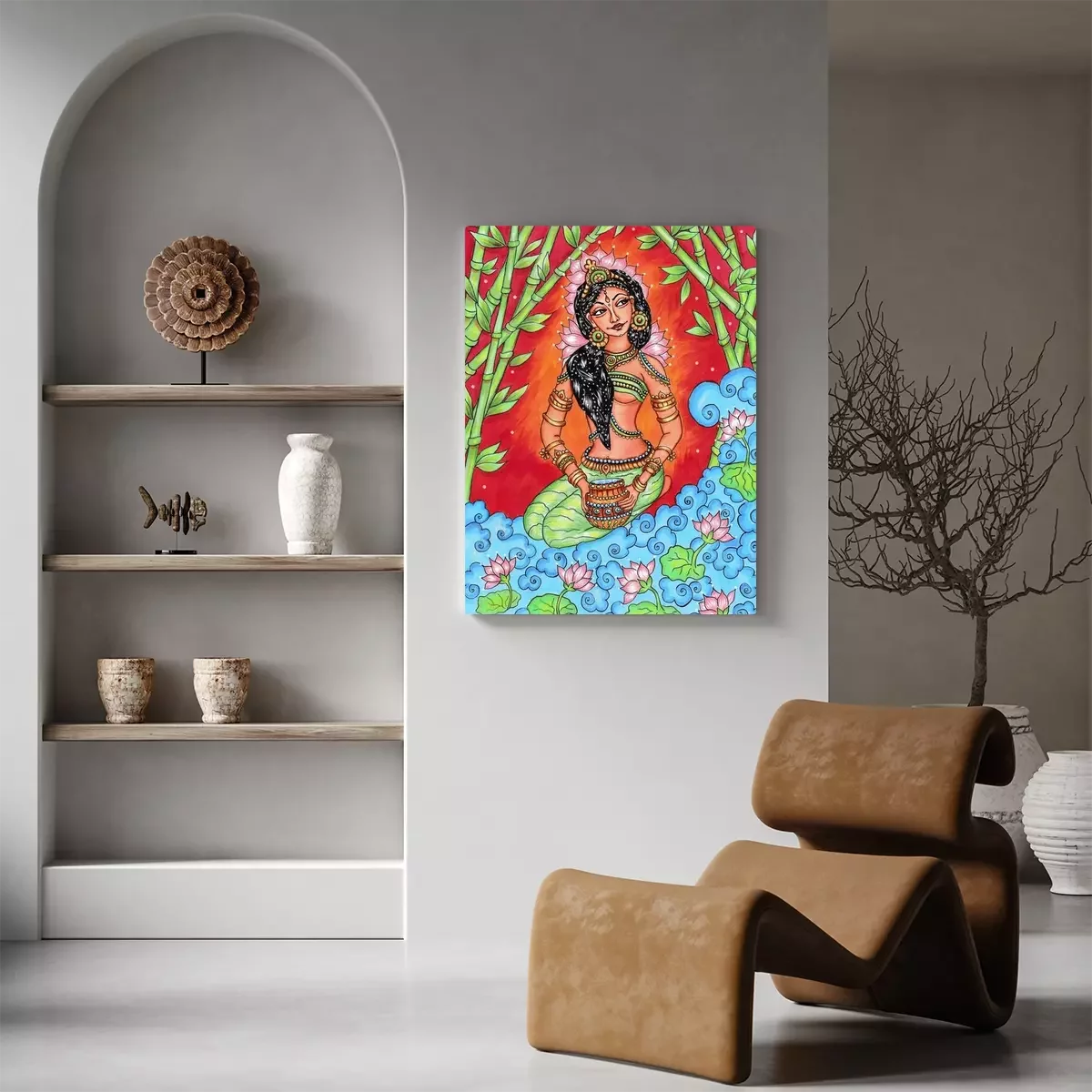Canvas: Het Indische traditionele schilderen van vrouw in aard, de muurschilderingstijl van Kerala met mooie sierachtergrond.