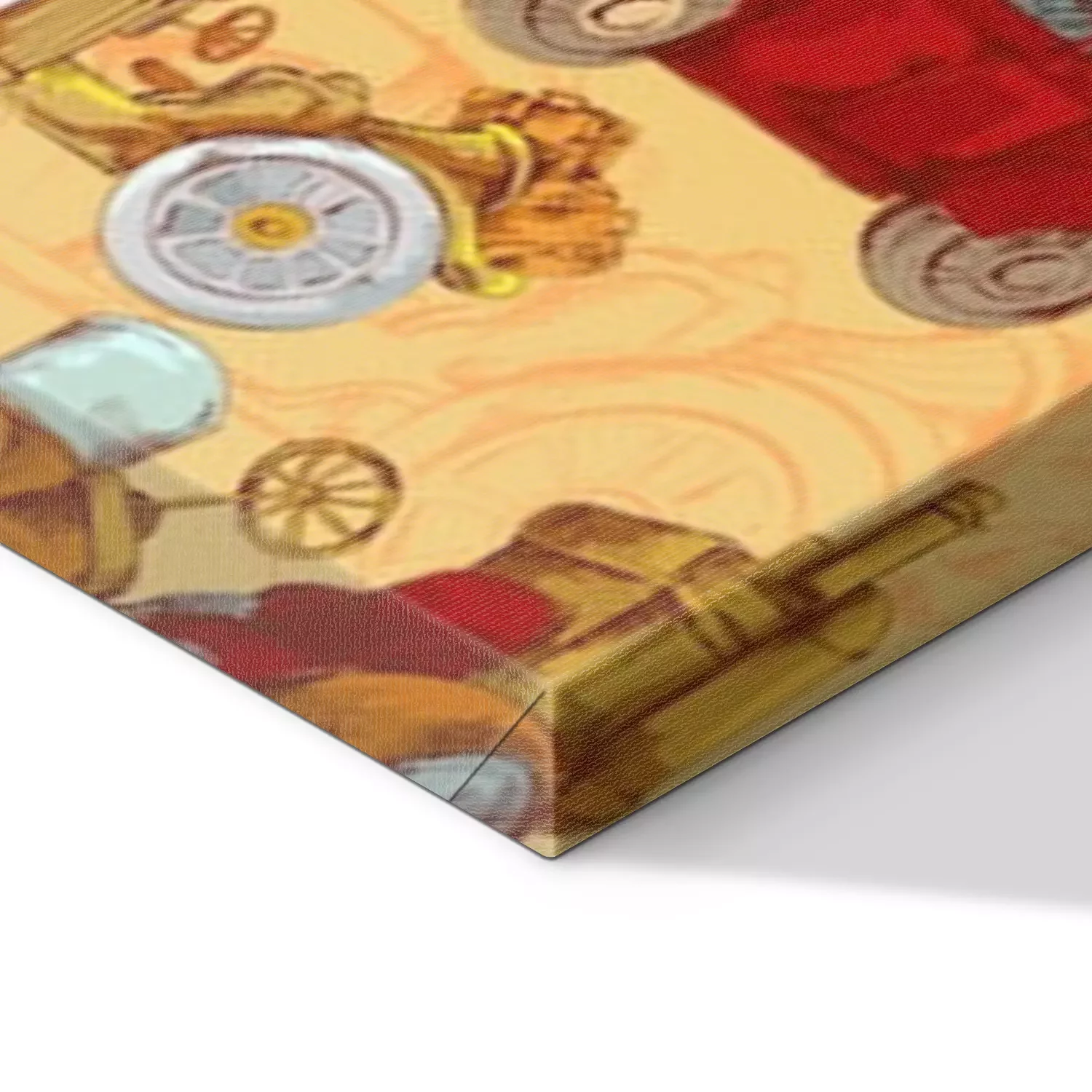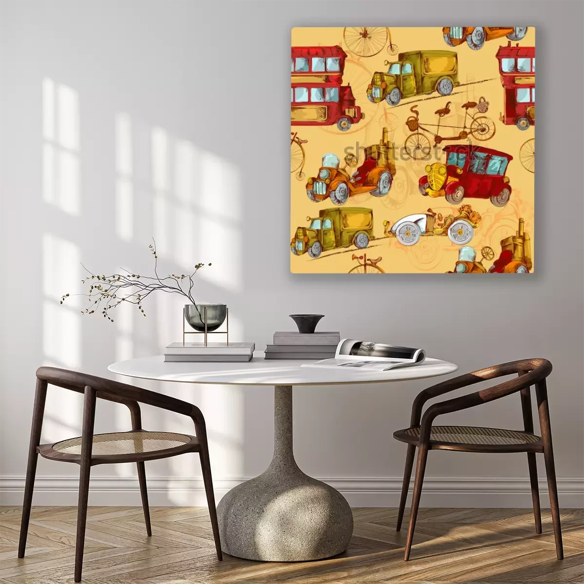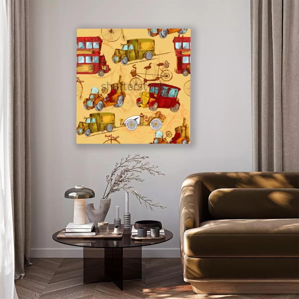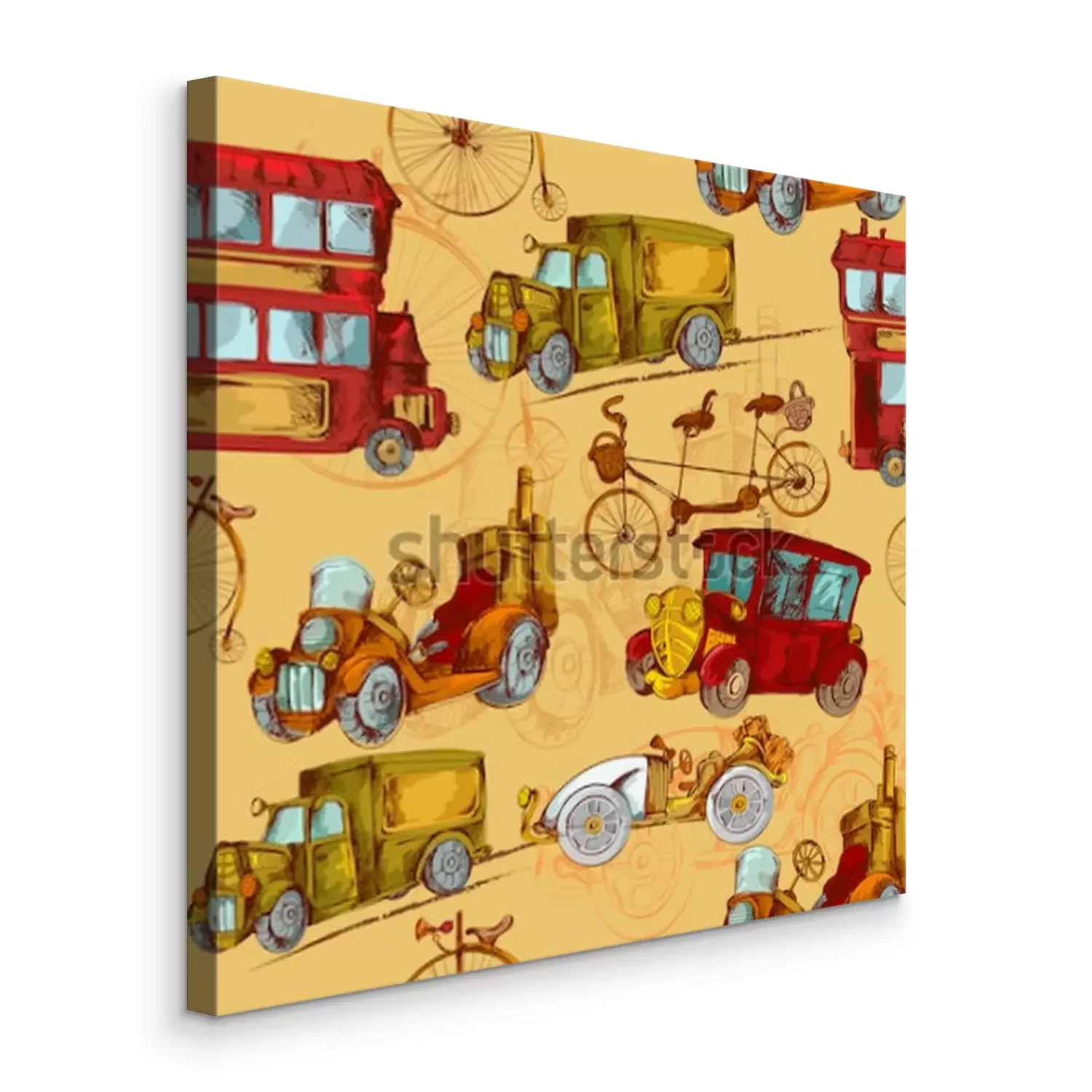Canvas Het uitstekende vervoer van vervoer steampunk auto'sfietsen kleurde naadloze patroon vectorillustratie