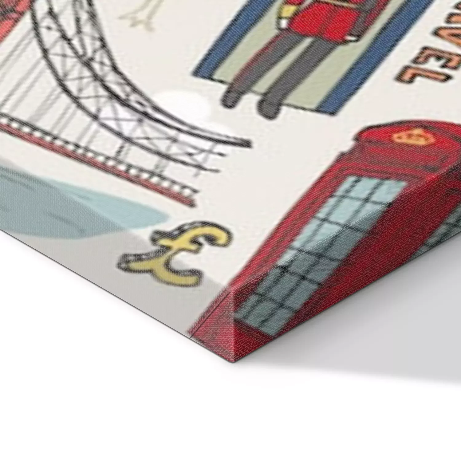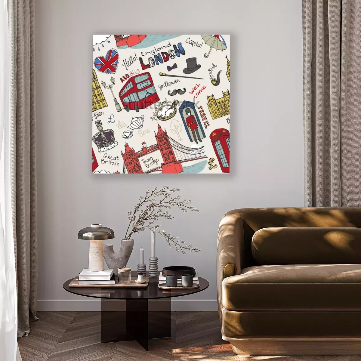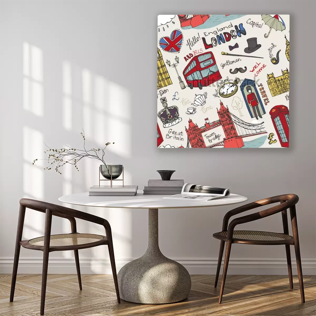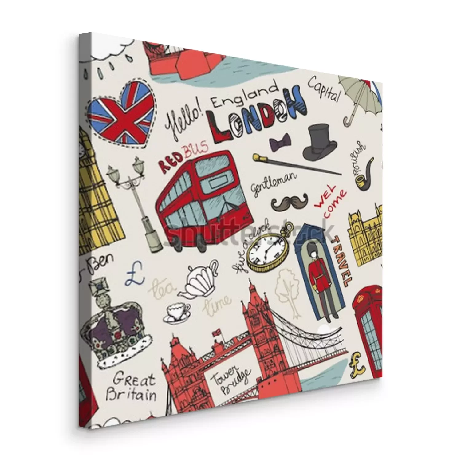 Canvas Het vectororiëntatiepunt van Londen gevangen in naadloos patroon van letters voorzien krabben hand reliëf Beroemde architecturale monumenten, teken, symbolen. Engeland vintage pictogrammen,