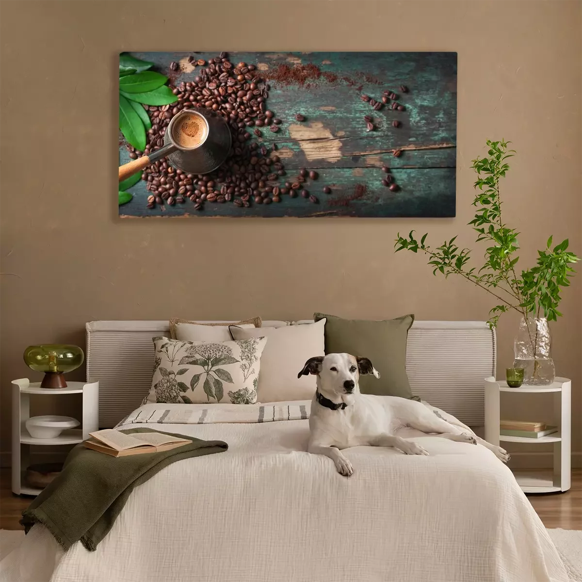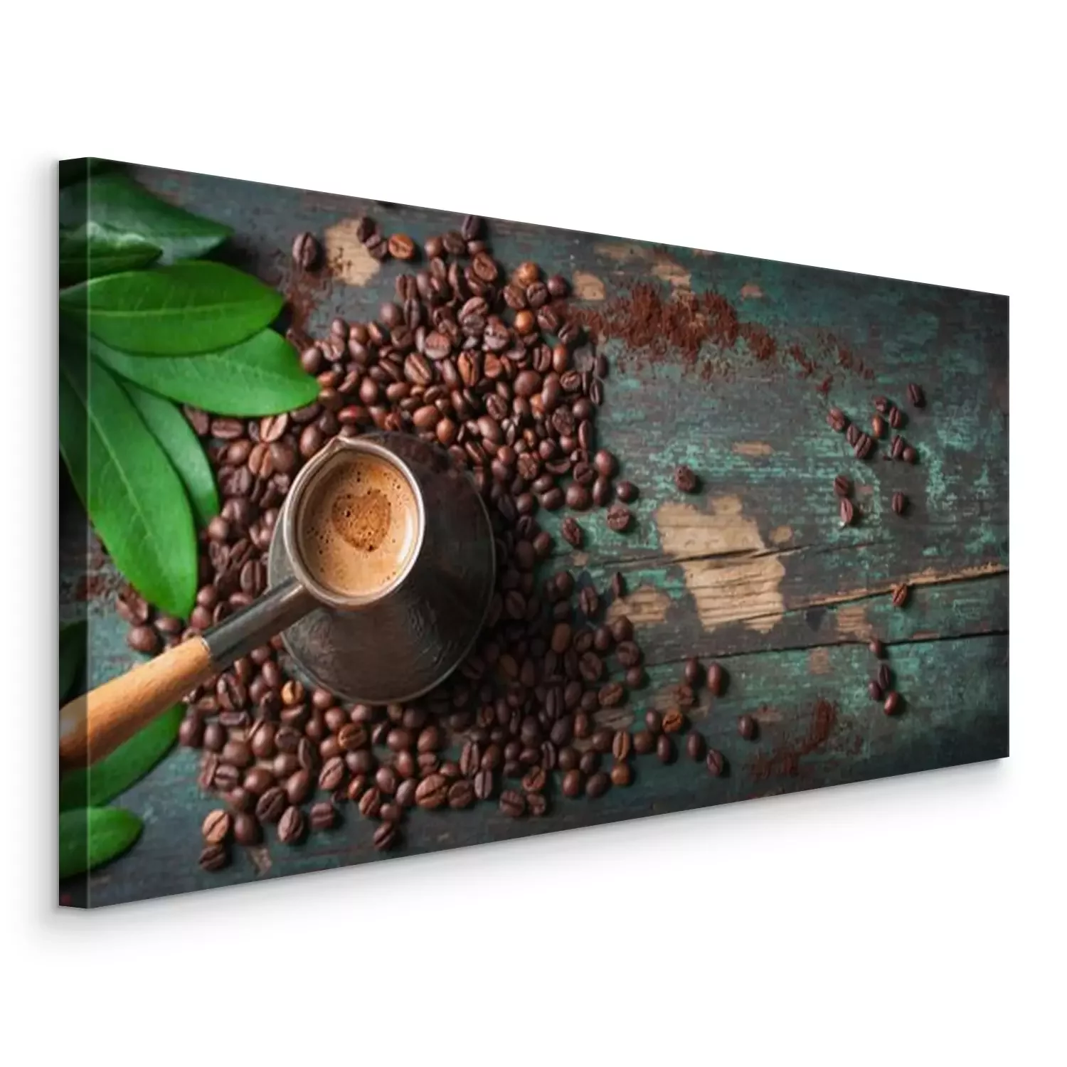 Canvas: Hete koffie in een koffiekan of turk op een houten achtergrond met koffie bladeren en bonen, horizontale met kopie ruimte. bovenaanzicht