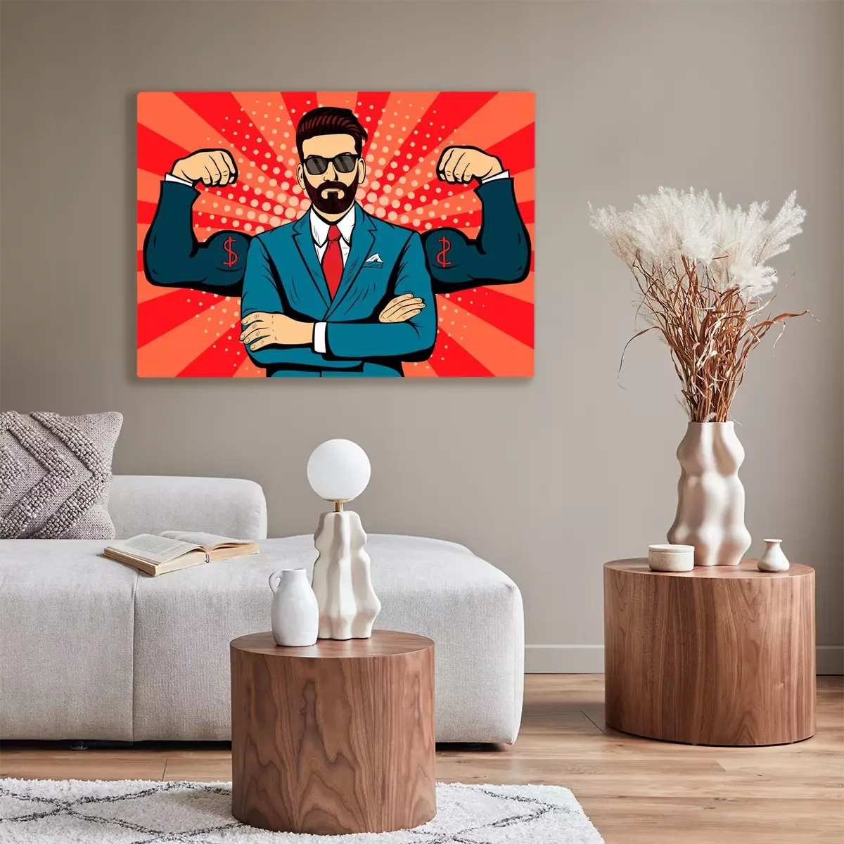 Canvas Hipster beard businessman with muscles pop art retro style. Strong Businessman in glasses in comic style. Success concept vector illustration.
