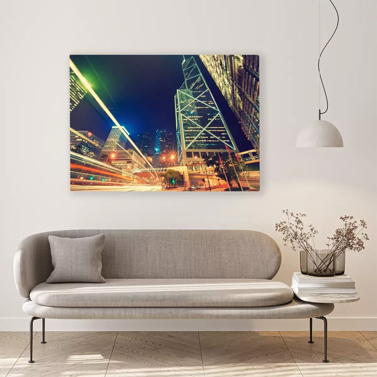 Canvas: Hong Kong, China, nachtzicht. Stralen van felle lichten grote stad Hong Kong