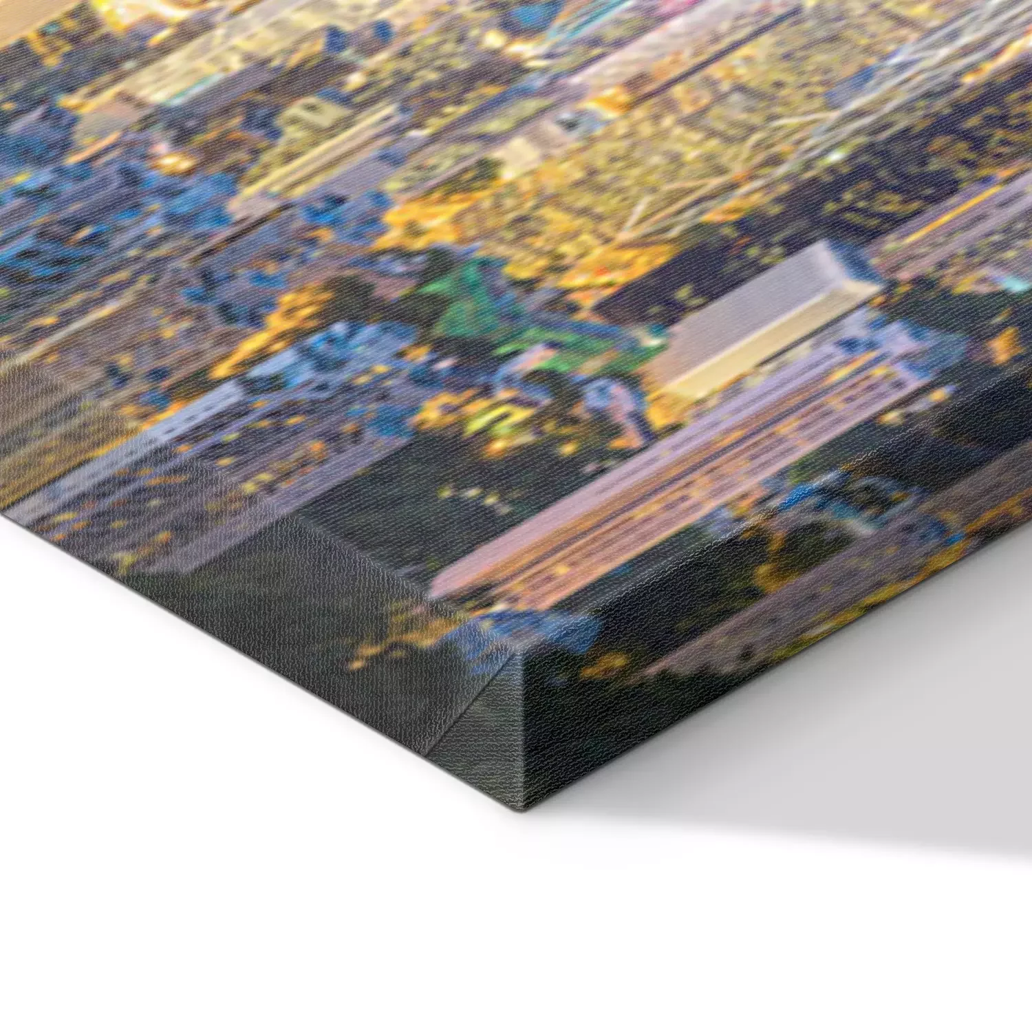 De print wordt aangebracht op hoogwaardig canvas dat op een schildersweefgetouw (spieraam) wordt gespannen. Omdat de print de zijranden bedekt, hoeft het ontwerp niet met een extra kader te worden omlijst. Wij raden ook composities aan die uit meerdere foto's bestaan en zo een coherente compositie vormen.