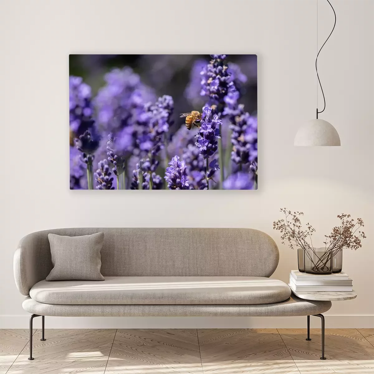 Canvas: Honingbij die stuifmeel op een gebied van lavendel verzamelt