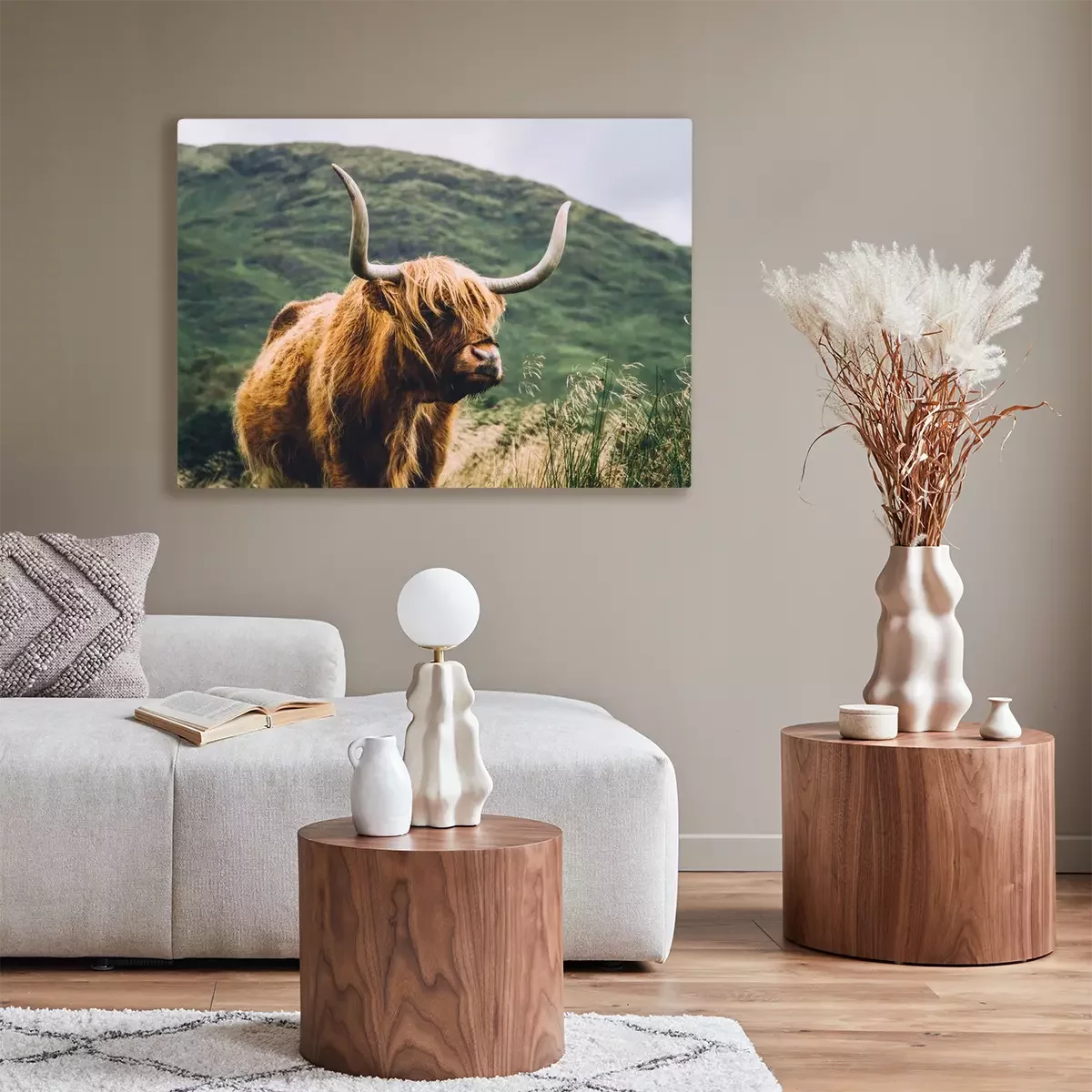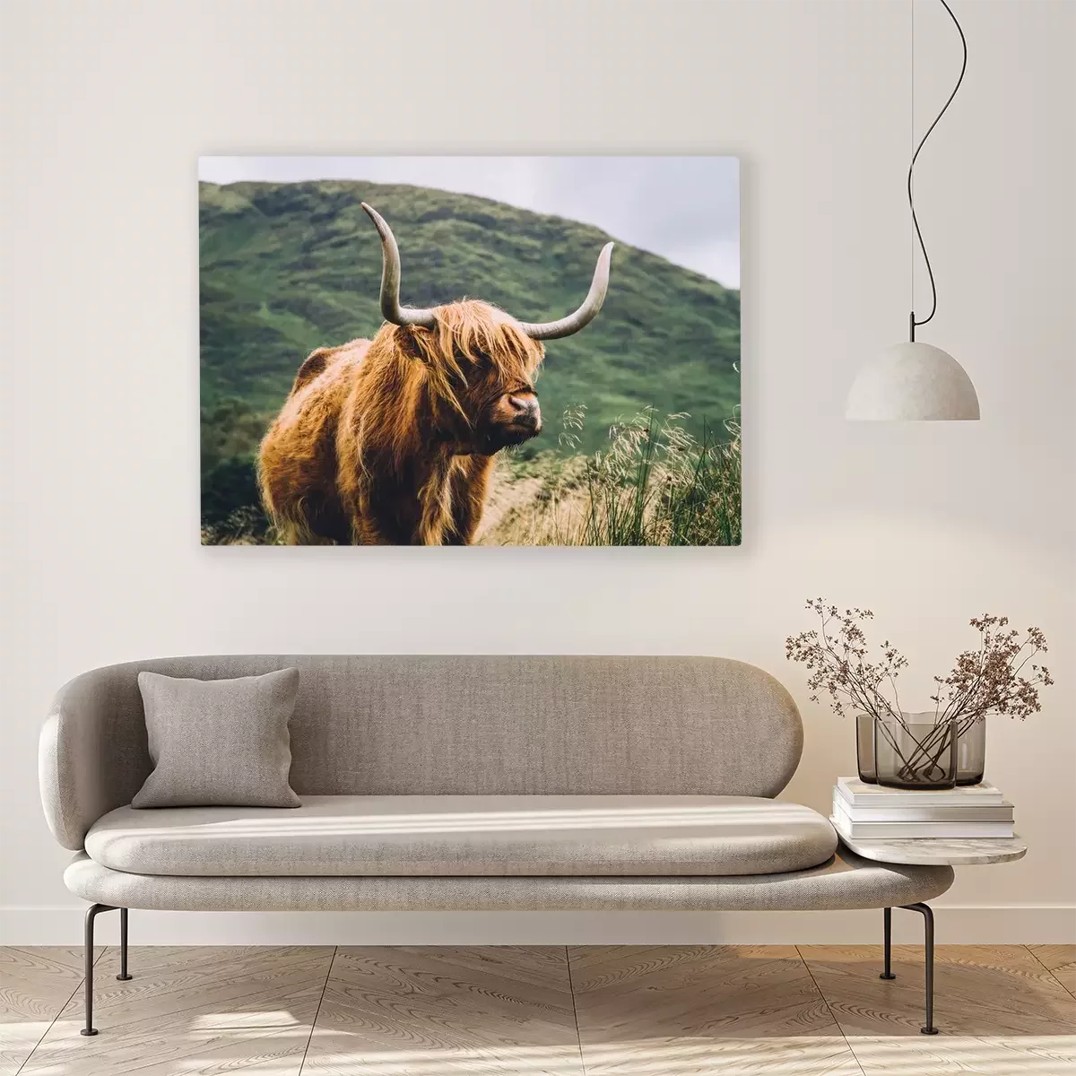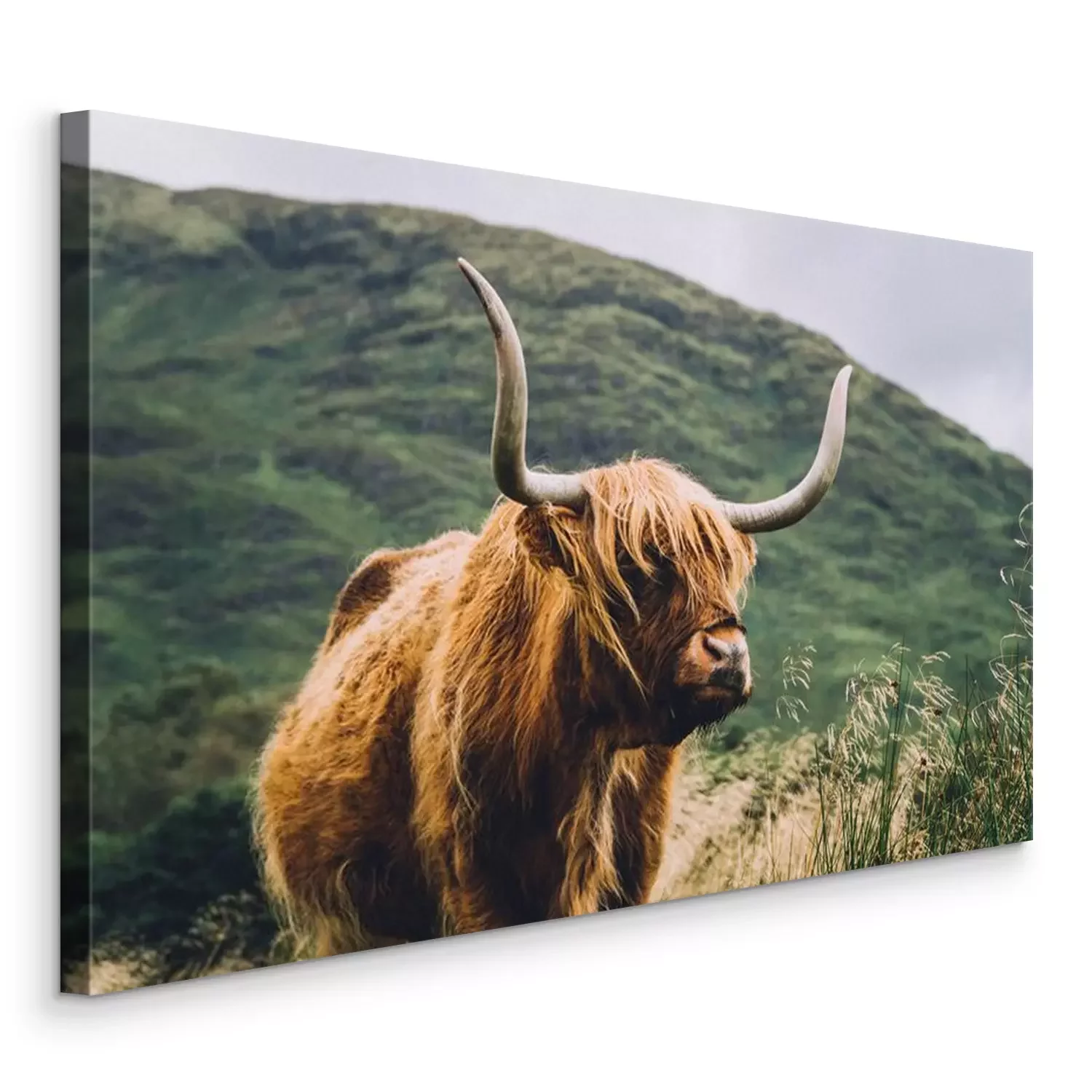 Canvas: Hooglandkoe met een groene heuvel op de achtergrond