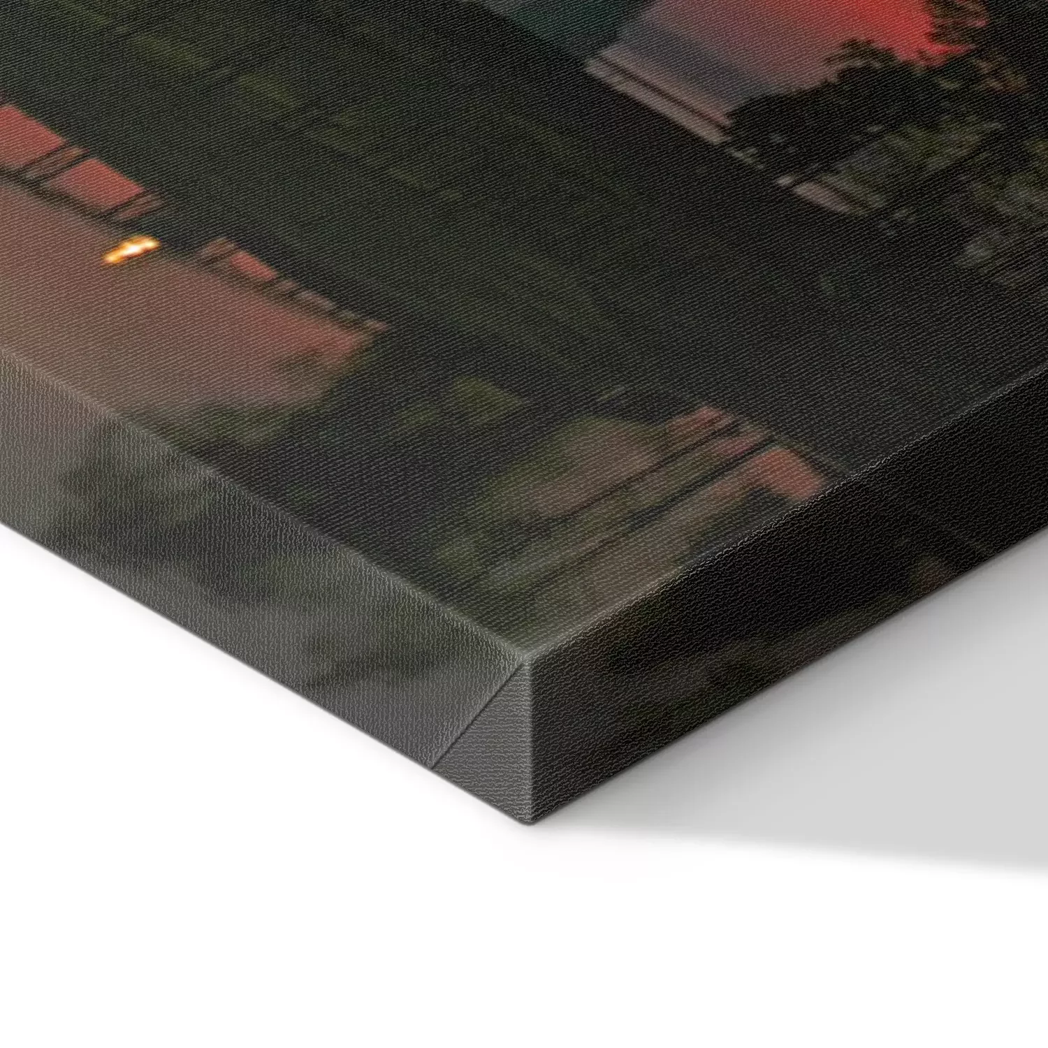 De print wordt aangebracht op hoogwaardig canvas dat op een schildersweefgetouw (spieraam) wordt gespannen. Omdat de print de zijranden bedekt, hoeft het ontwerp niet met een extra kader te worden omlijst. Wij raden ook composities aan die uit meerdere foto's bestaan en zo een coherente compositie vormen.