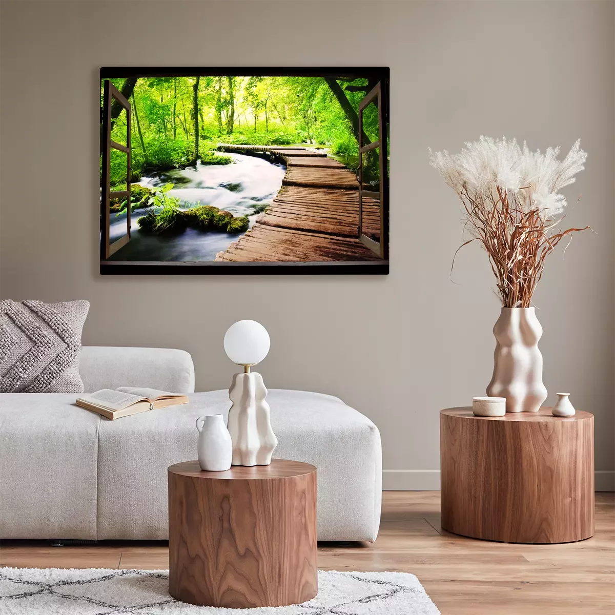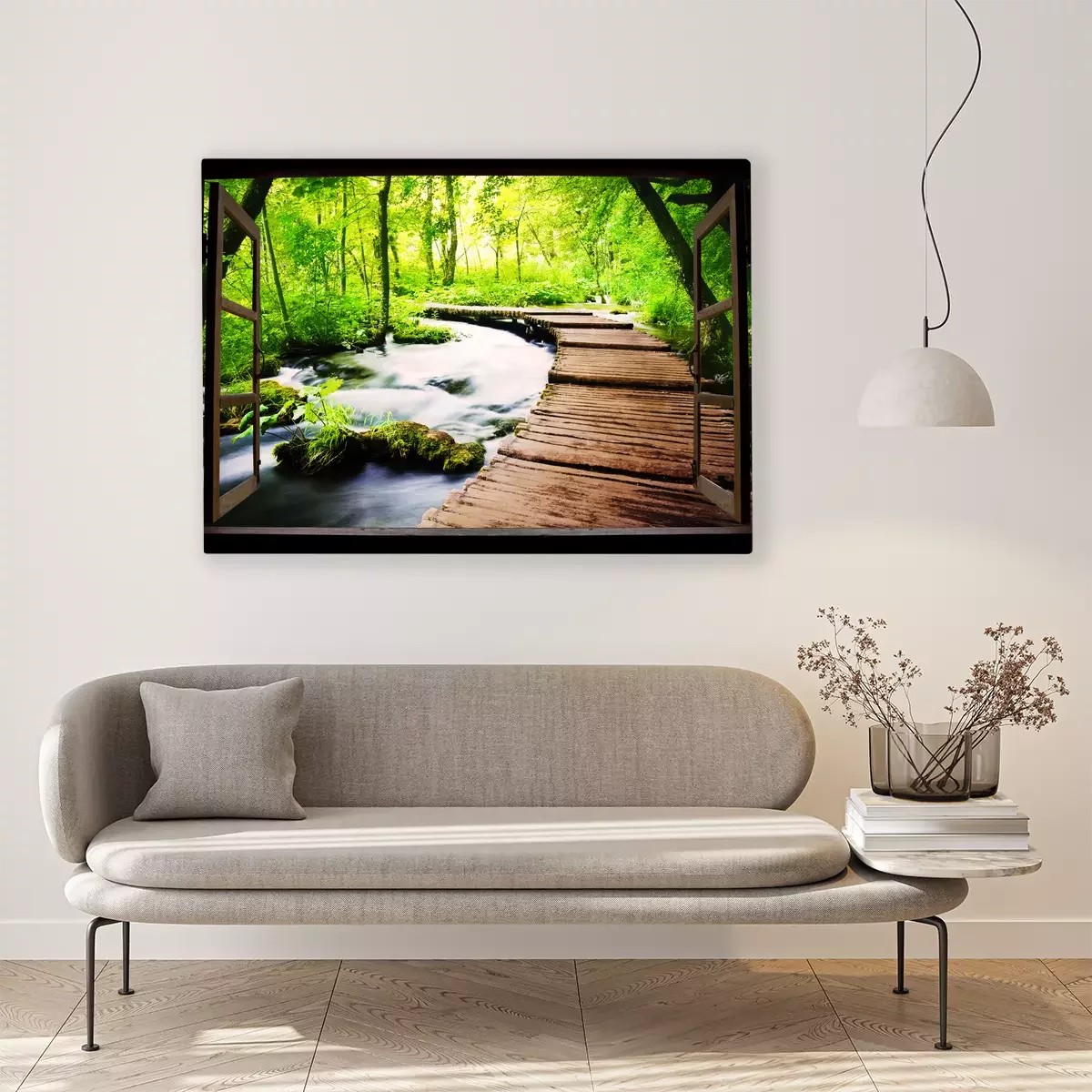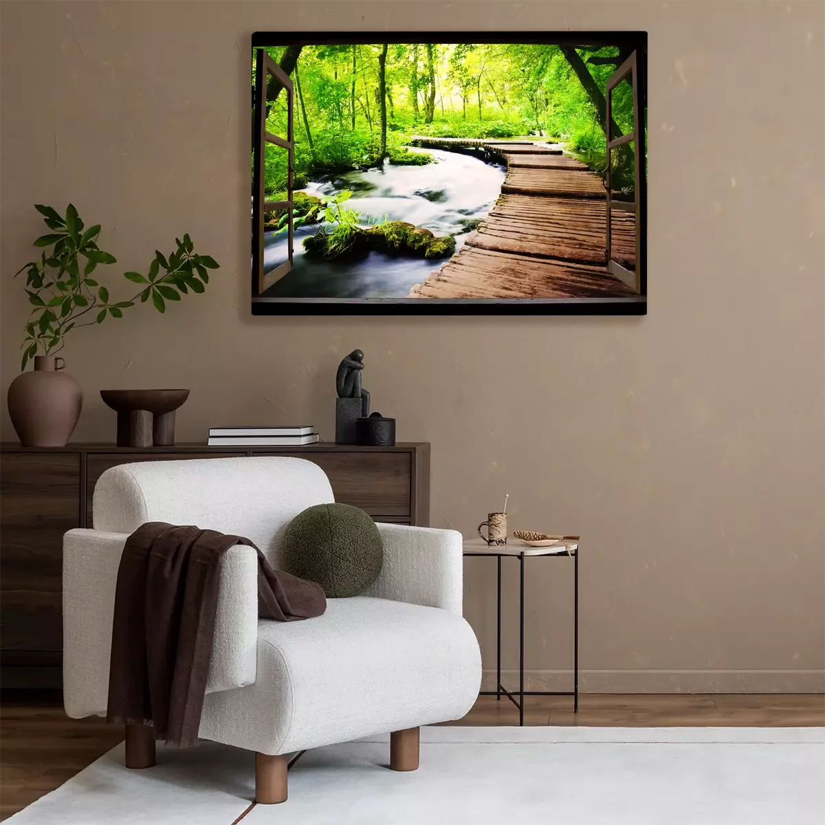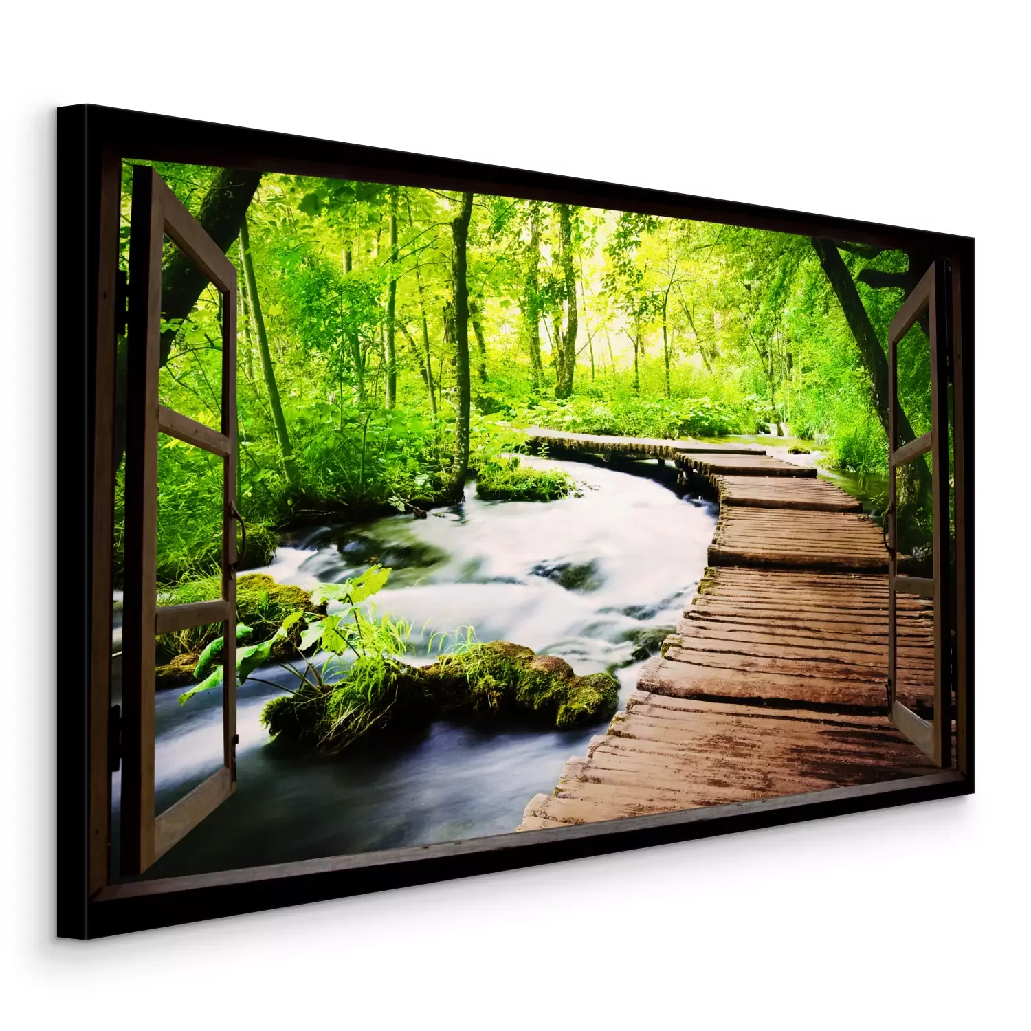 Houten raam open naar de rivier in het bos