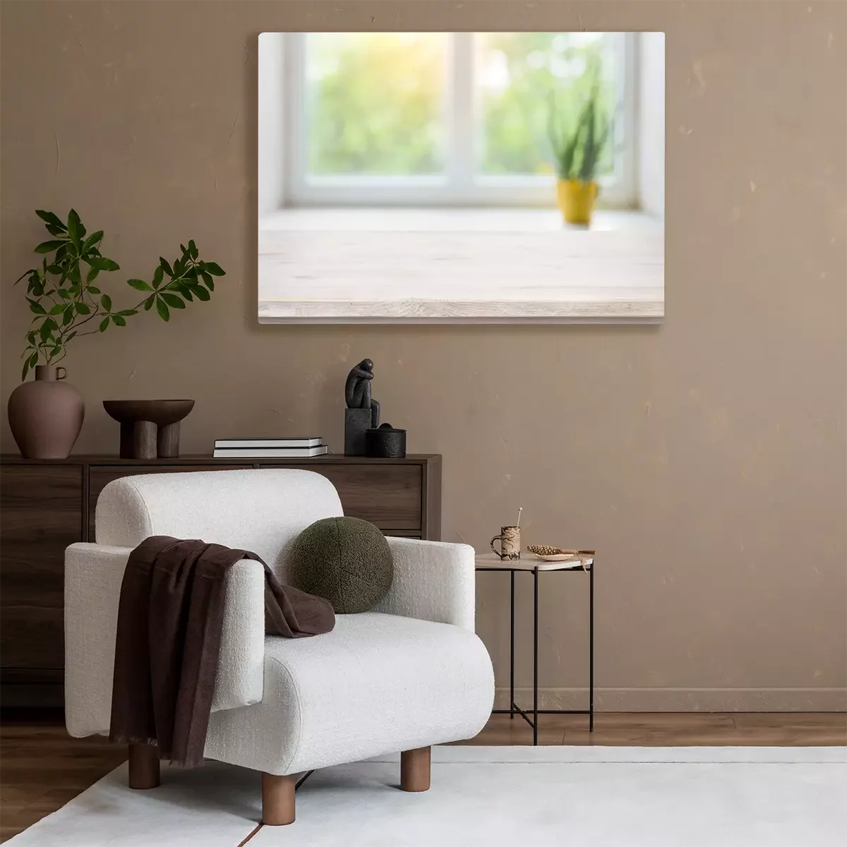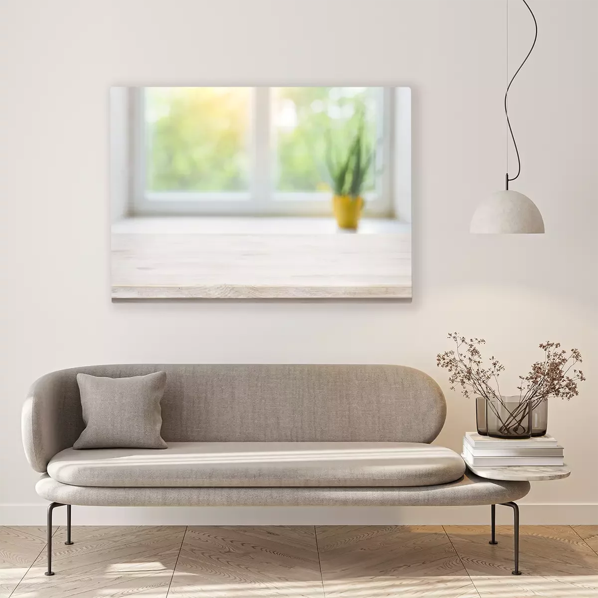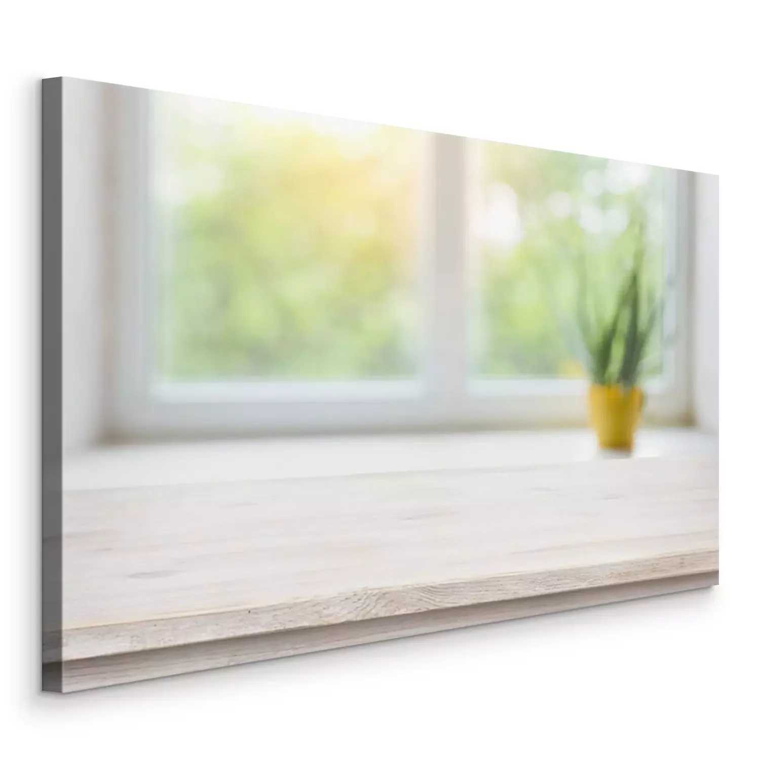 Canvas: Houten tafel op een wazig herfst raam met plantenpot achtergrond