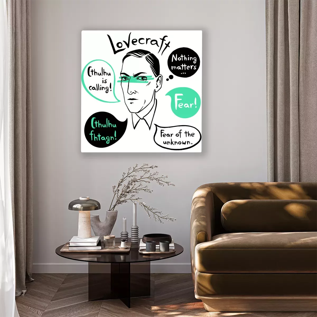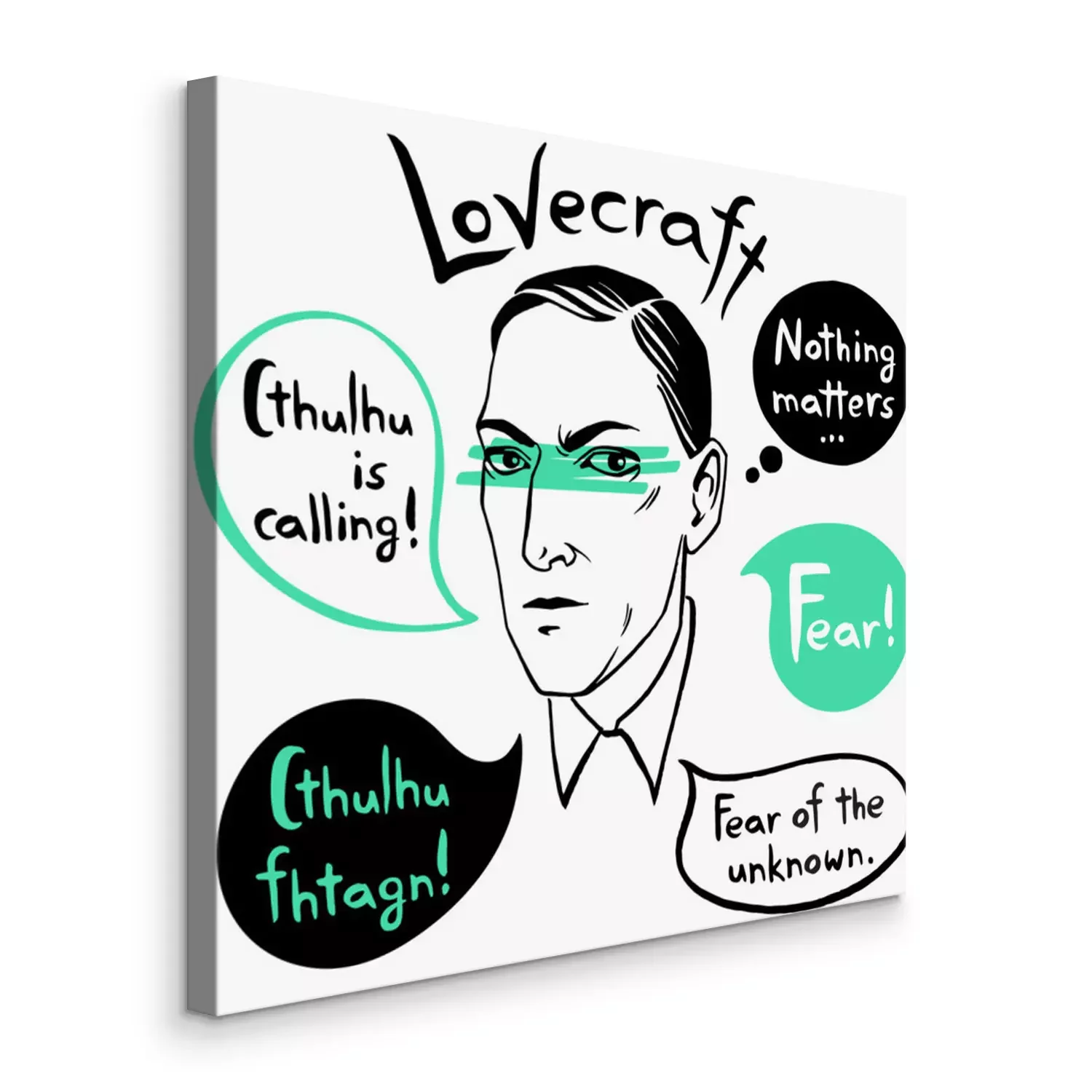 Canvas Howard Phillips Lovecraft-portret met toespraakbellen en de citaten van beroemde schrijver, citaten. Horror fictie boek inkt getekend vectorillustratie met belettering angst! Cthulhu belt.