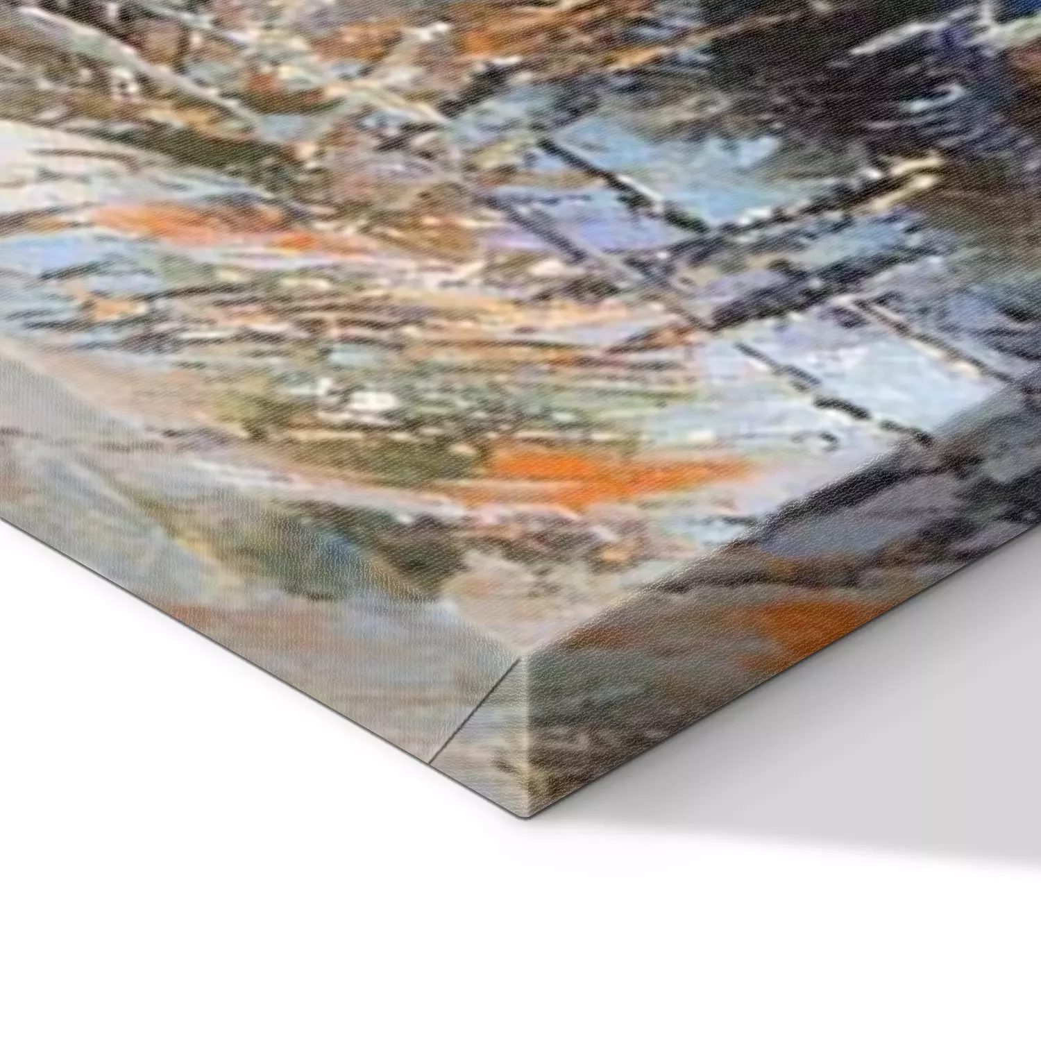 De print wordt aangebracht op hoogwaardig canvas dat op een schildersweefgetouw (spieraam) wordt gespannen. Omdat de print de zijranden bedekt, hoeft het ontwerp niet met een extra kader te worden omlijst. Wij raden ook composities aan die uit meerdere foto's bestaan en zo een coherente compositie vormen.