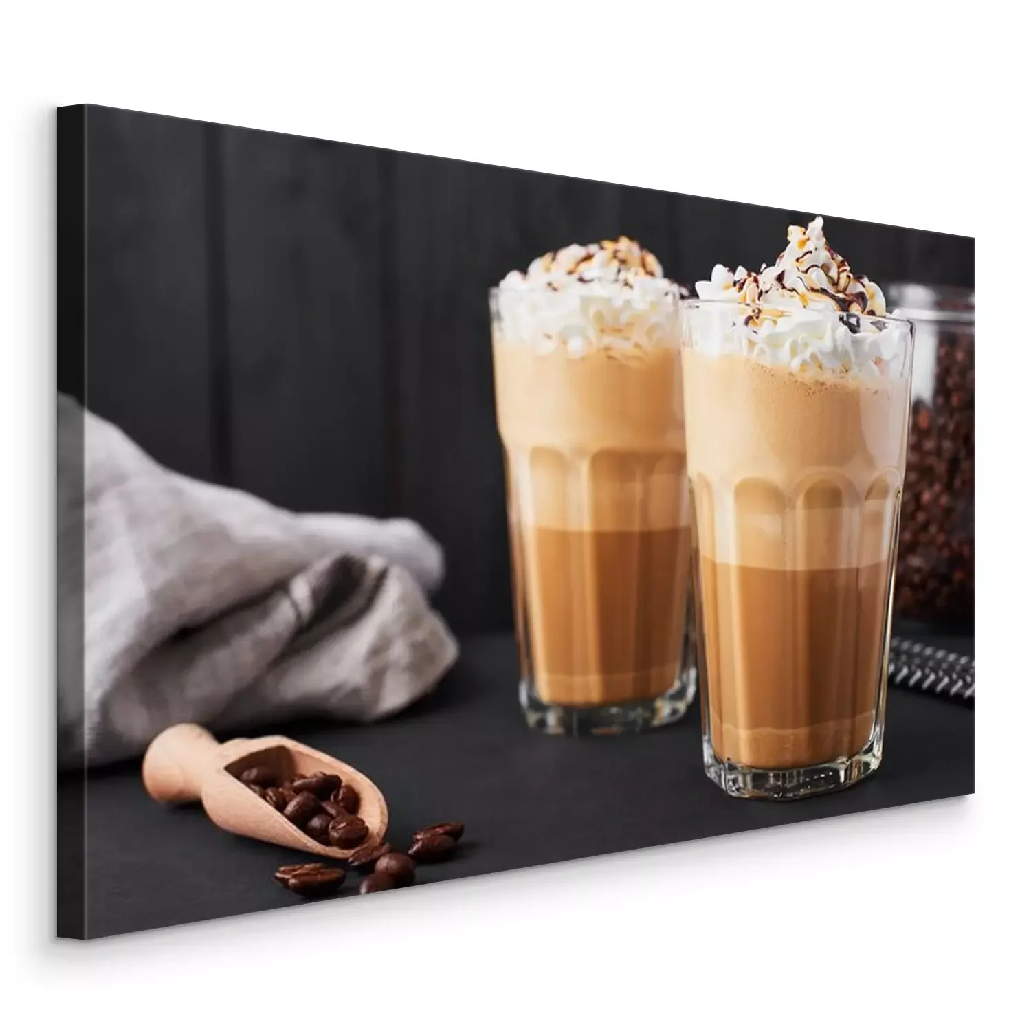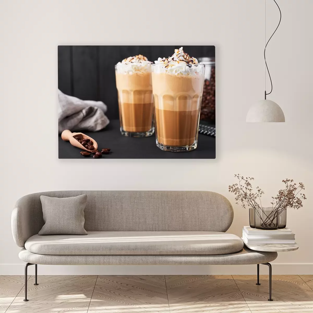 Canvas: Iced caramel latte koffie in een hoog glas met chocoladesiroop en slagroom. Donkere houten achtergrond.