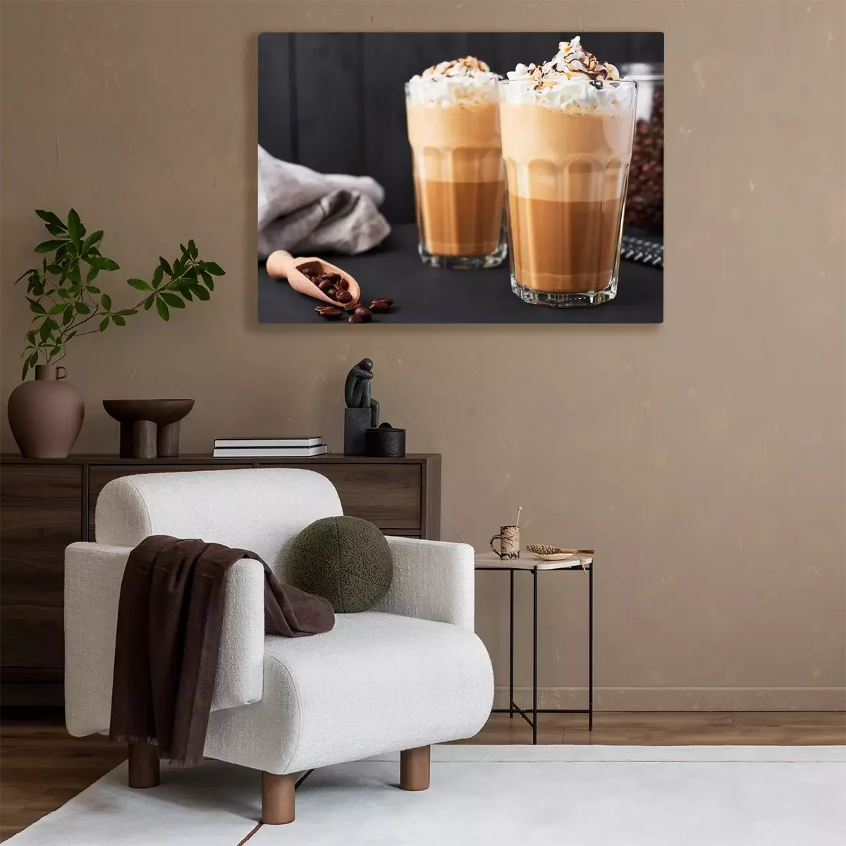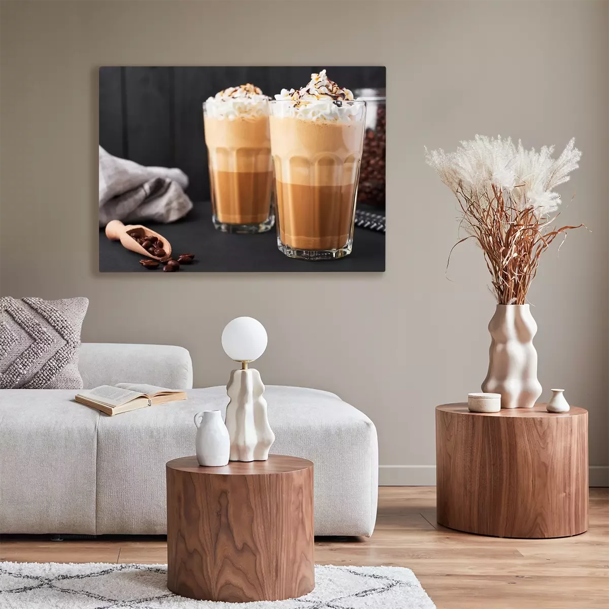 Canvas Iced caramel latte koffie in een hoog glas met chocoladesiroop en slagroom. Donkere houten achtergrond.