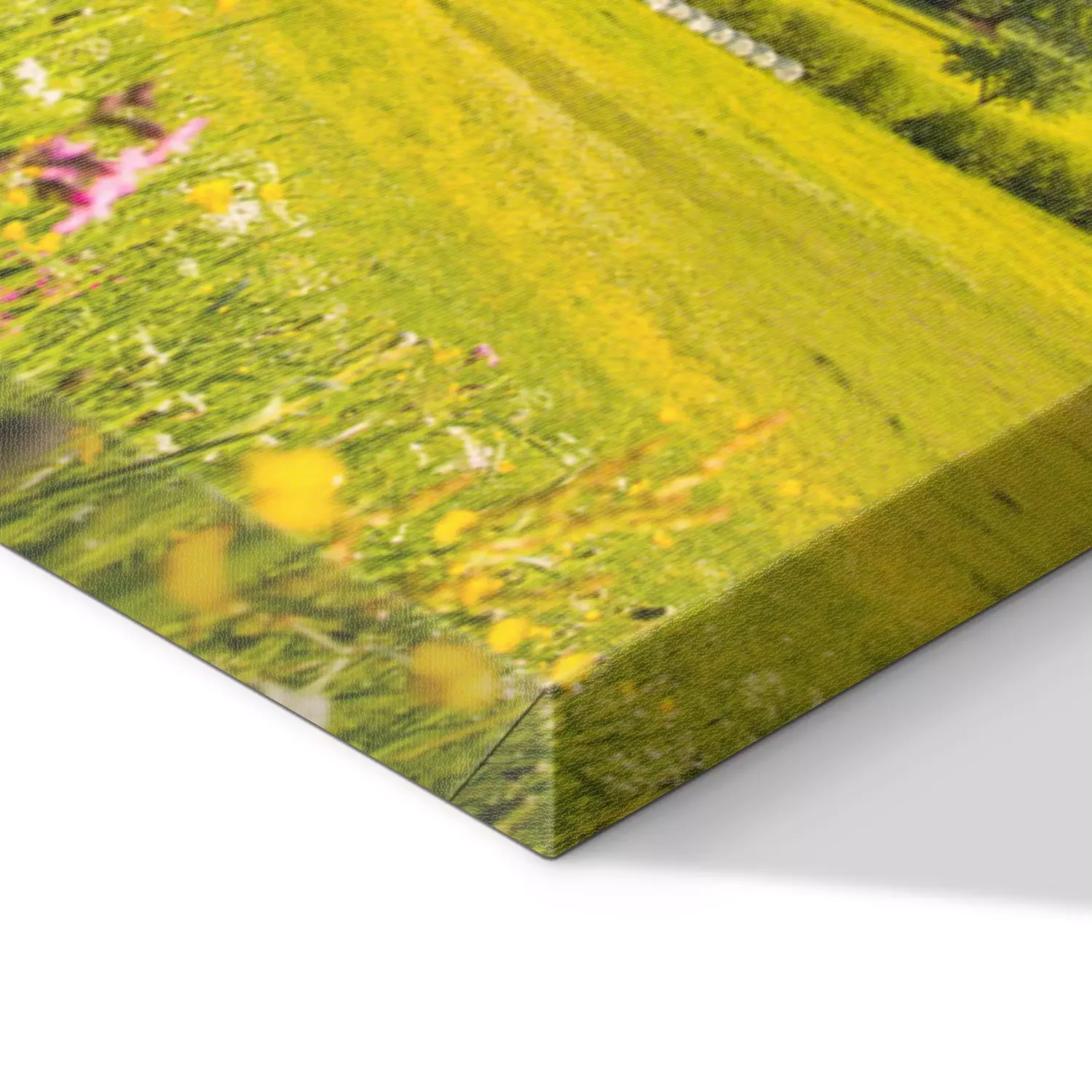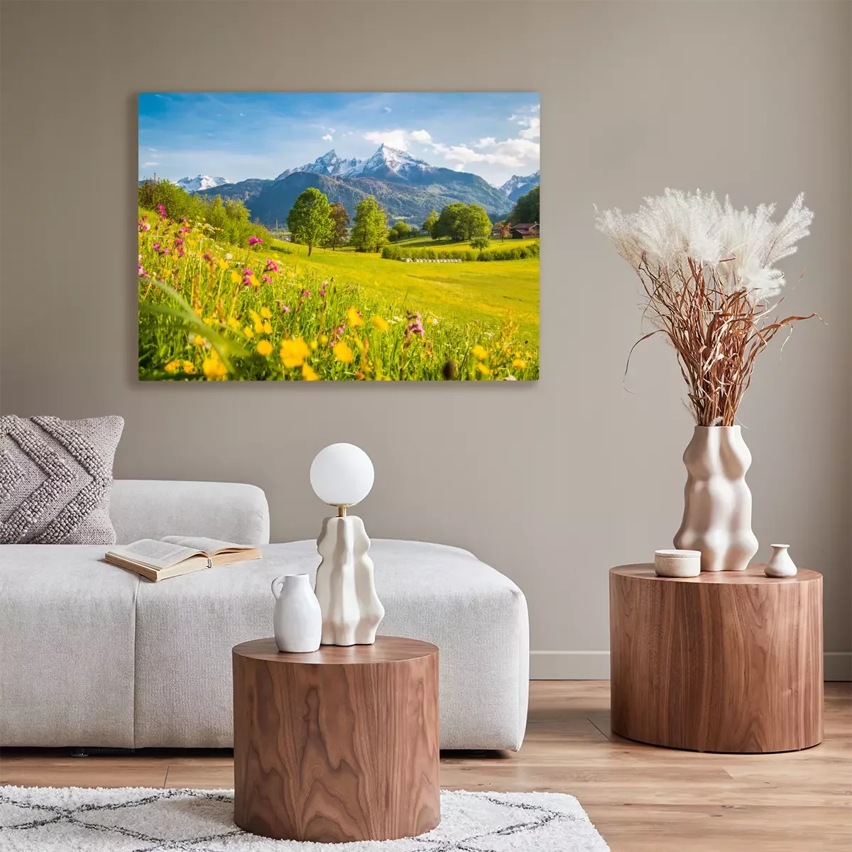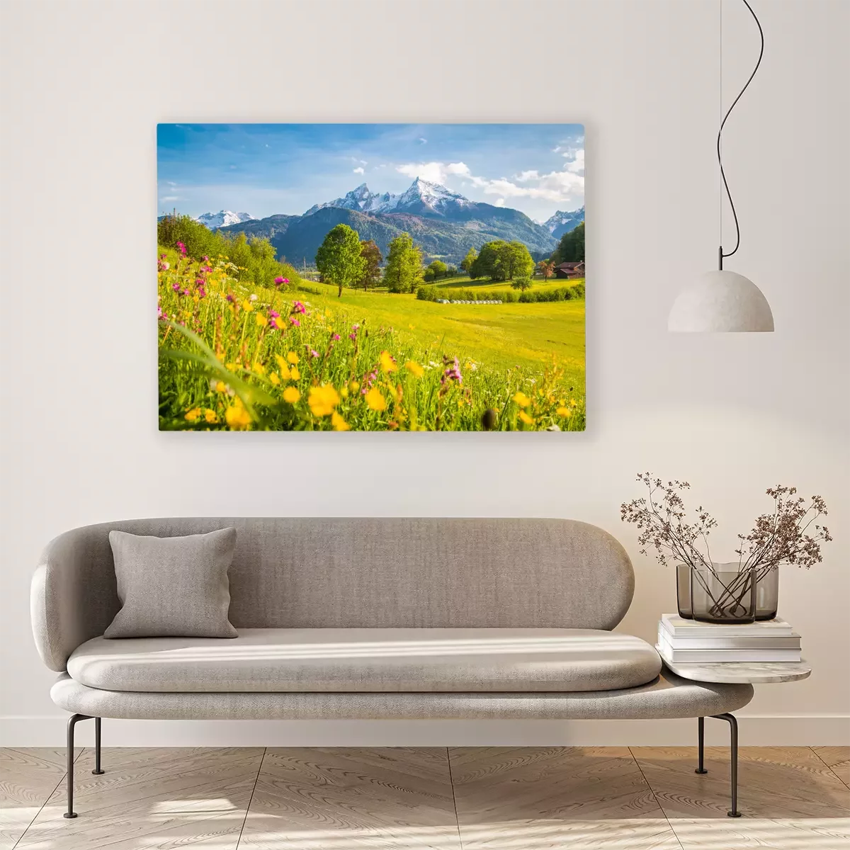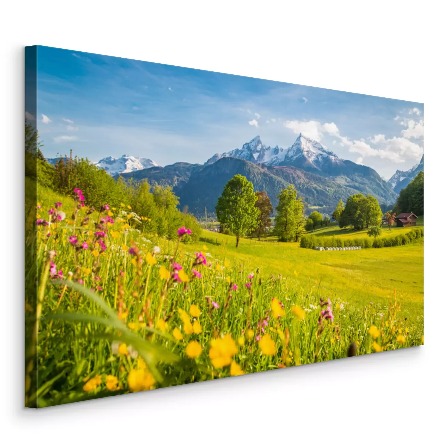 Canvas: Idyllisch berglandschap in de Alpen met bloeiende weiden in de lente
