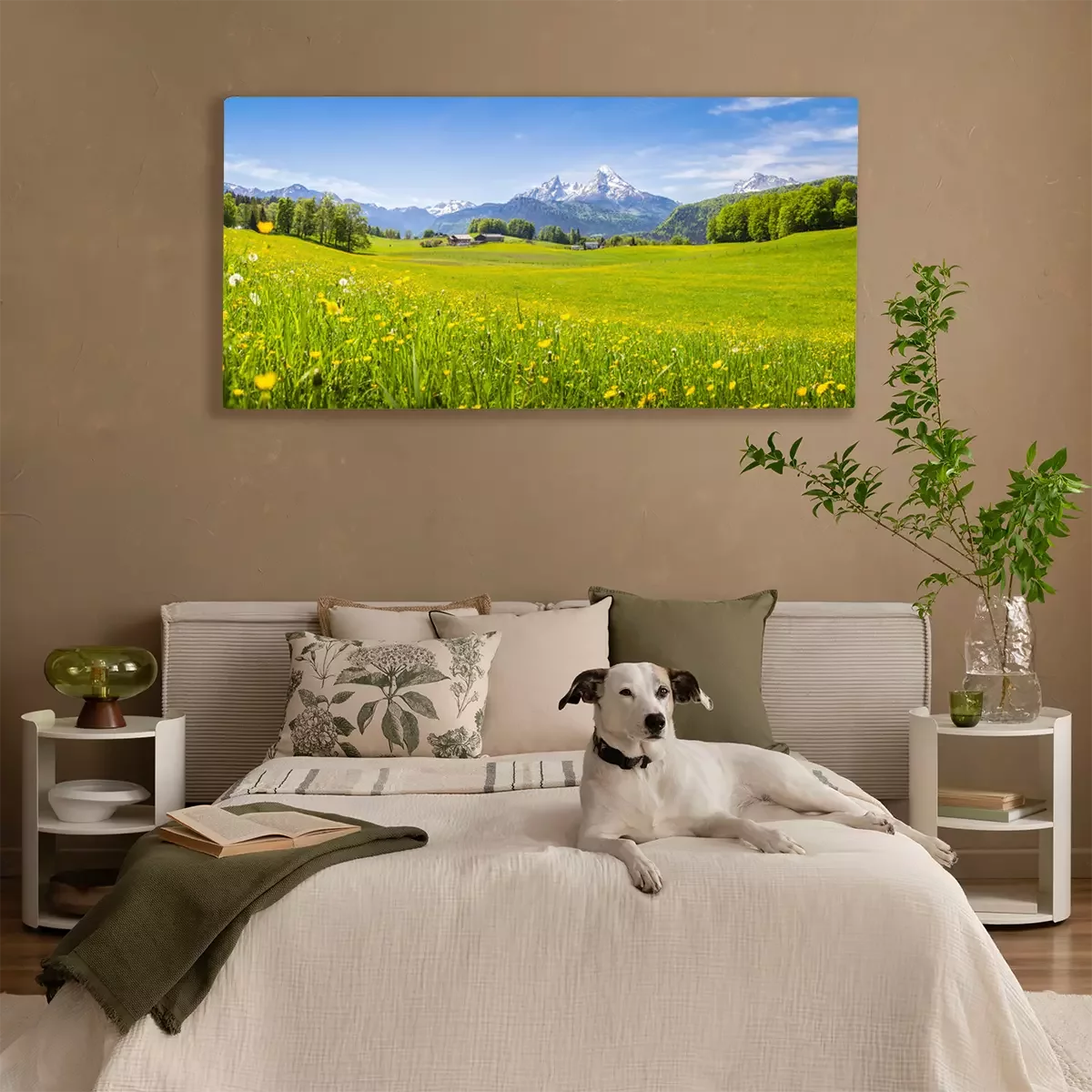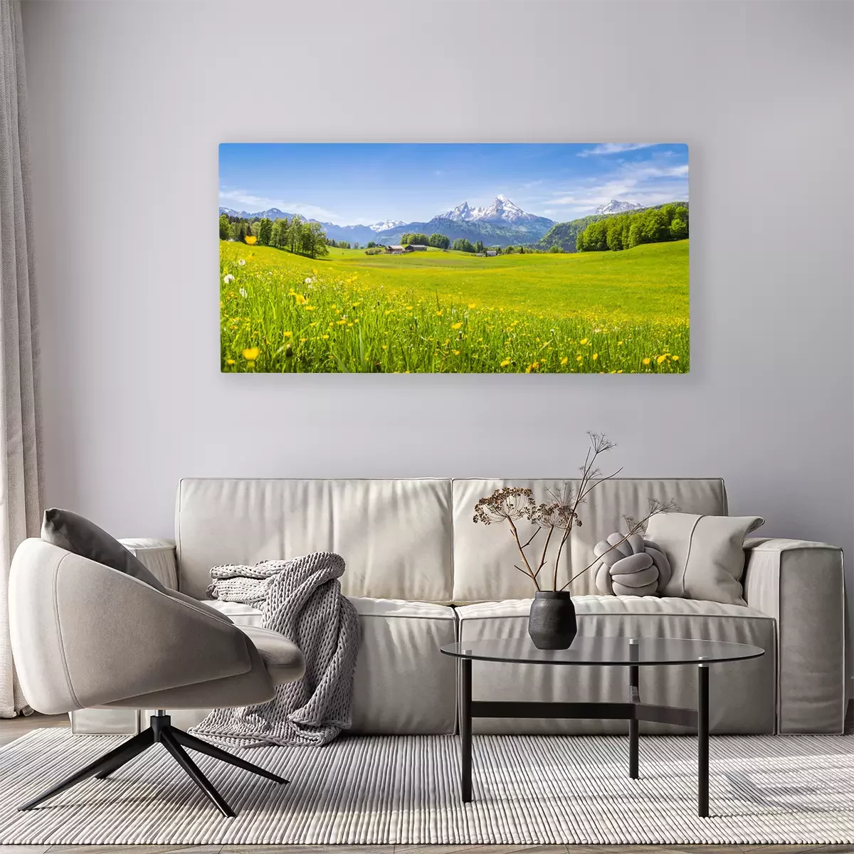 Canvas: Idyllisch landschap in de Alpen met bloeiende weiden in de zomer