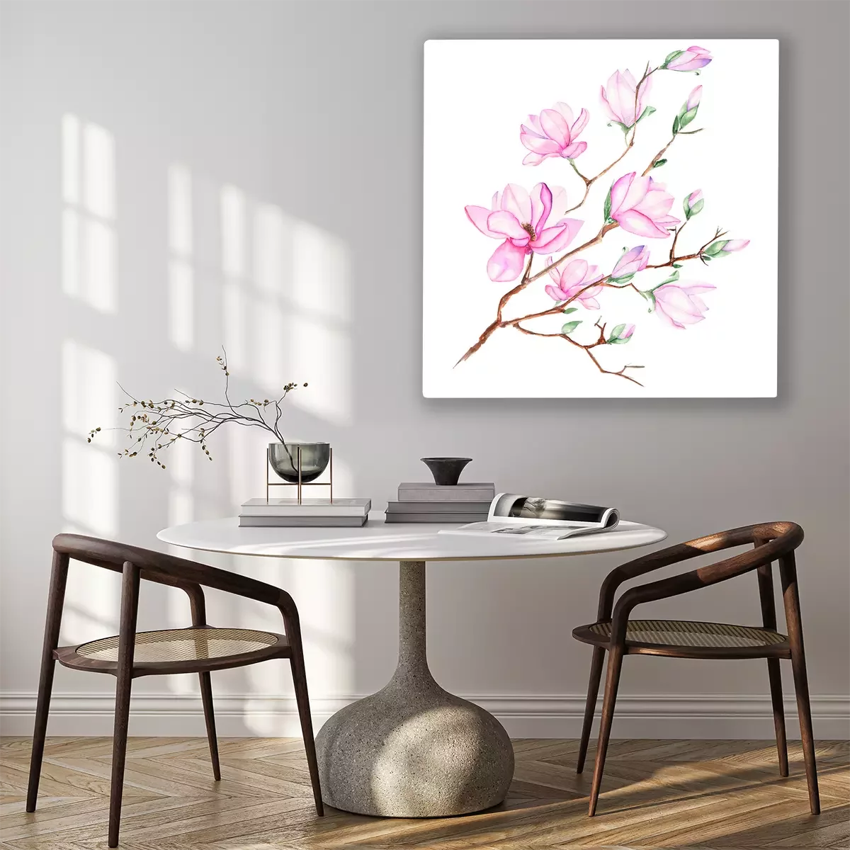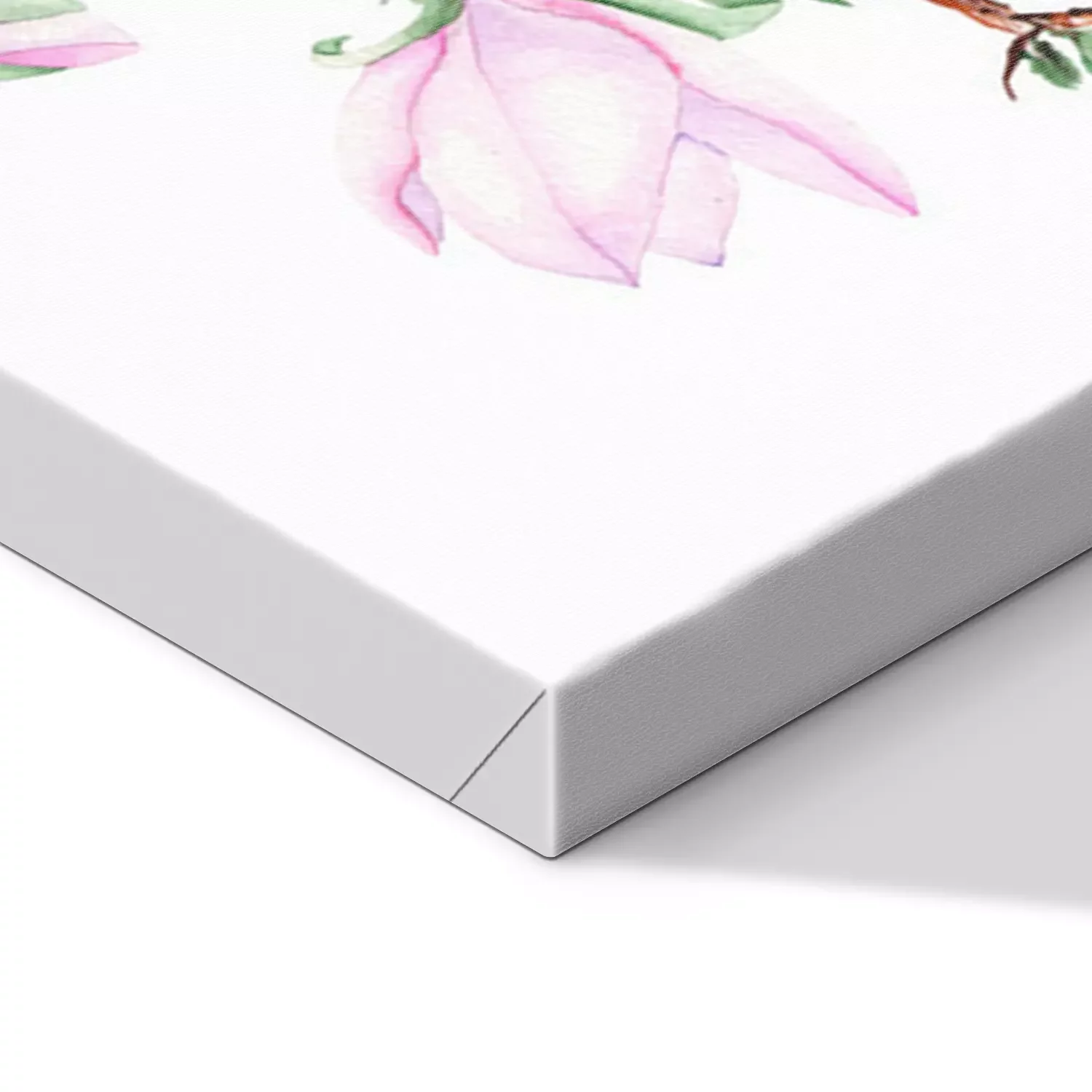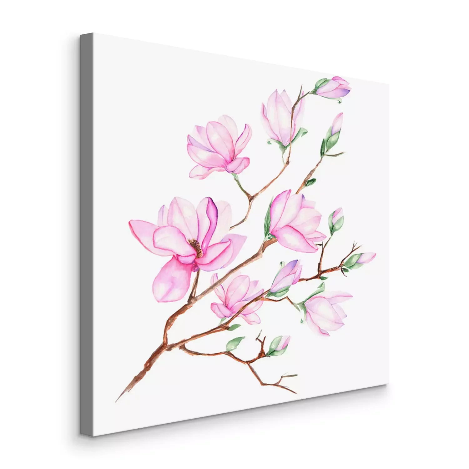 Canvas: Illustratie met magnolia tak met roze bloemen geschilderd in waterverf op een witte achtergrond