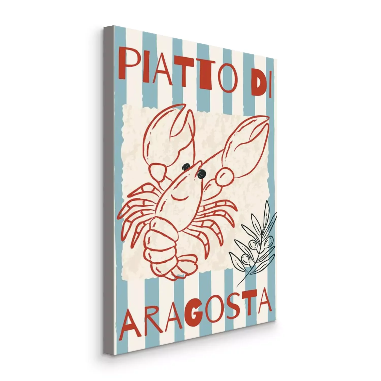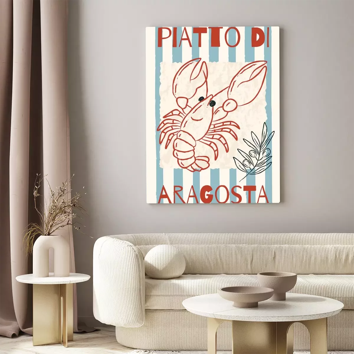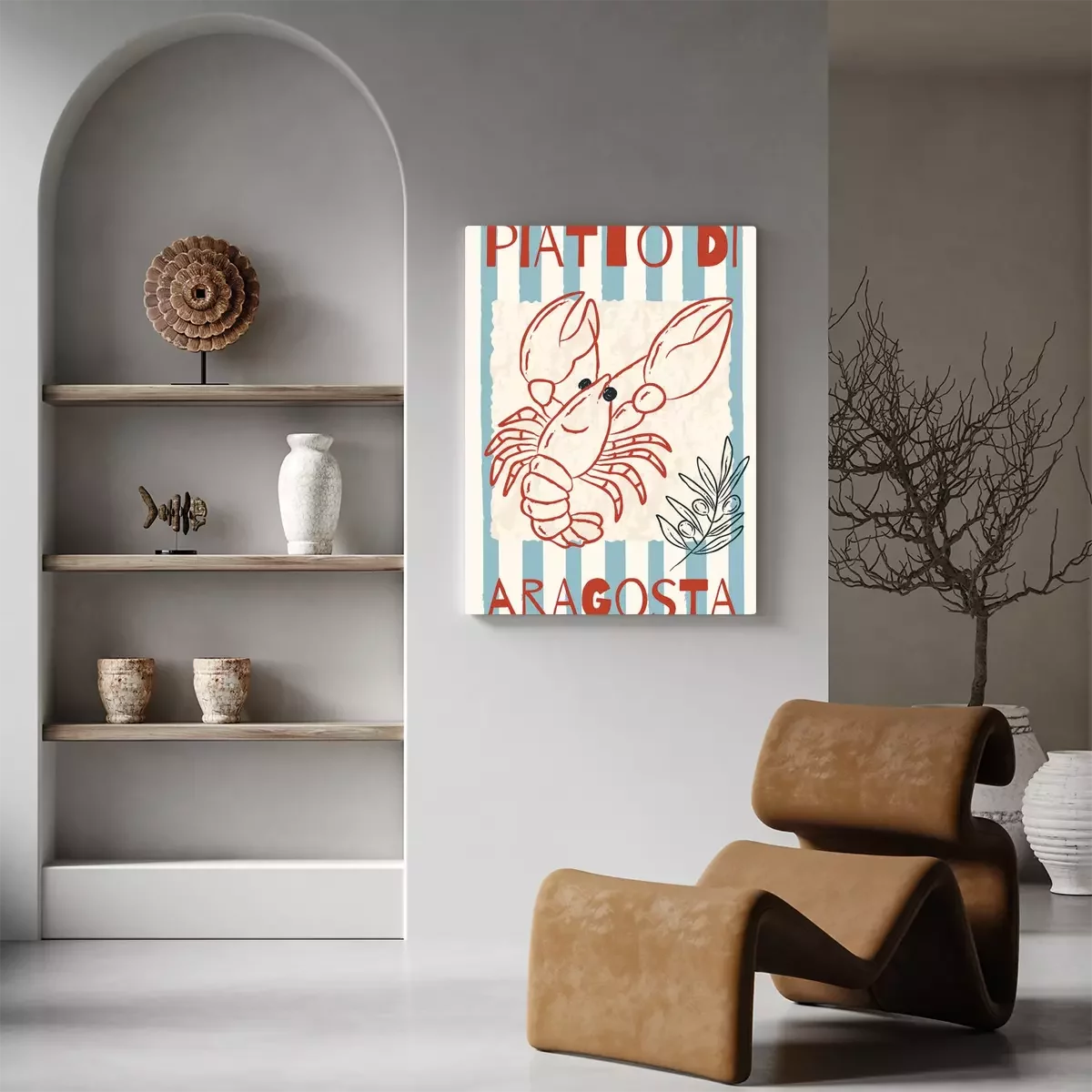 Illustratie van een kreeft met een olijftak op een gestreepte achtergrond